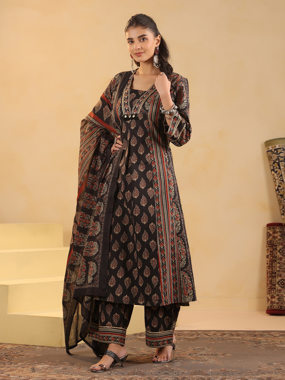 Black Cotton Silk Ajrakh Heritage Kurti Set