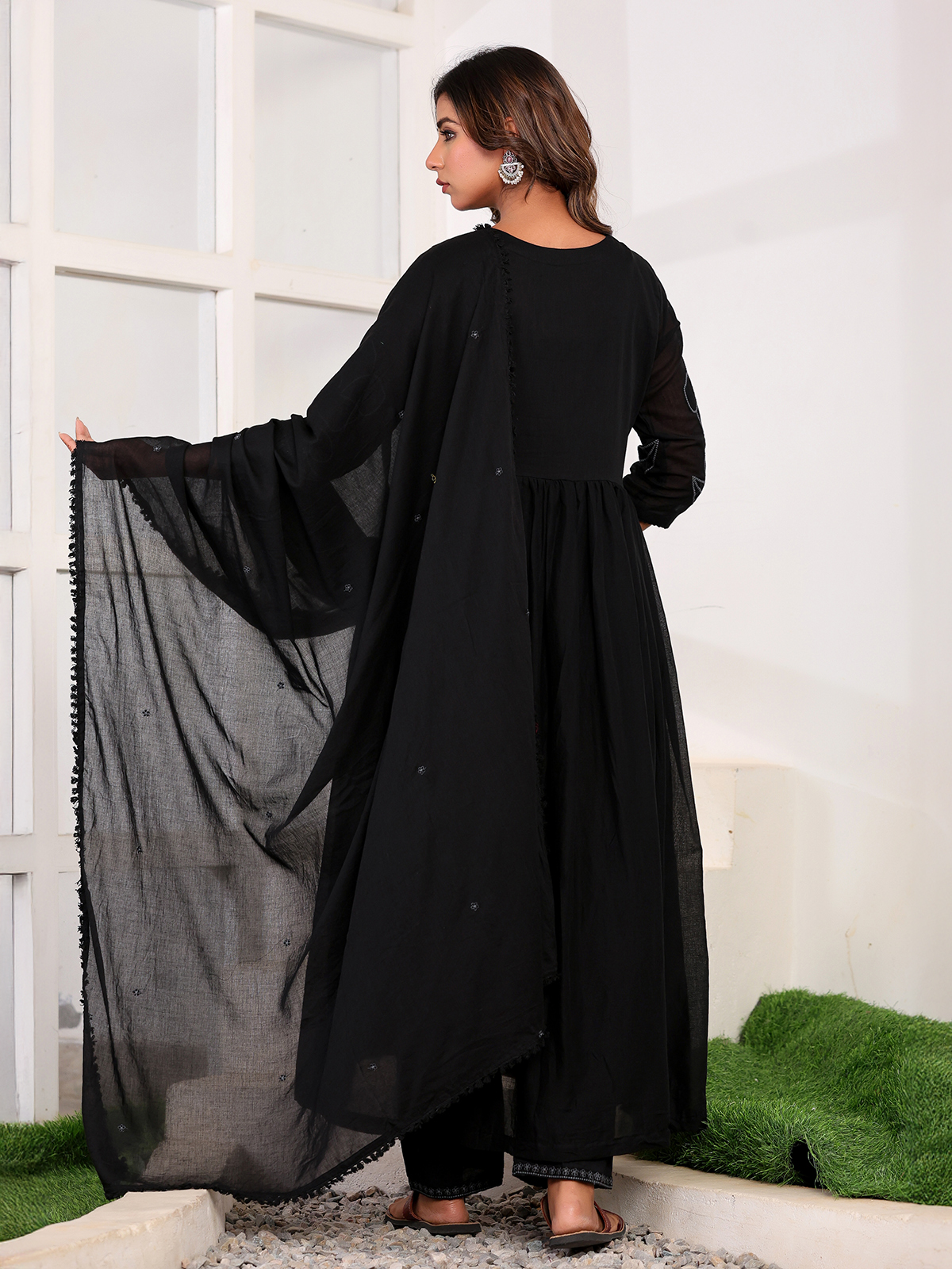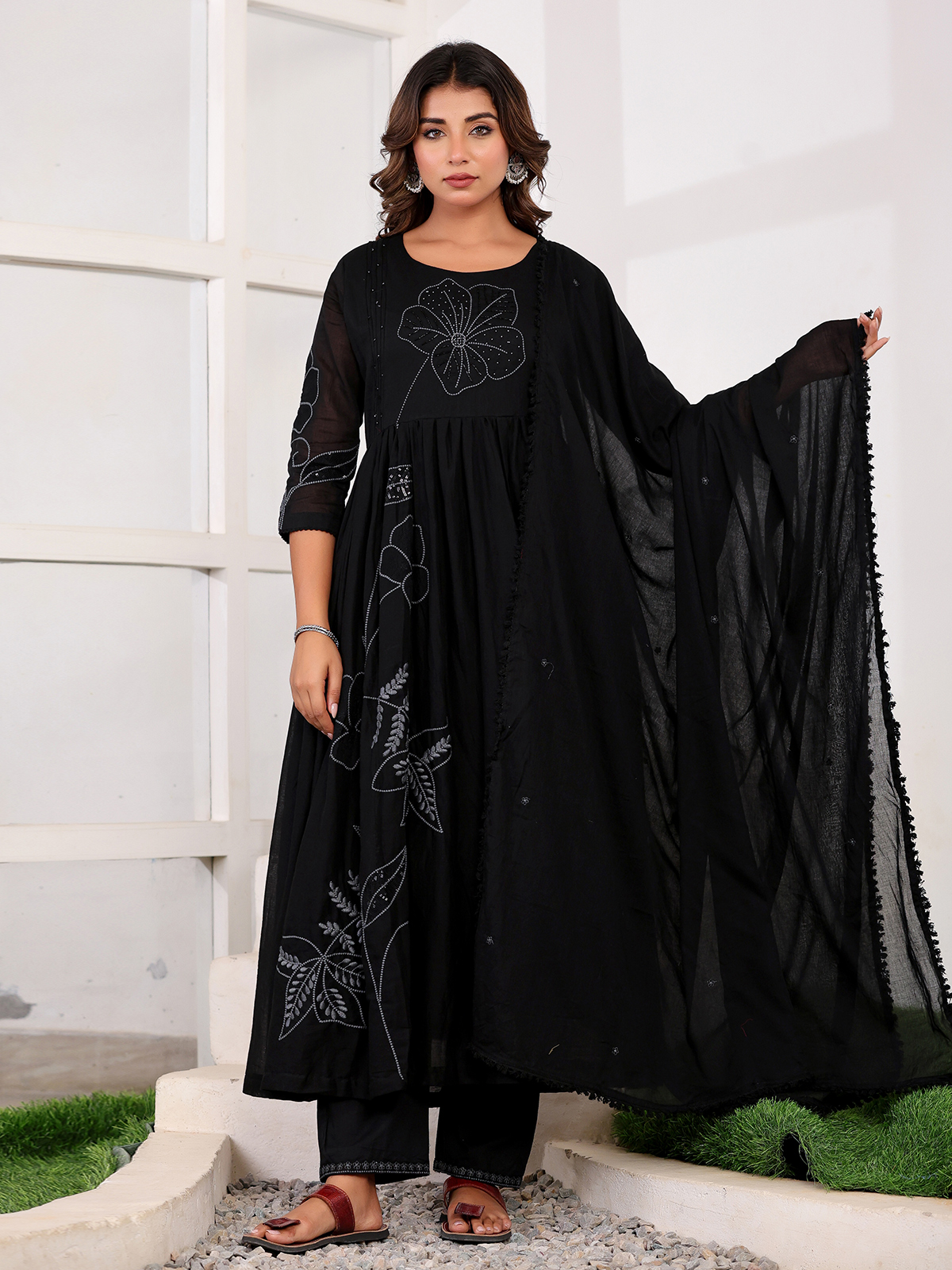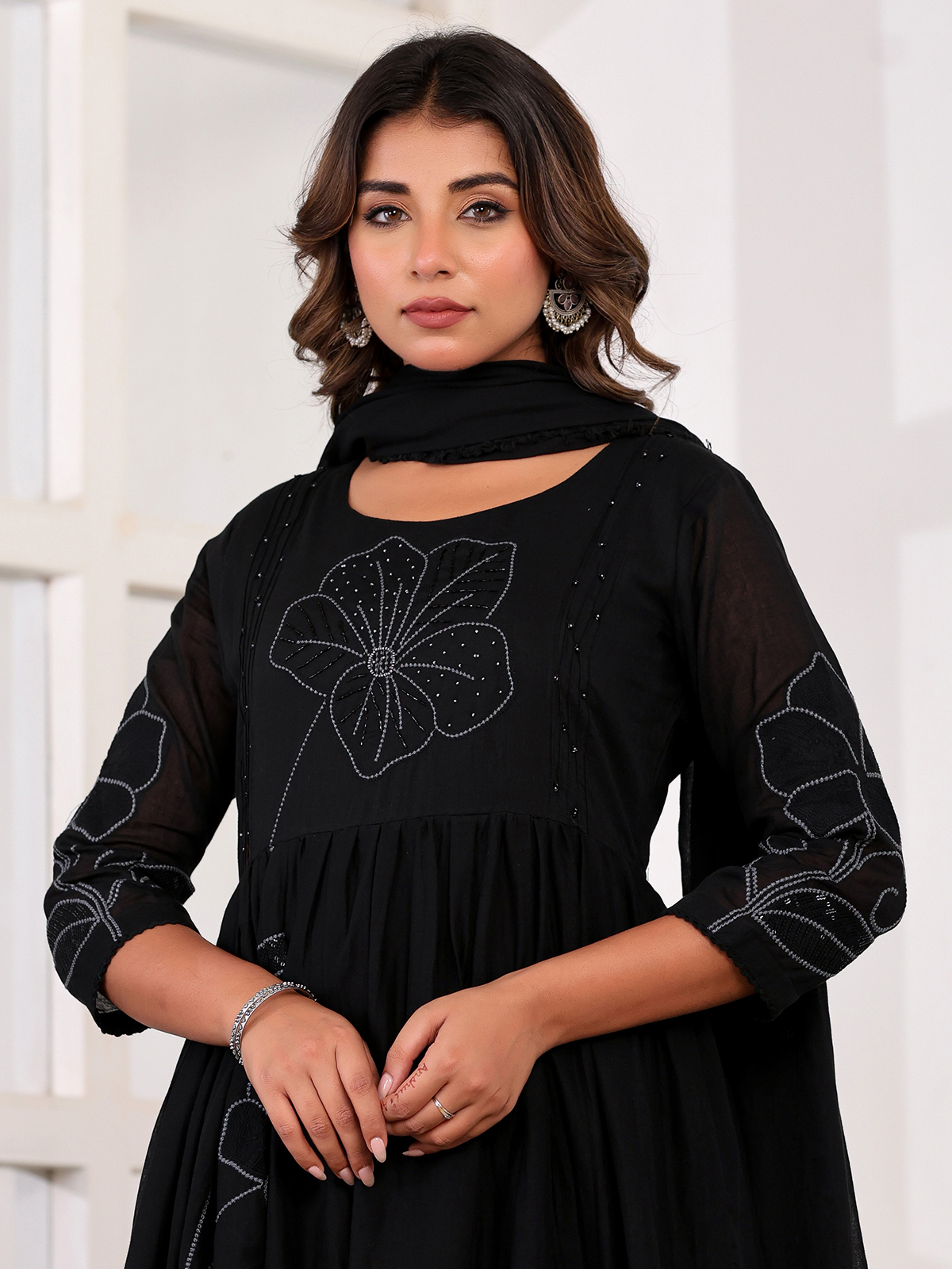 This black cotton silk kurti set features refined thread embroidery highlighted with cutdana and bead accents. The round neckline and quarter sleeves add simple elegance, while the matching pant and dupatta complete the look. Perfect for festive evenings, intimate gatherings, and traditional celebrations.