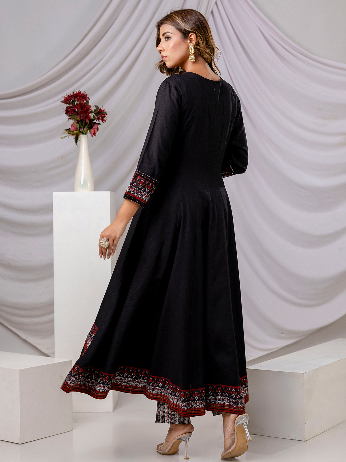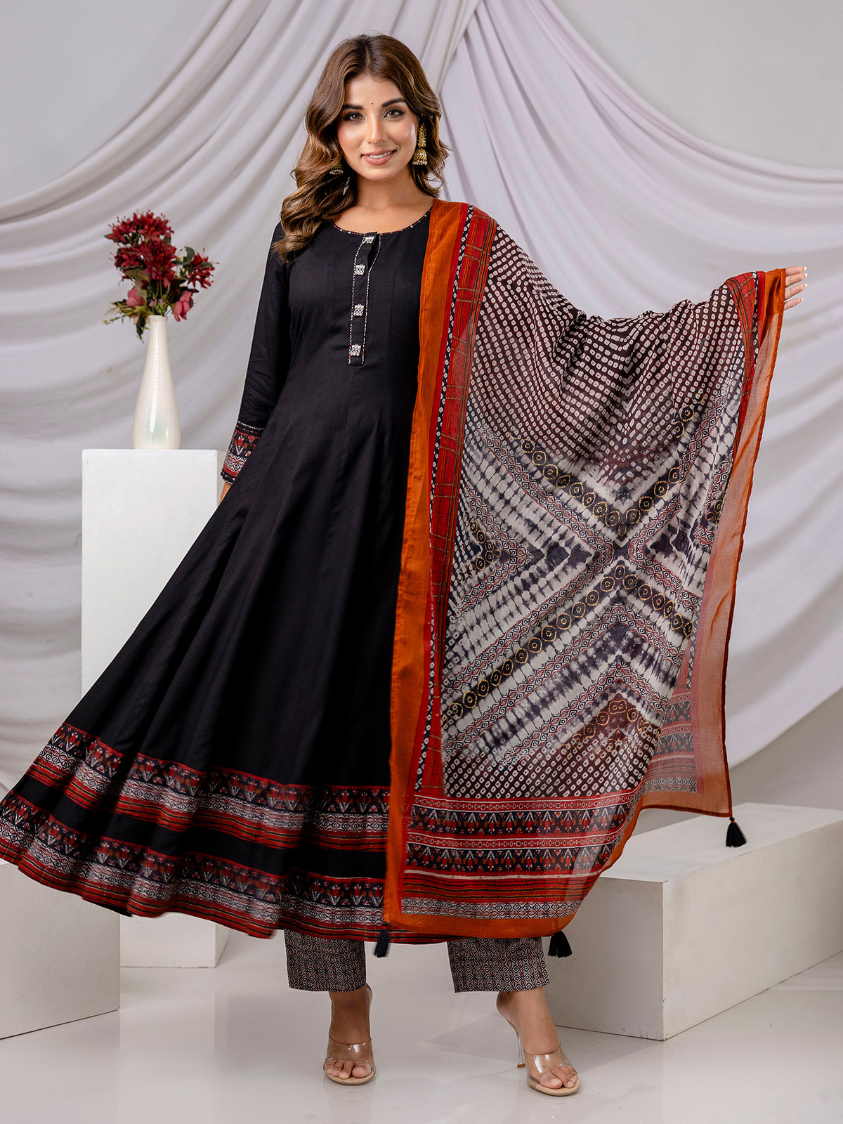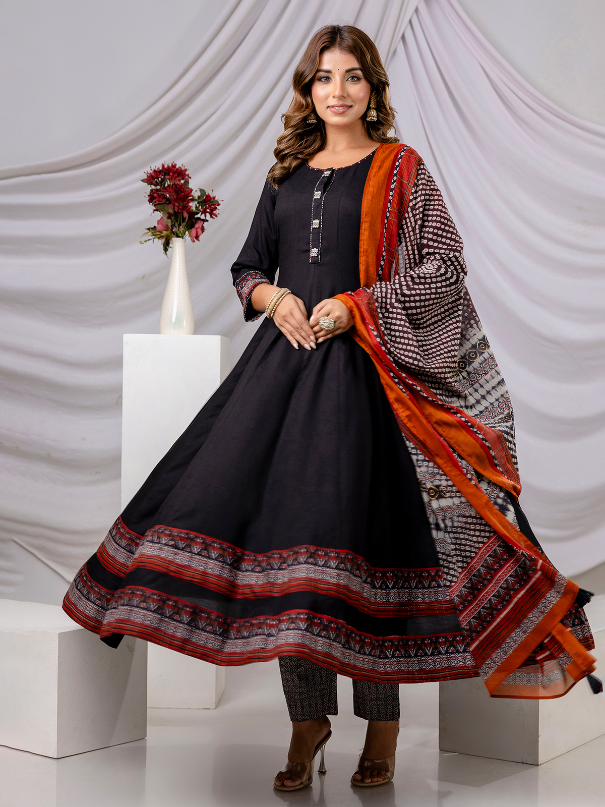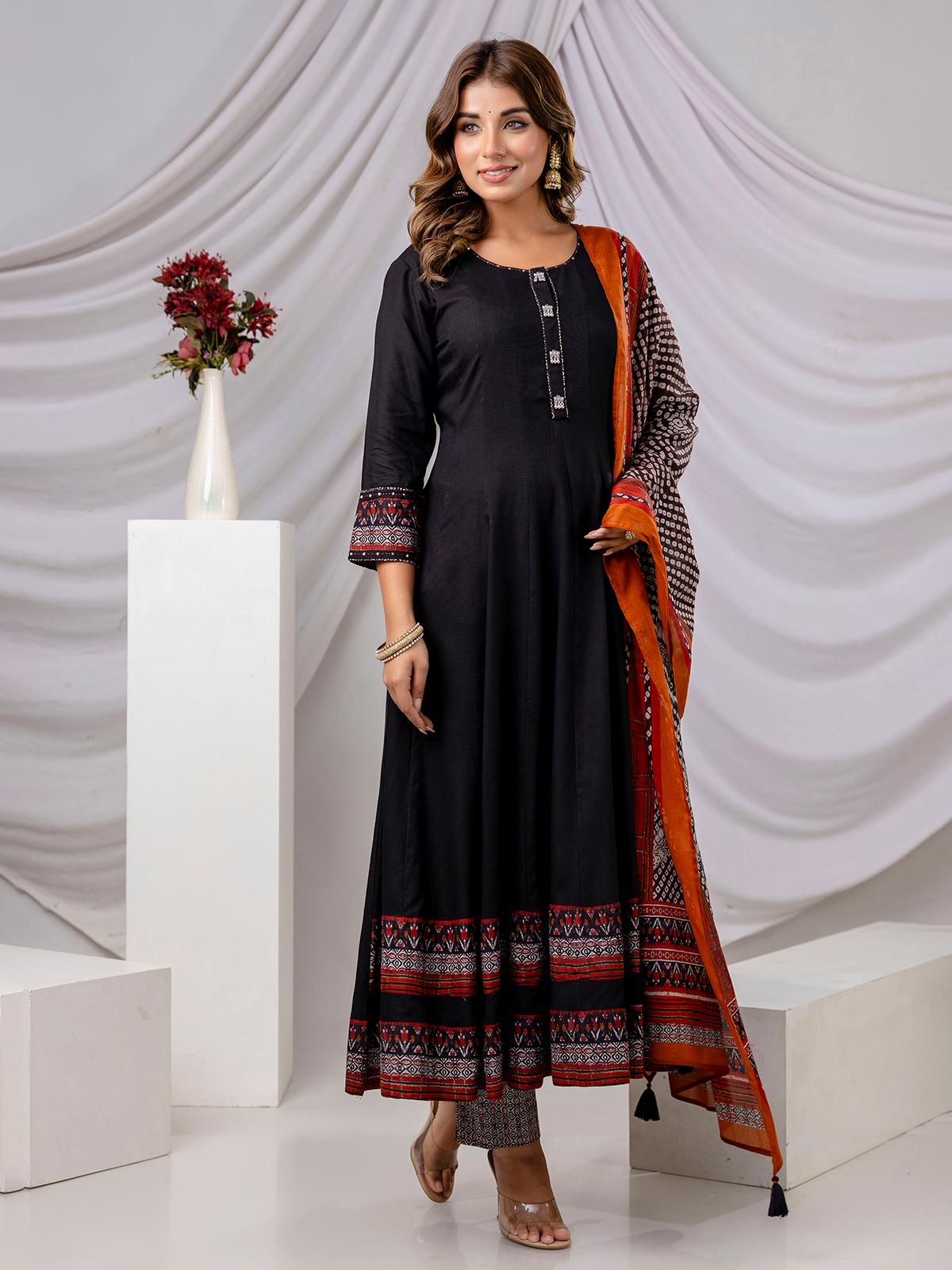 Tailored in breathable cotton silk, this black kurti set features traditional printed detailing and a classic round neckline. The quarter sleeves, matching pant, and dupatta make it a graceful yet effortless choice for your festive wardrobe.