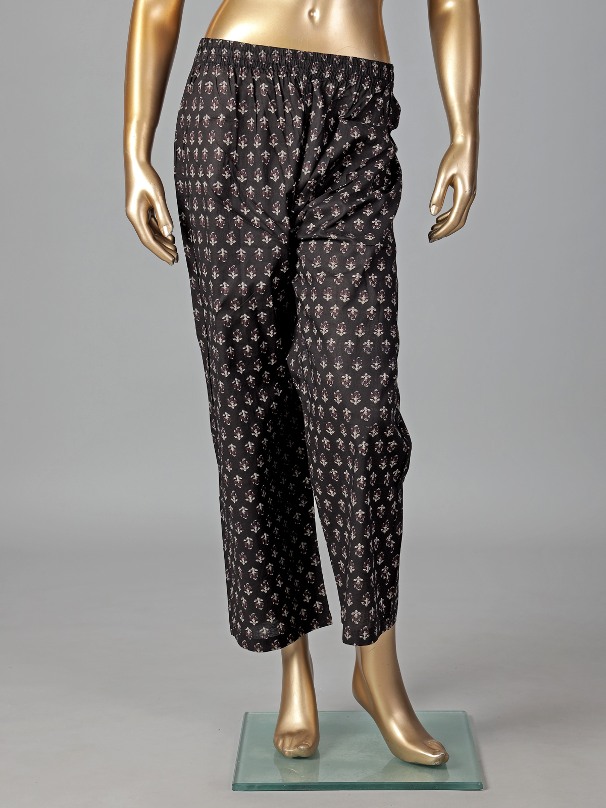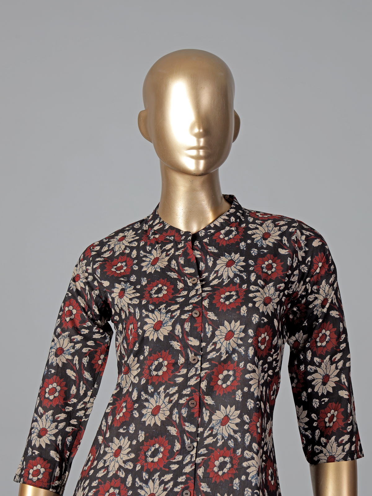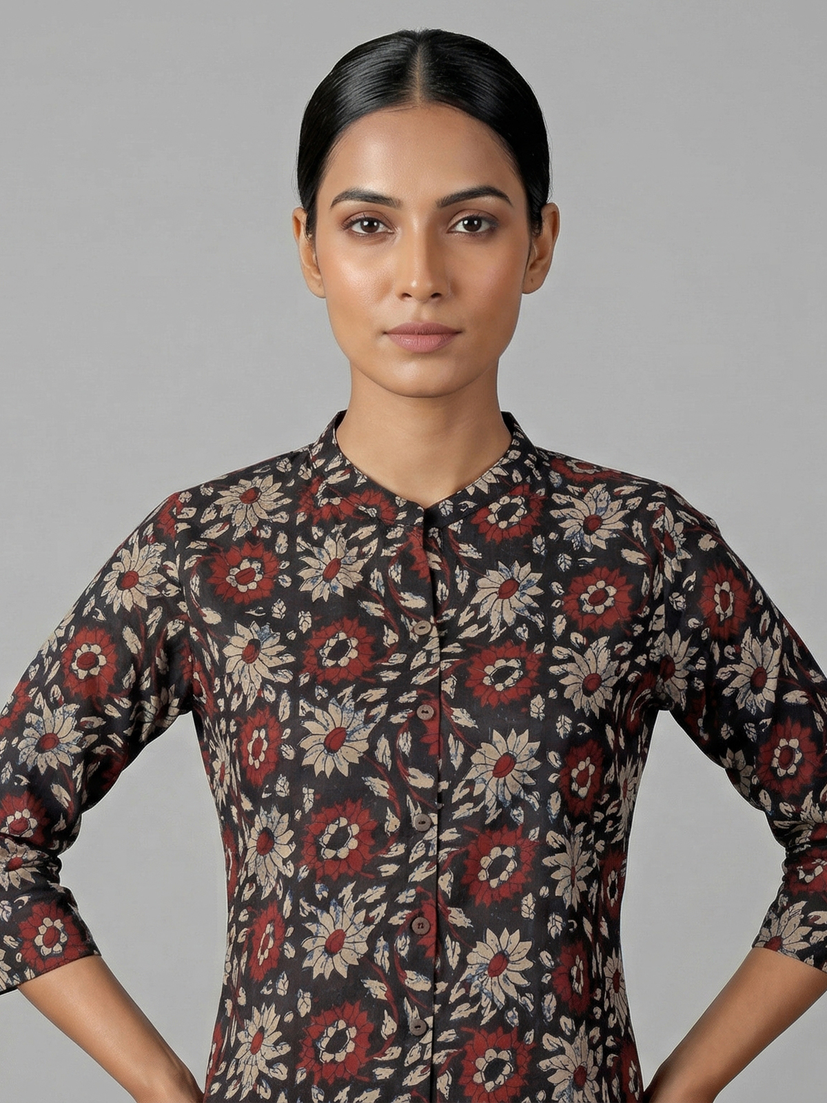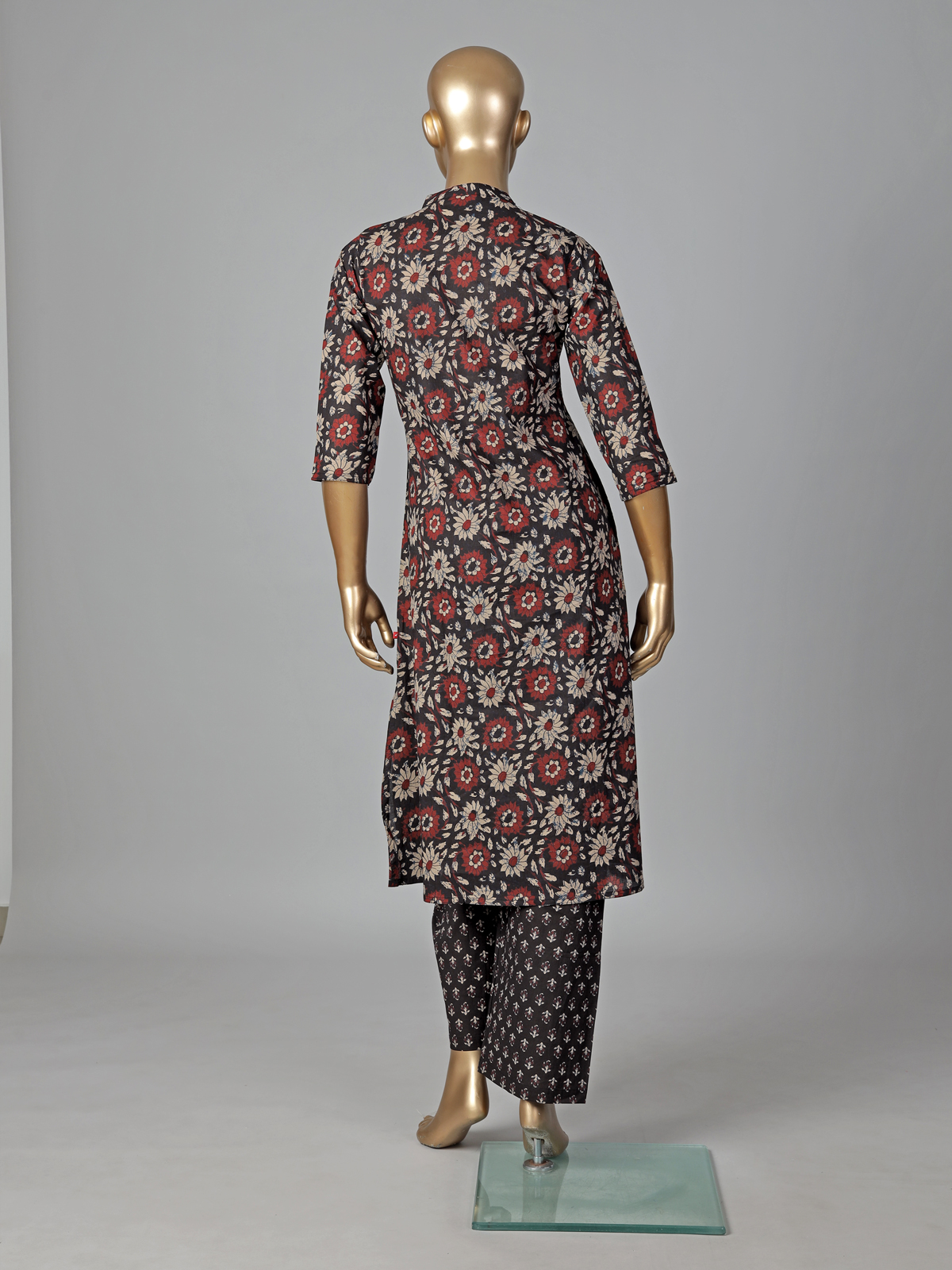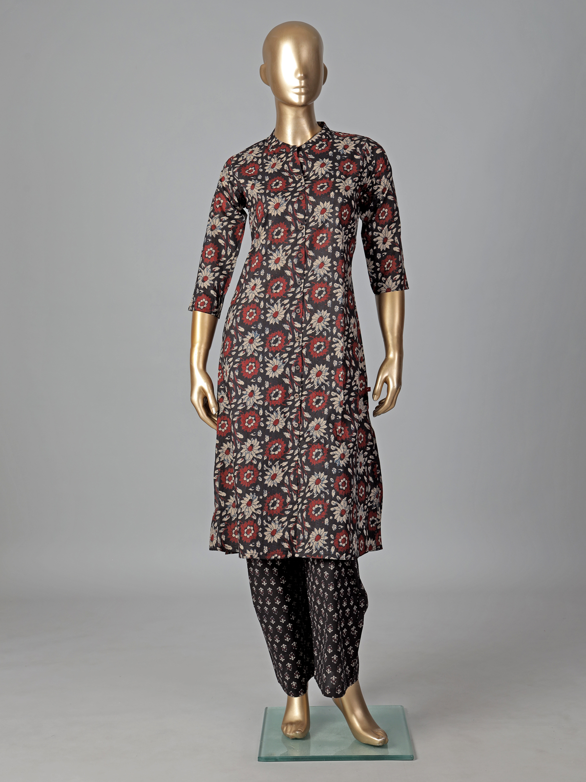 Classic black tones enhance this cotton silk kurti set adorned with floral prints. Designed with a stand collar and quarter sleeves, it offers a structured yet comfortable fit. Paired with pants, it is perfect for casual ethnic styling.