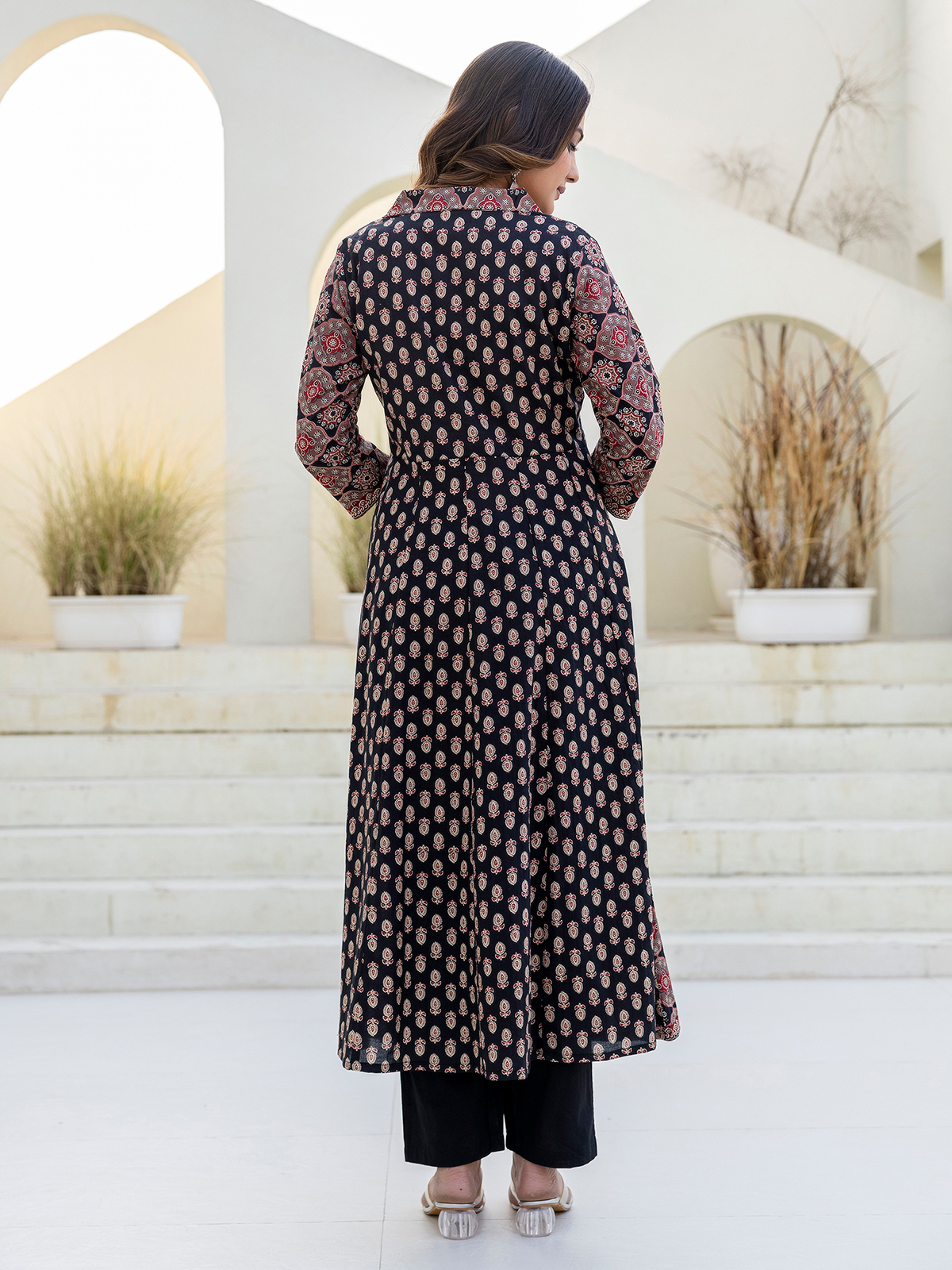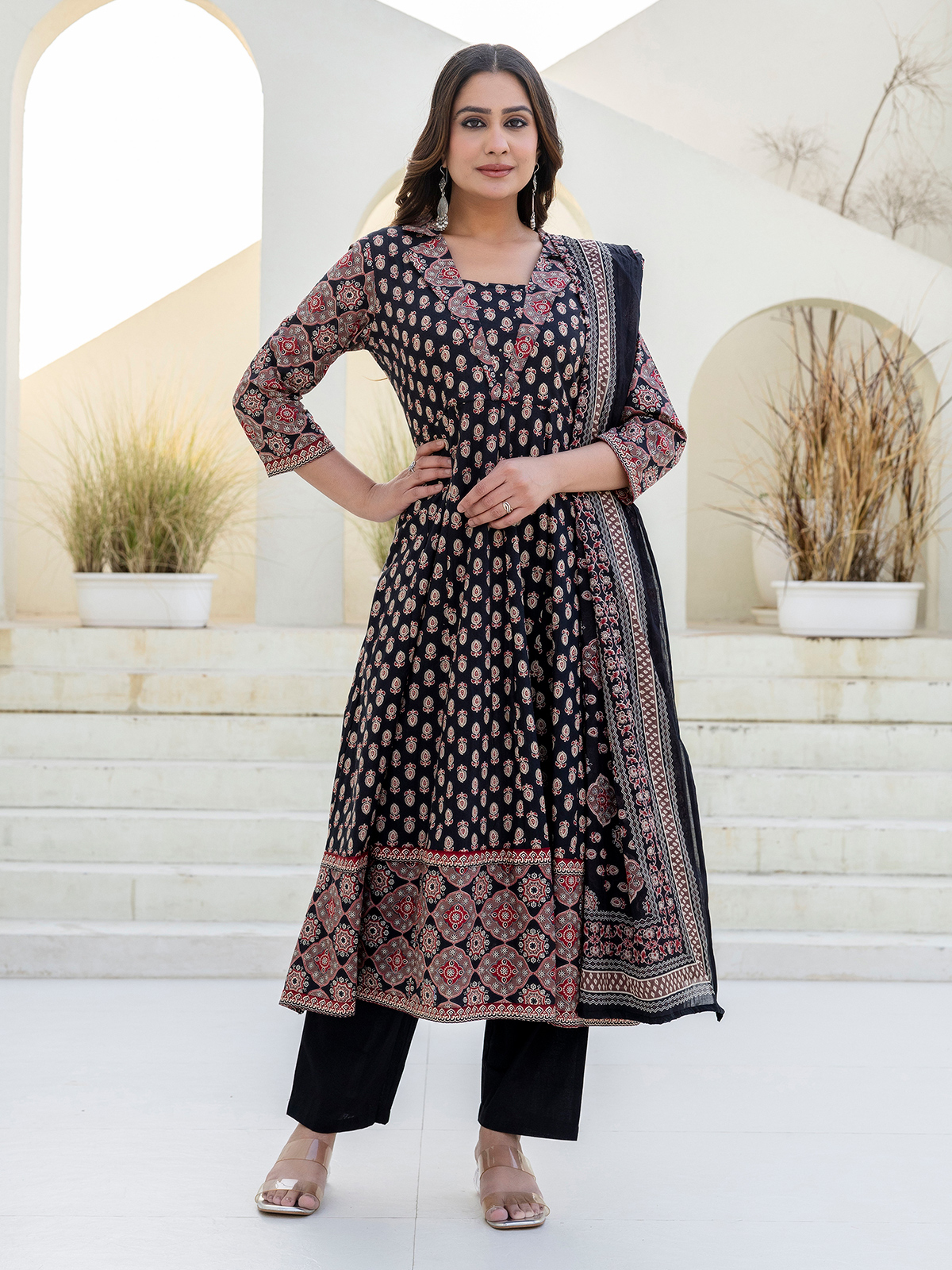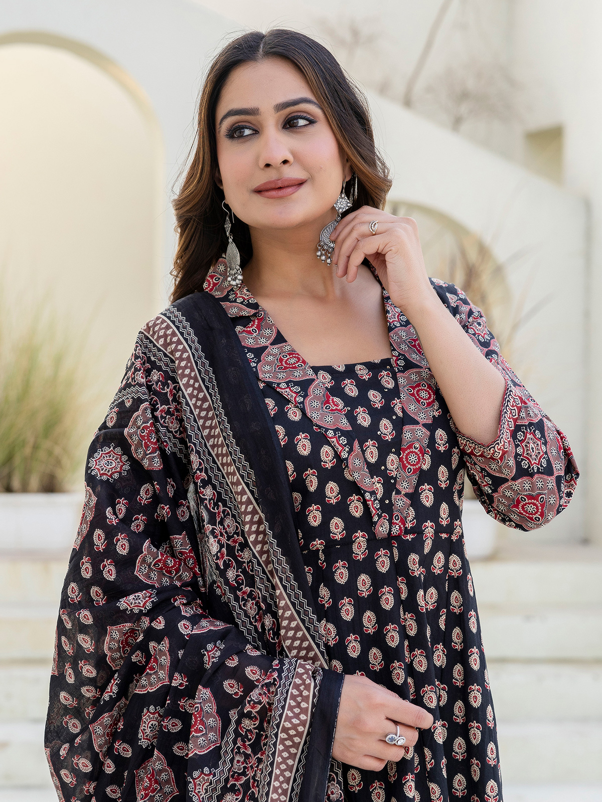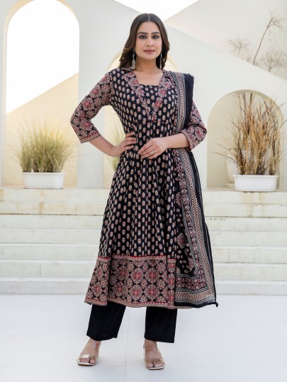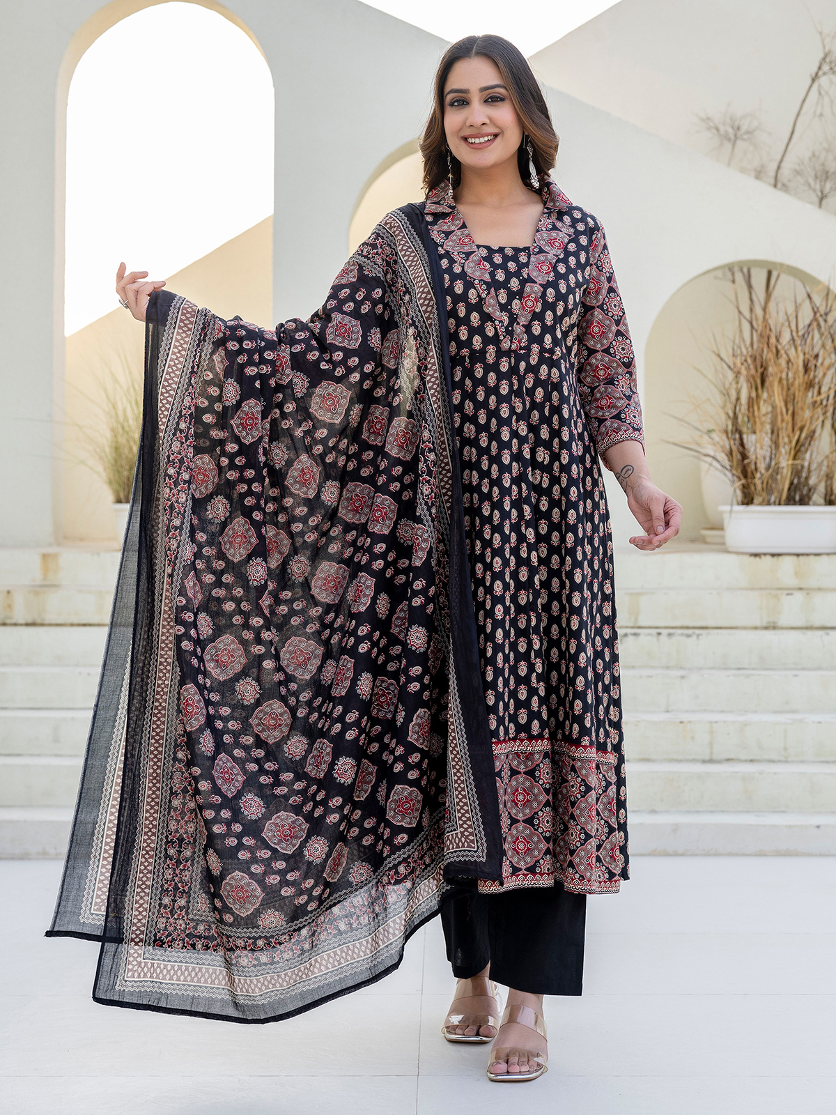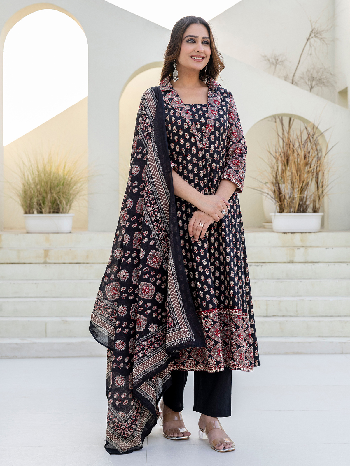 Elevate your everyday ethnic style with this black cotton silk kurti set, detailed with elegant prints and a structured collar neckline. Designed with quarter sleeves, it is paired with a comfortable pant and matching dupatta, making it perfect for festive moments and casual celebrations alike.