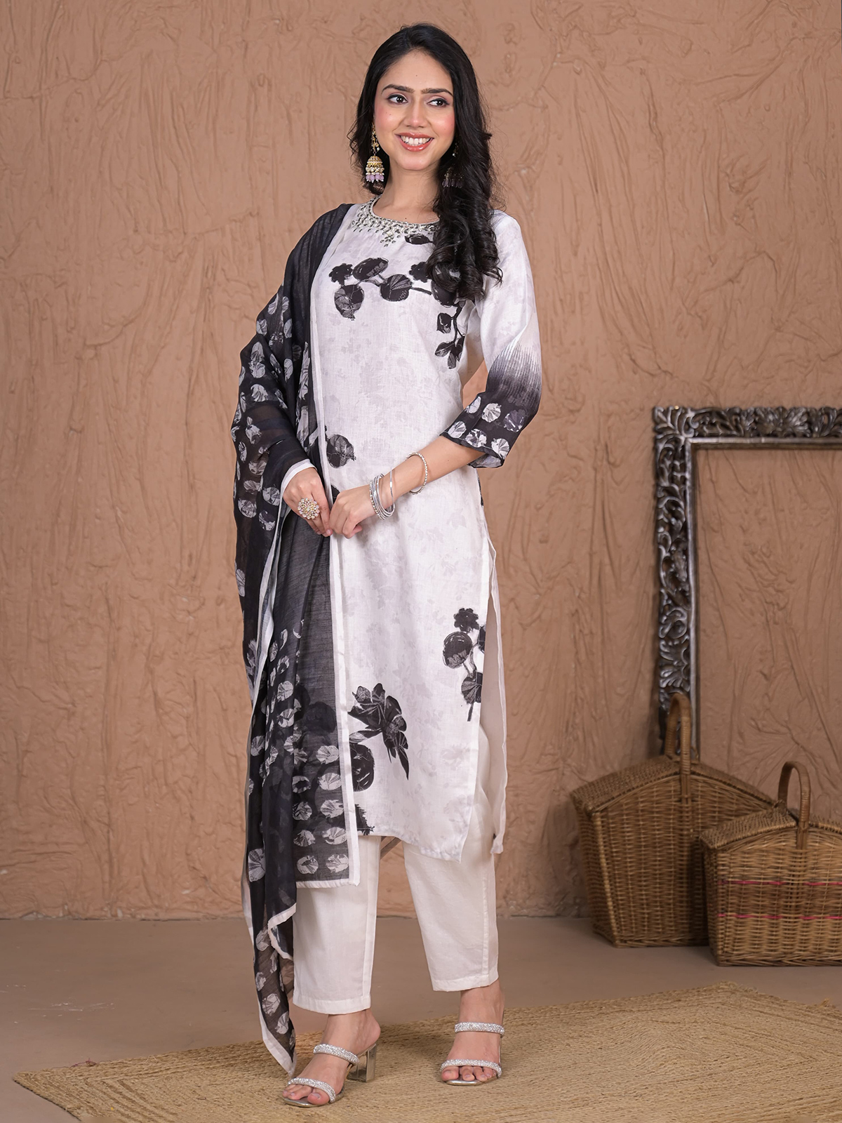 Elevate your style with this black printed cotton silk kurti set, adorned with intricate cutdana, aabla, and thread work. Designed with a round neck and quarter sleeves, it promises both comfort and elegance for any occasion. Comes complete with a matching dupatta.