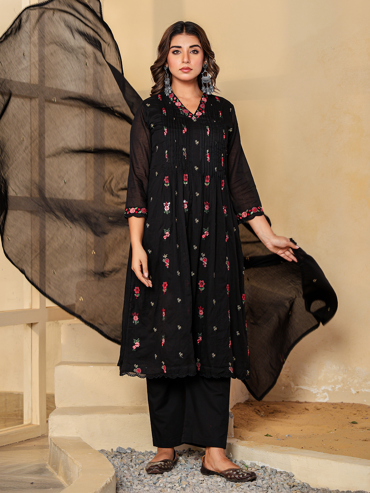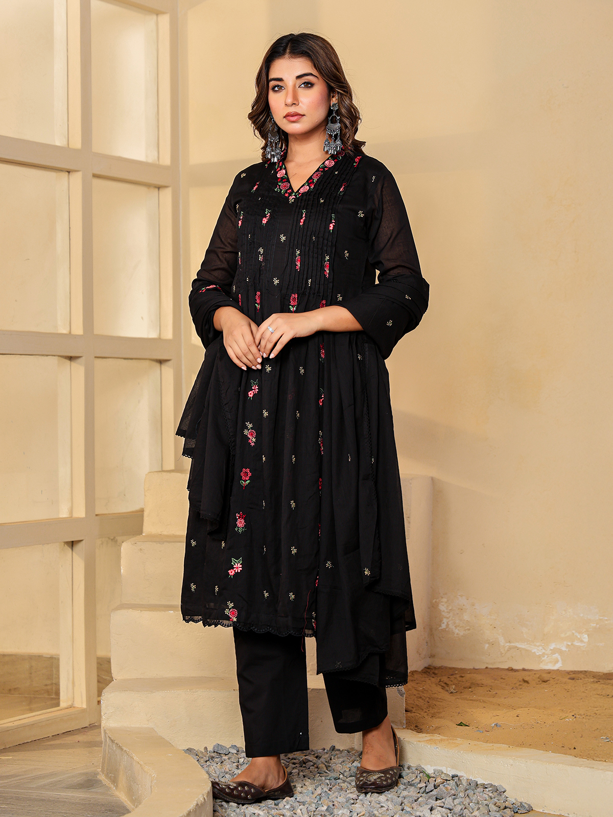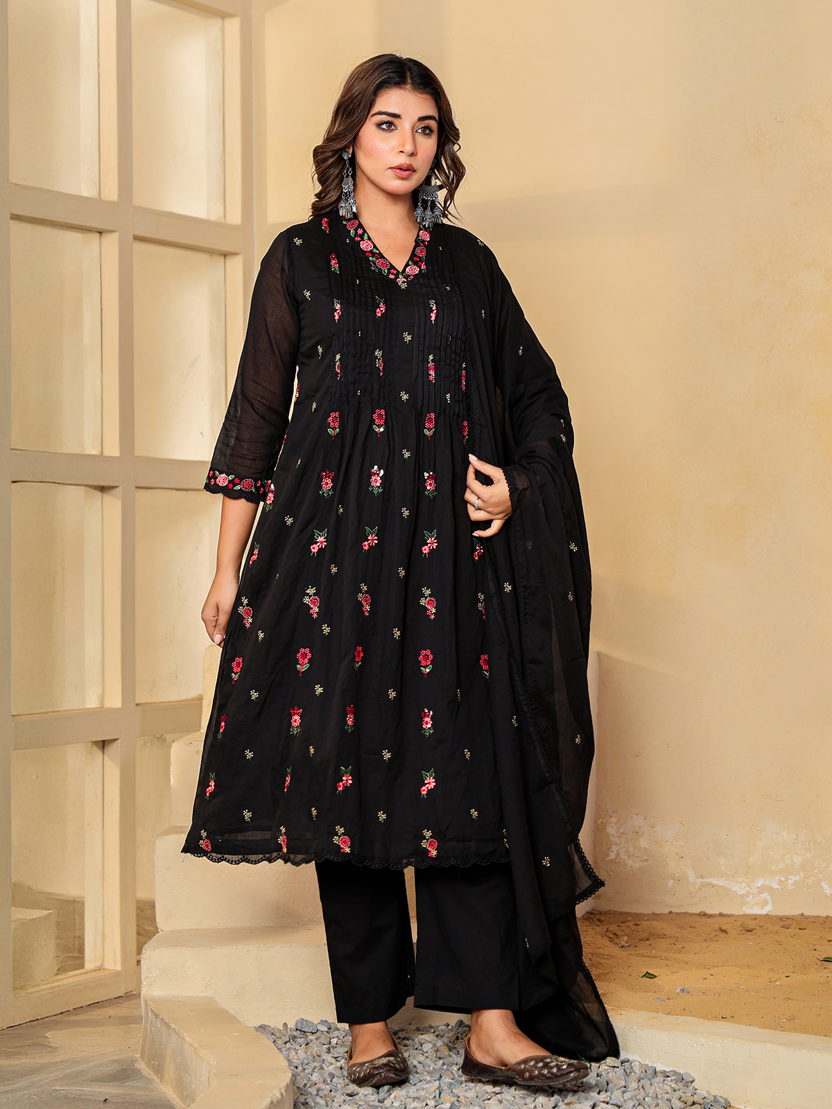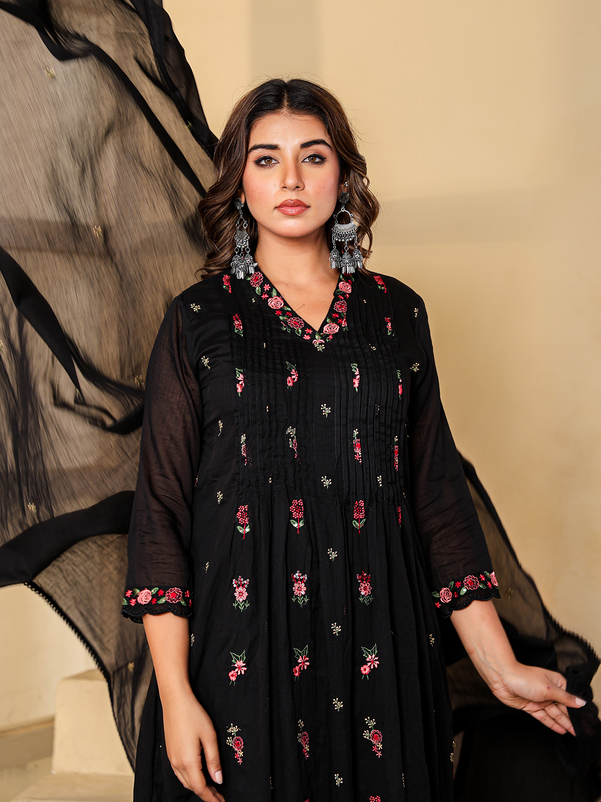 Bold black cotton silk kurti set radiates refined sophistication for festive occasions. Intricate embroidery and sequins dance along the V-neckline and quarter sleeves, casting subtle luminescence. Styled with sleek pants and a matching dupatta, it captures a harmonious blend of modern poise and timeless charm.