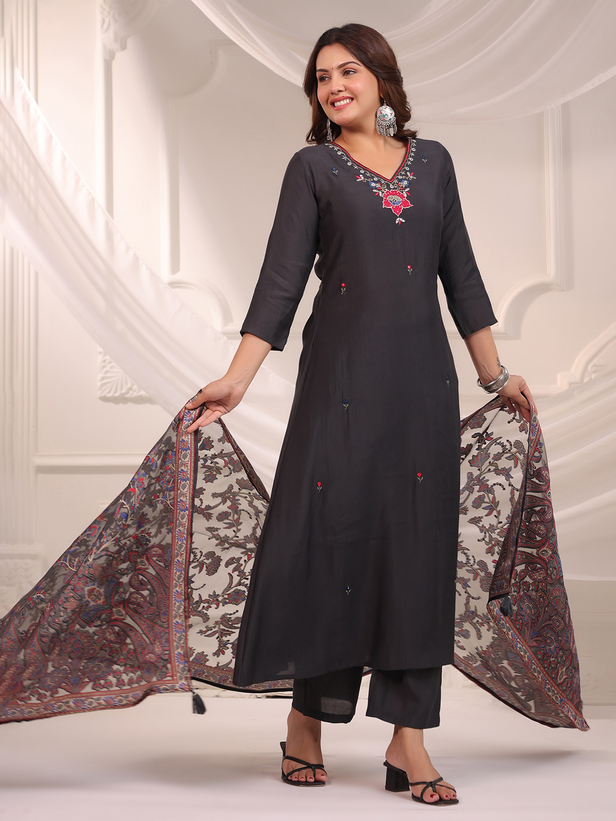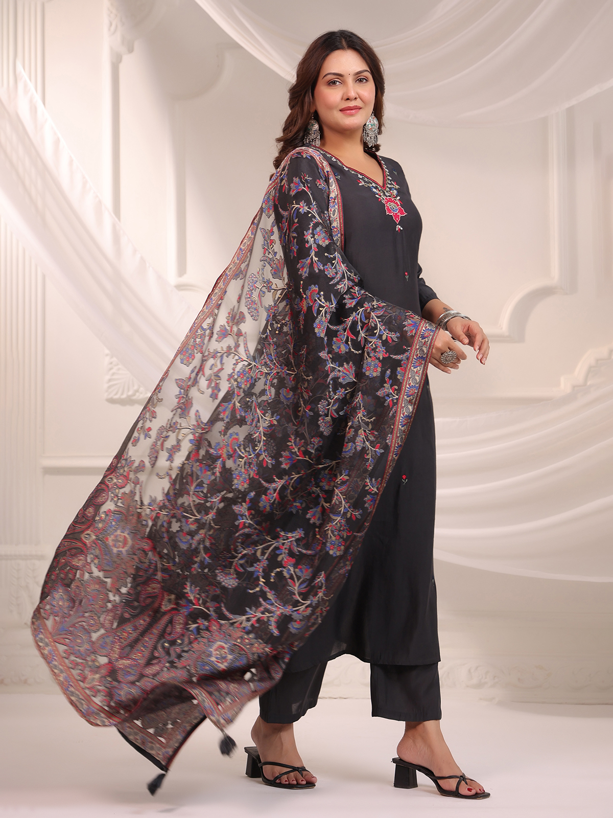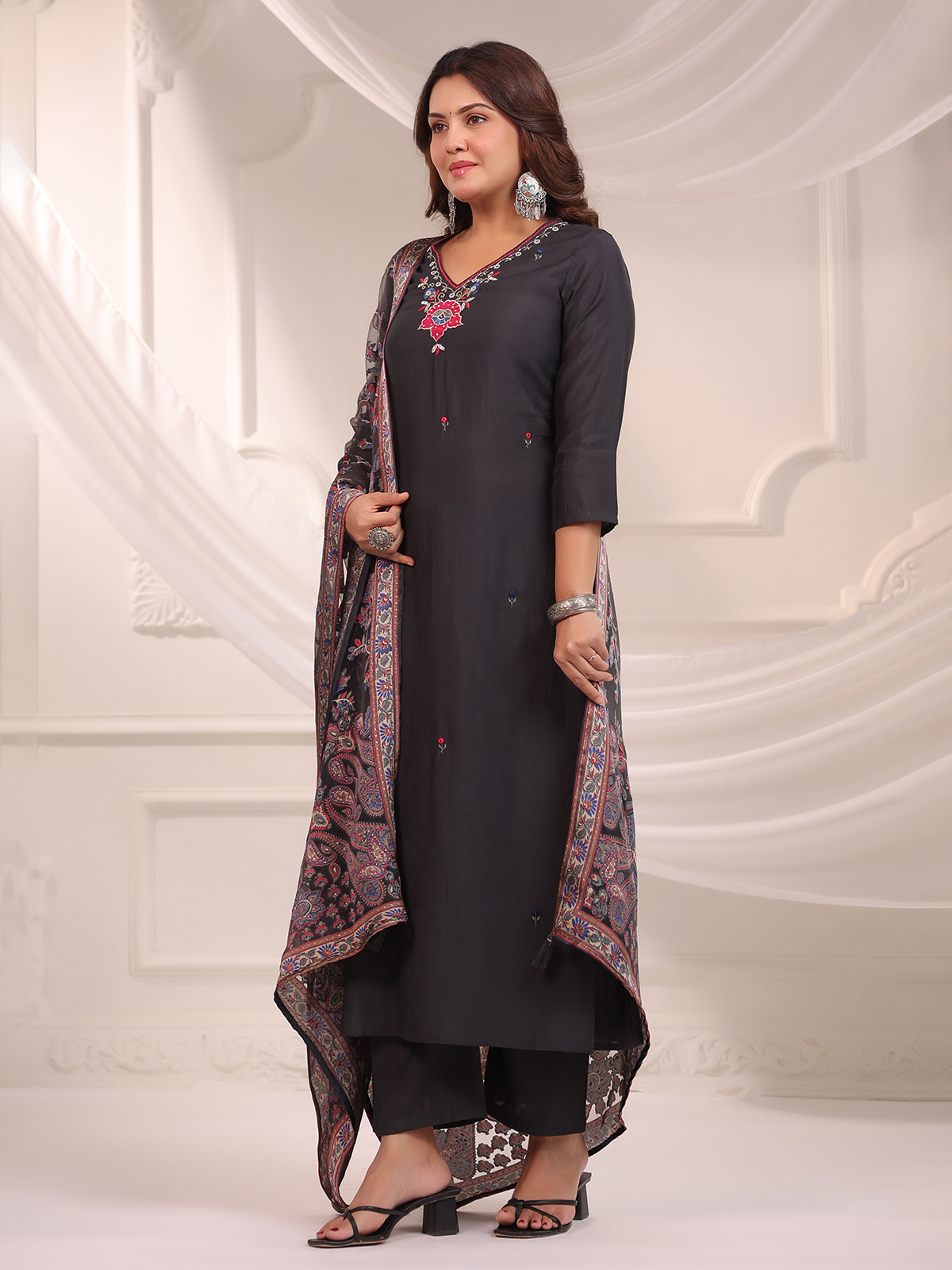 Radiate timeless elegance with this sophisticated black cotton silk kurti set designed for festive occasions. The kurti features beautiful resham, sequin, mirror, and cutdana embellishments that enhance its rich ethnic charm. Styled with a V-neckline and quarter sleeves, it is paired with a pant and a coordinating printed dupatta, making it ideal for festive celebrations and Eid occasions.