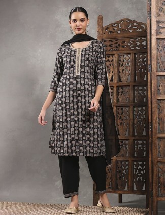 Make a striking impression in this black printed cotton silk kurti set, styled with a round neckline and quarter sleeves for timeless appeal. Paired with comfortable pants and a dupatta, it’s perfect for festivals, family celebrations, and cultural gatherings where elegance meets effortless style.