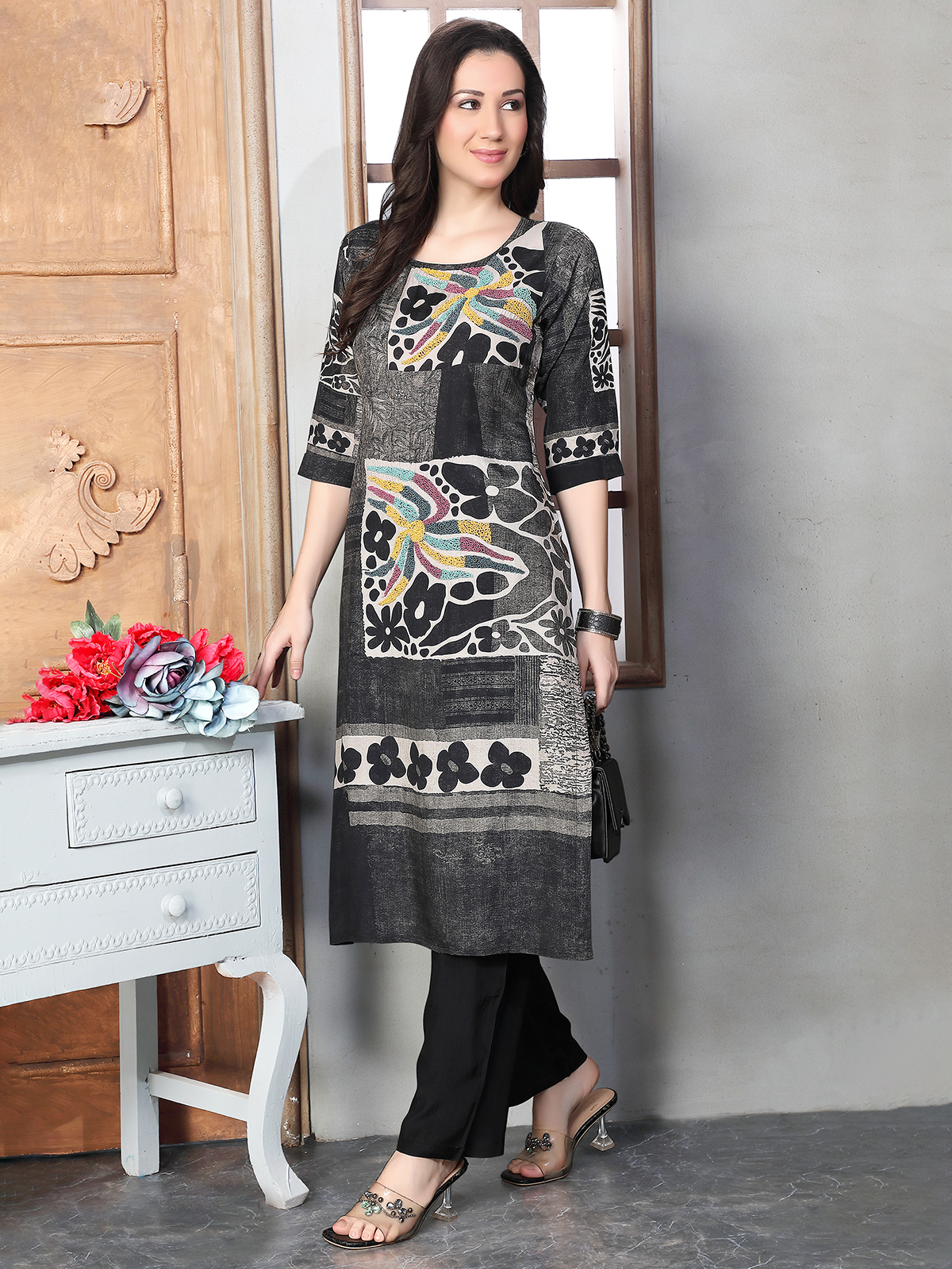 Black Printed Quarter Sleeves Silk Casual Kurti Set