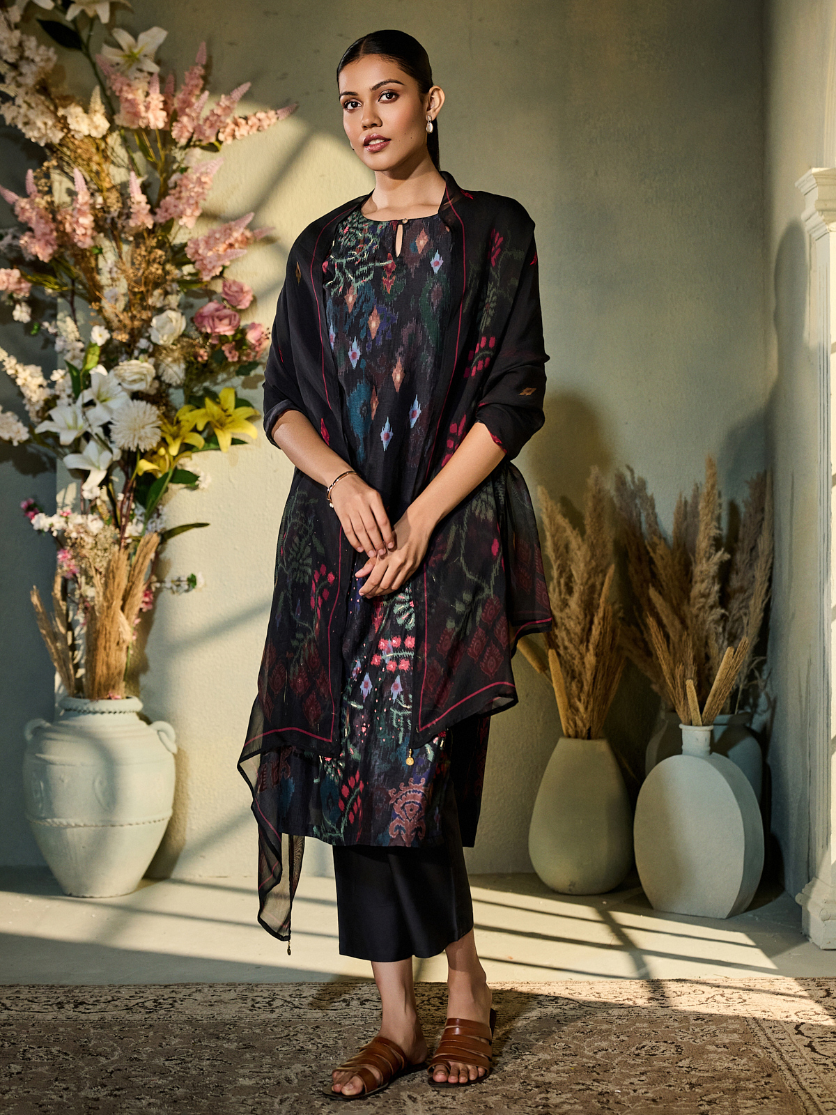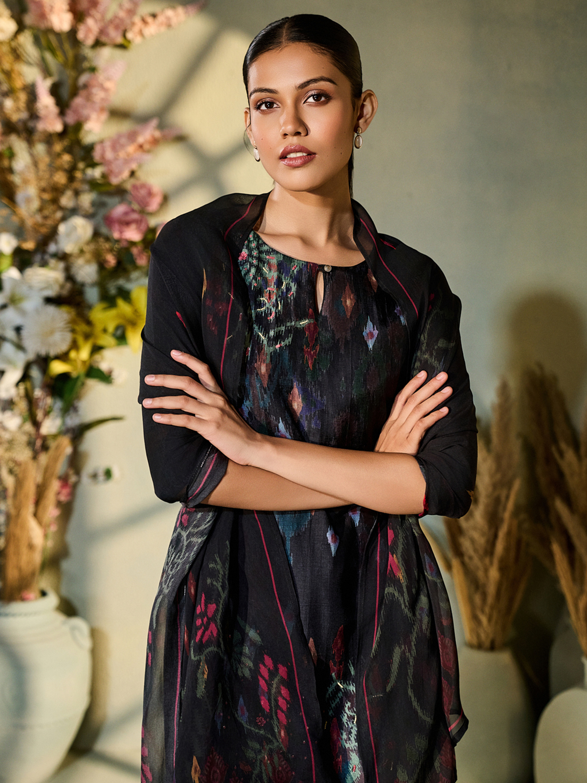 Pure black silk glows with beads and sequins that sparkle like morning dew. The keyhole neckline and quarter sleeves lend subtle refinement. Worn with pant and dupatta, it balances festivity with serene elegance.