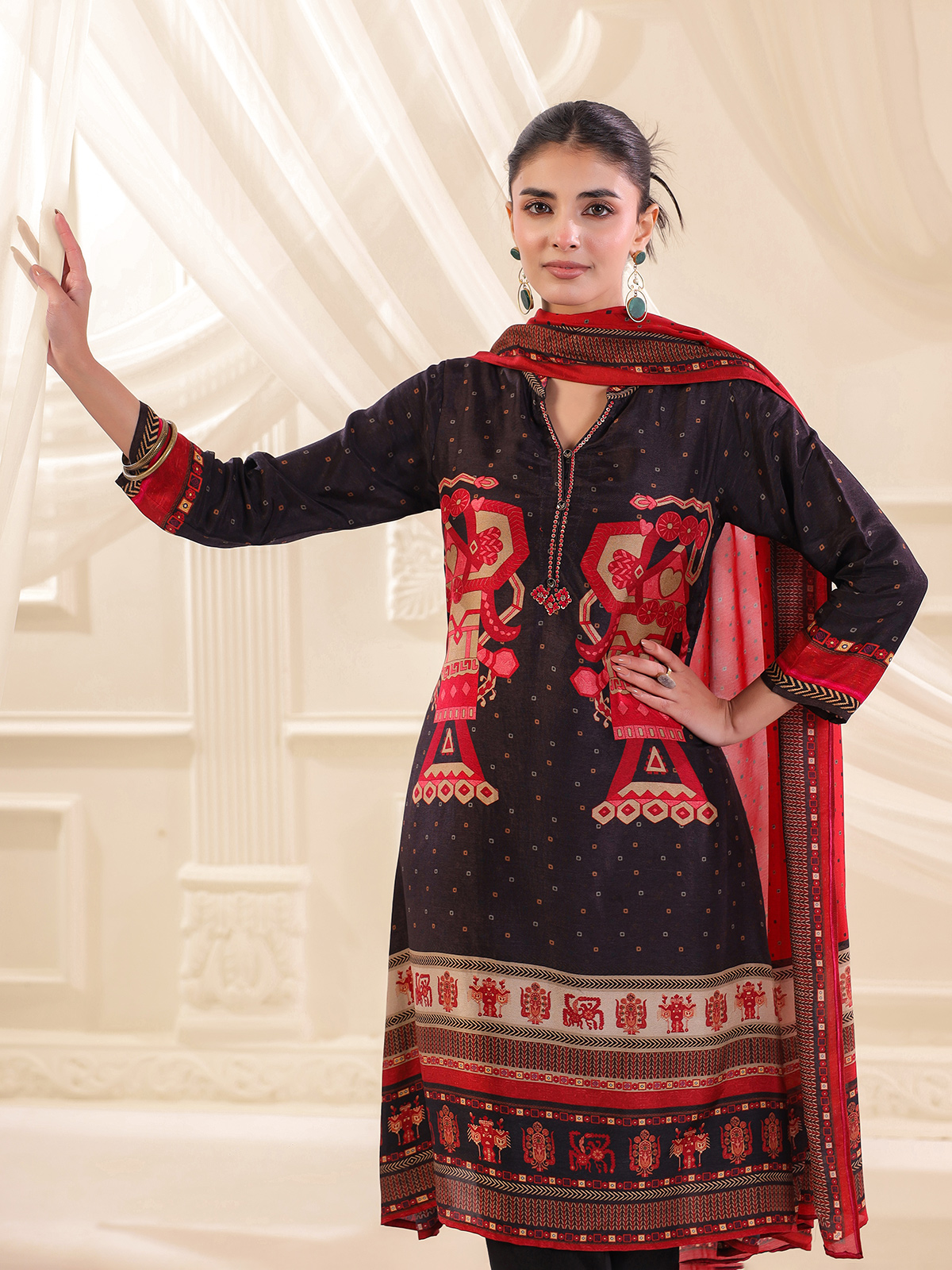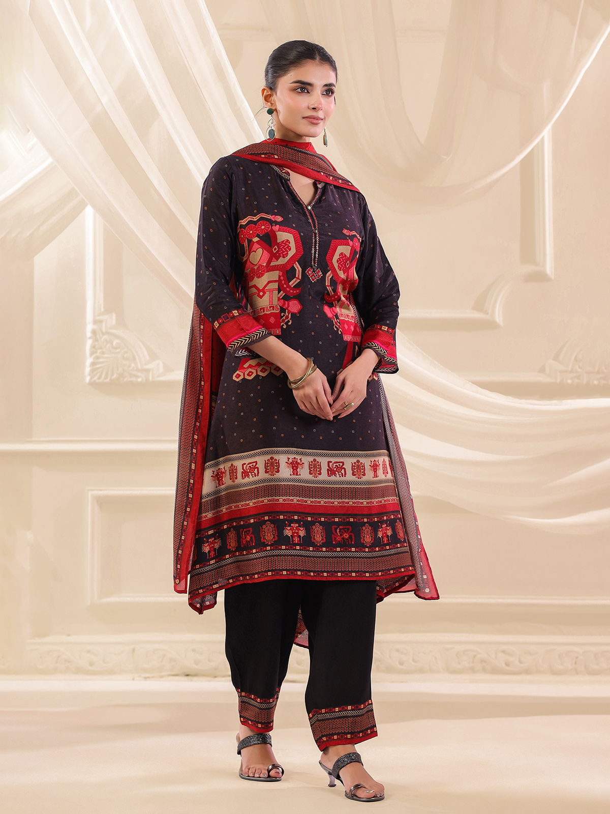 Classic and sophisticated black russian silk kurti set celebrates timeless elegance. The printed kurti features a refined collar neckline with quarter sleeves. Delicately adorned with thread, sequins and bead embellishments. Paired with tailored pants and a coordinated dupatta, the ensemble forms a graceful traditional silhouette perfect for casual and festive occasions.