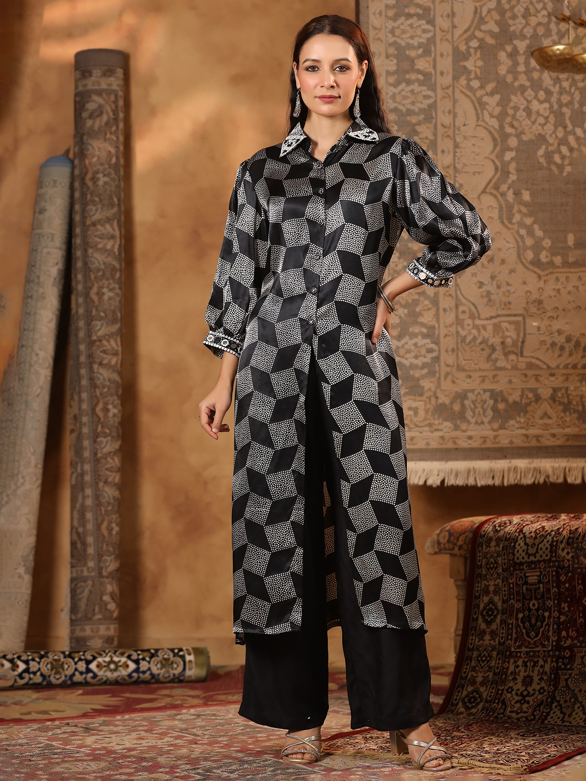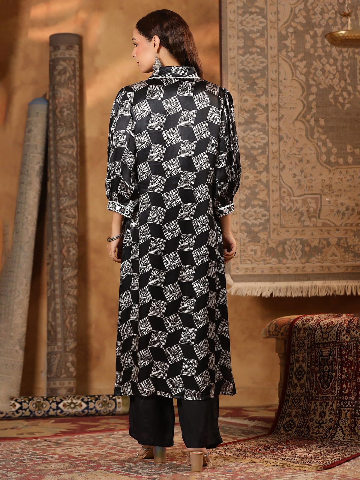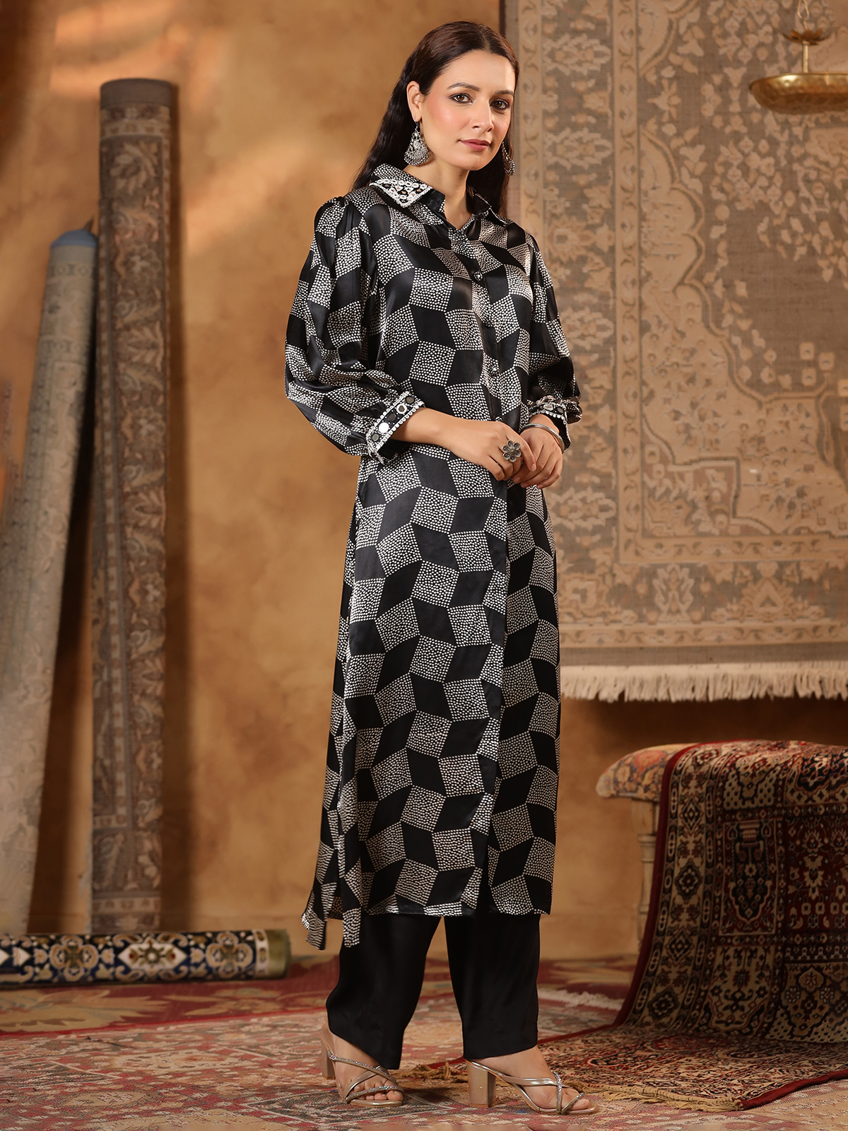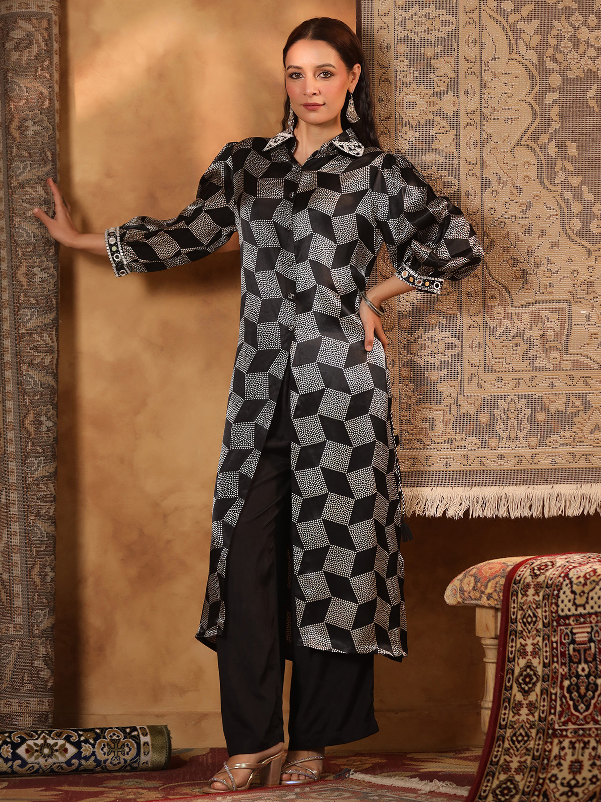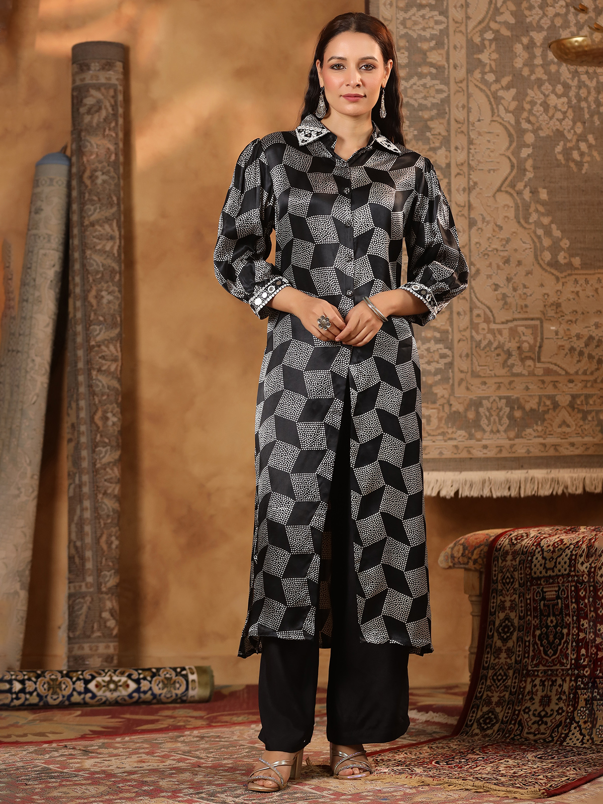 A stunning black kurti set with a detailed design made of satin silk that is ideal for festivals. The kurti is embellished with intricate beadwork and aabla work, and it has a collar and quarter sleeves. When paired with pants, it creates a polished and comprehensive look.
