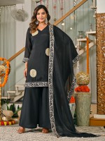A timeless festive choice, this black silk kurti set features elegant embroidery with bead highlights. Paired with a coordinated dupatta and palazzo, the V-neck and quarter sleeves lend a refined silhouette, creating a sophisticated ethnic look with smooth texture and classic appeal.