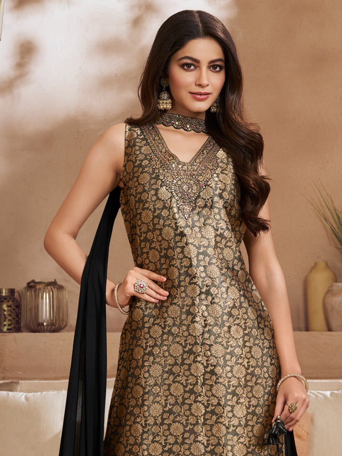 Exquisite in black silk, this palazzo kurti set is adorned with cutdana, beads, sequins, and zari. Featuring a sleeveless V-neck kurti, it is paired with a flowing palazzo and dupatta. A majestic pick for weddings, receptions, or festive events where grandeur meets tradition.