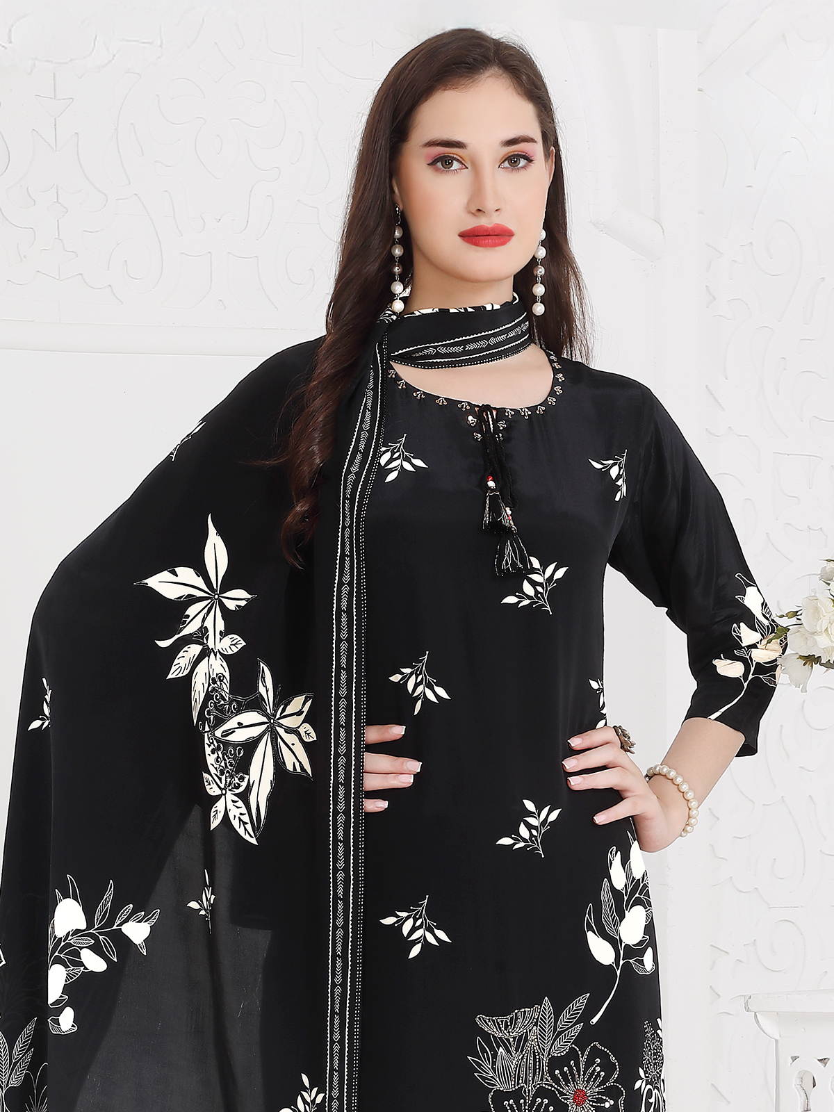 Black silk lends depth and richness to this festive kurti set, striking in its artistry. Printed detailing merges with the luminous gleam of cutdana and sequins on the round neckline and quarter sleeves. Completed with pants and a graceful dupatta, it resonates with classic elegance shaped for timeless celebrations.