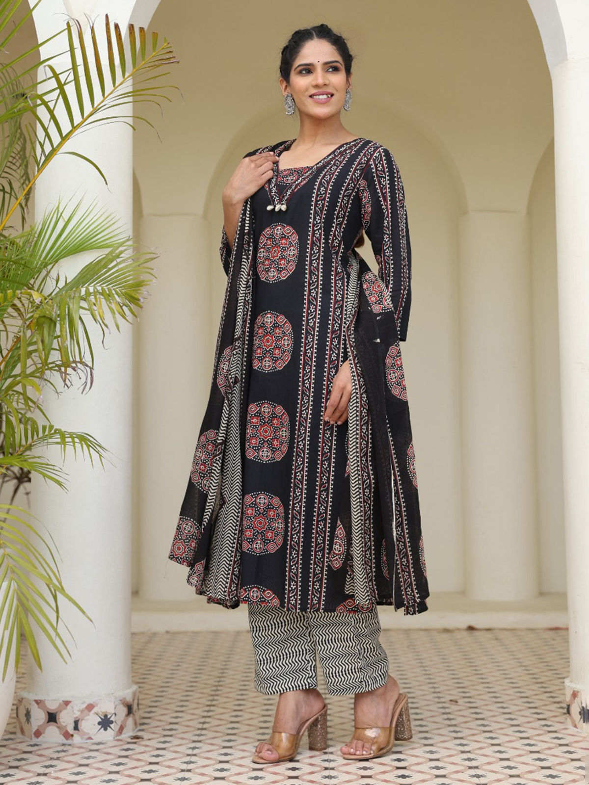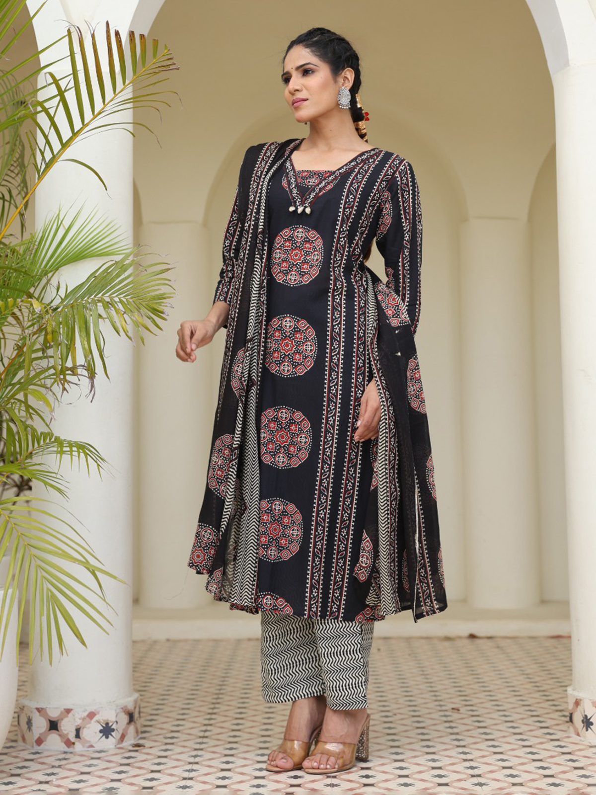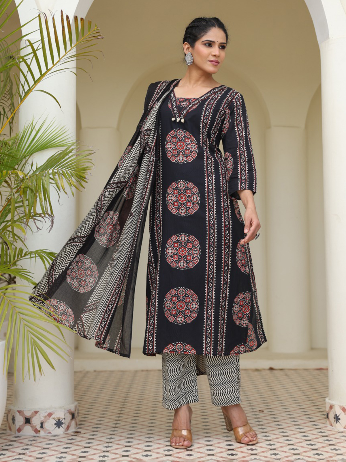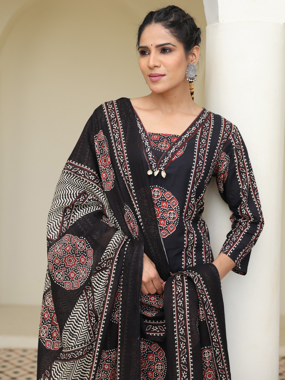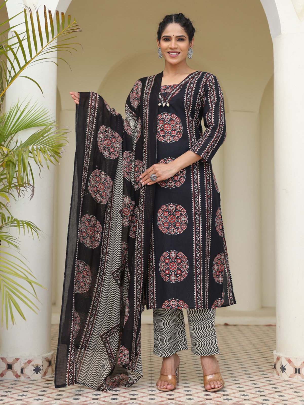 Striking and graceful, this printed straight cut black cotton kurti set reflects confident festive charm. Styled with a classic neckline and quarter sleeves, it is beautifully highlighted with cowrie shell work for added texture. Ideal for festive occasions, it is teamed with comfortable pants and a printed dupatta.