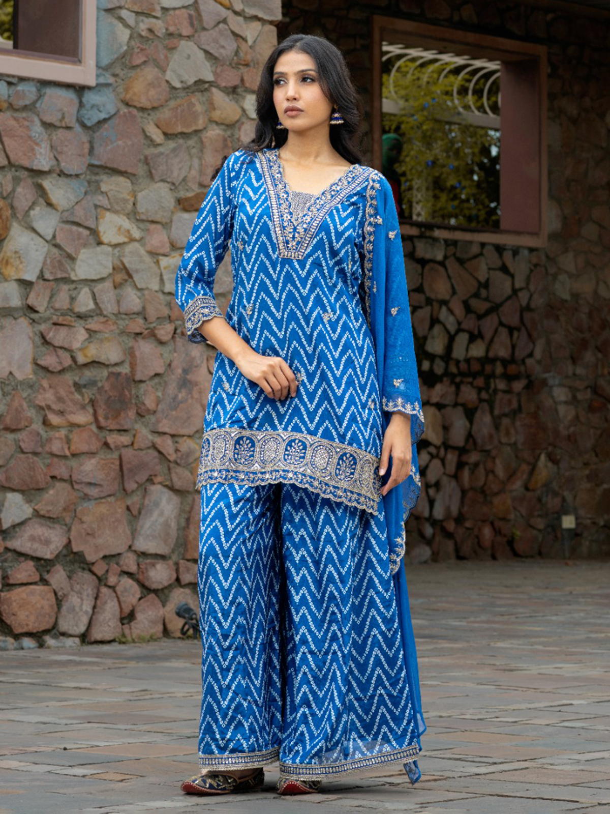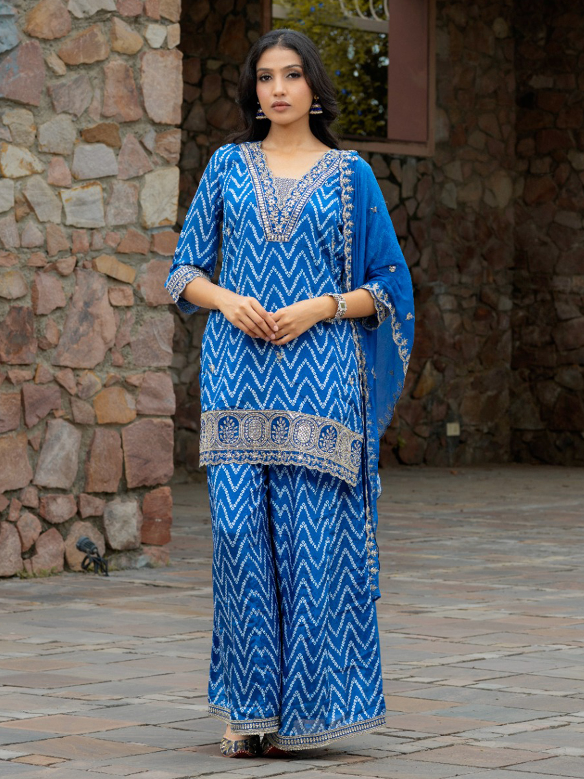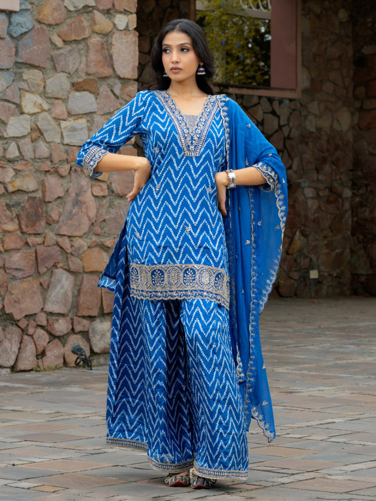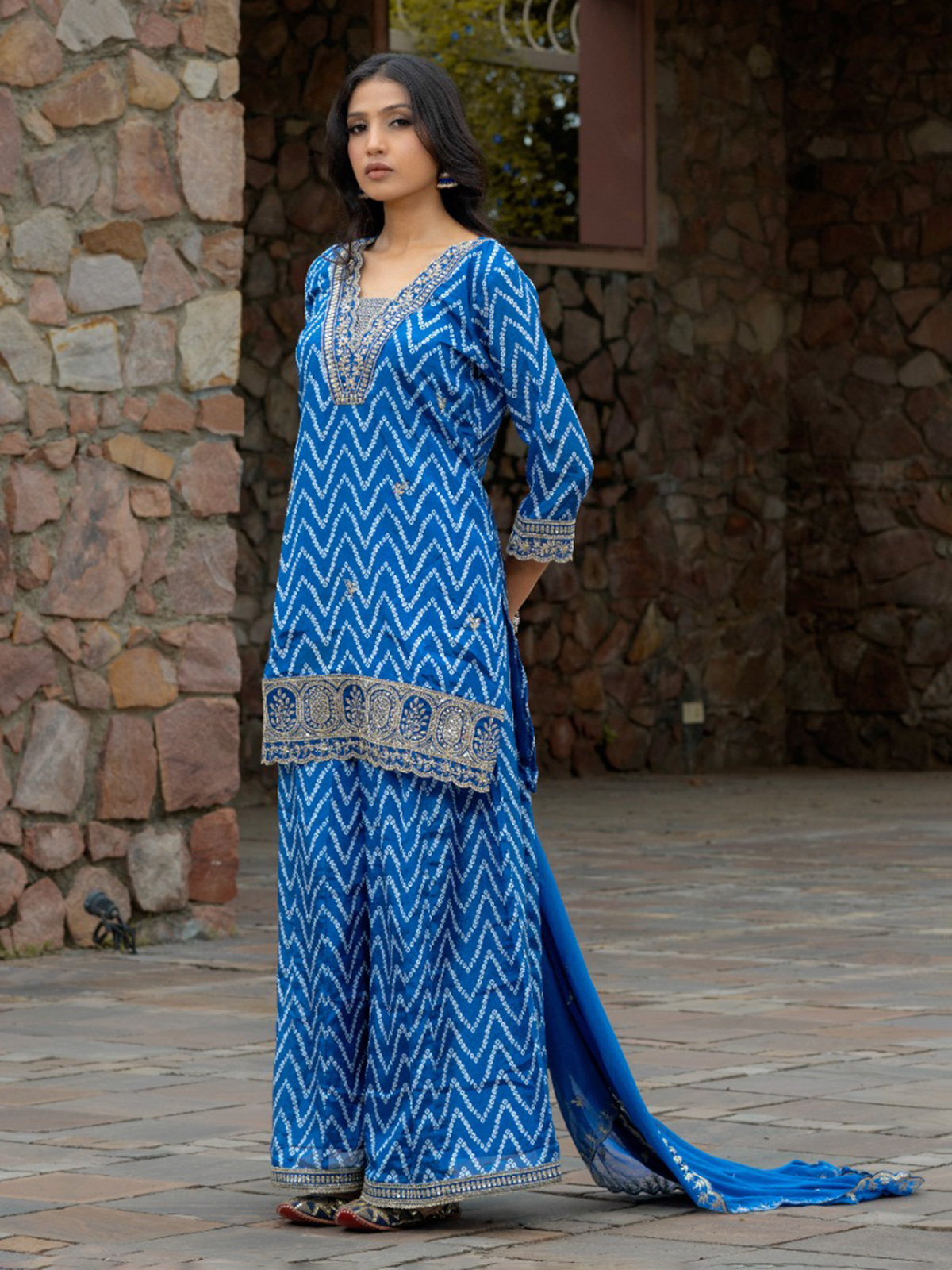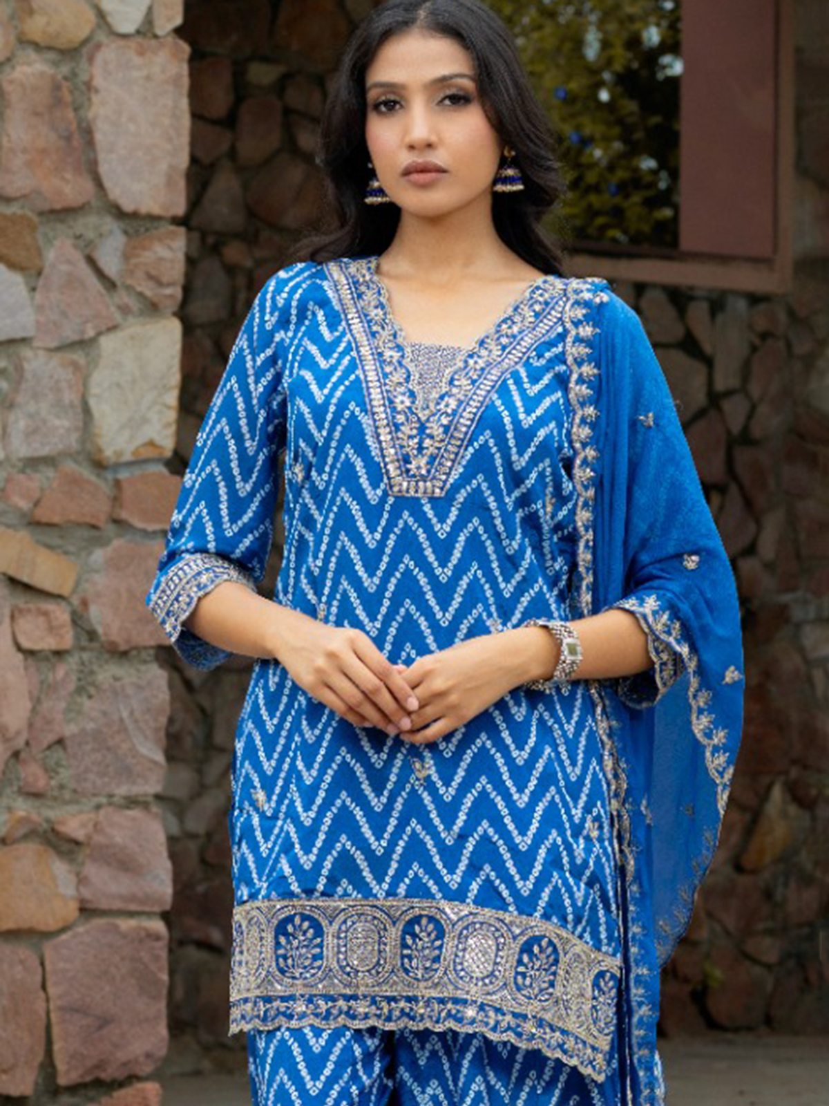 Made from rich satin silk, this blue bandhej printed kurti set is highlighted with refined resham embroidery and soft sequin accents. Designed with a V neckline and quarter sleeves, it is paired with a flowing palazzo and dupatta, creating an elegant festive silhouette.