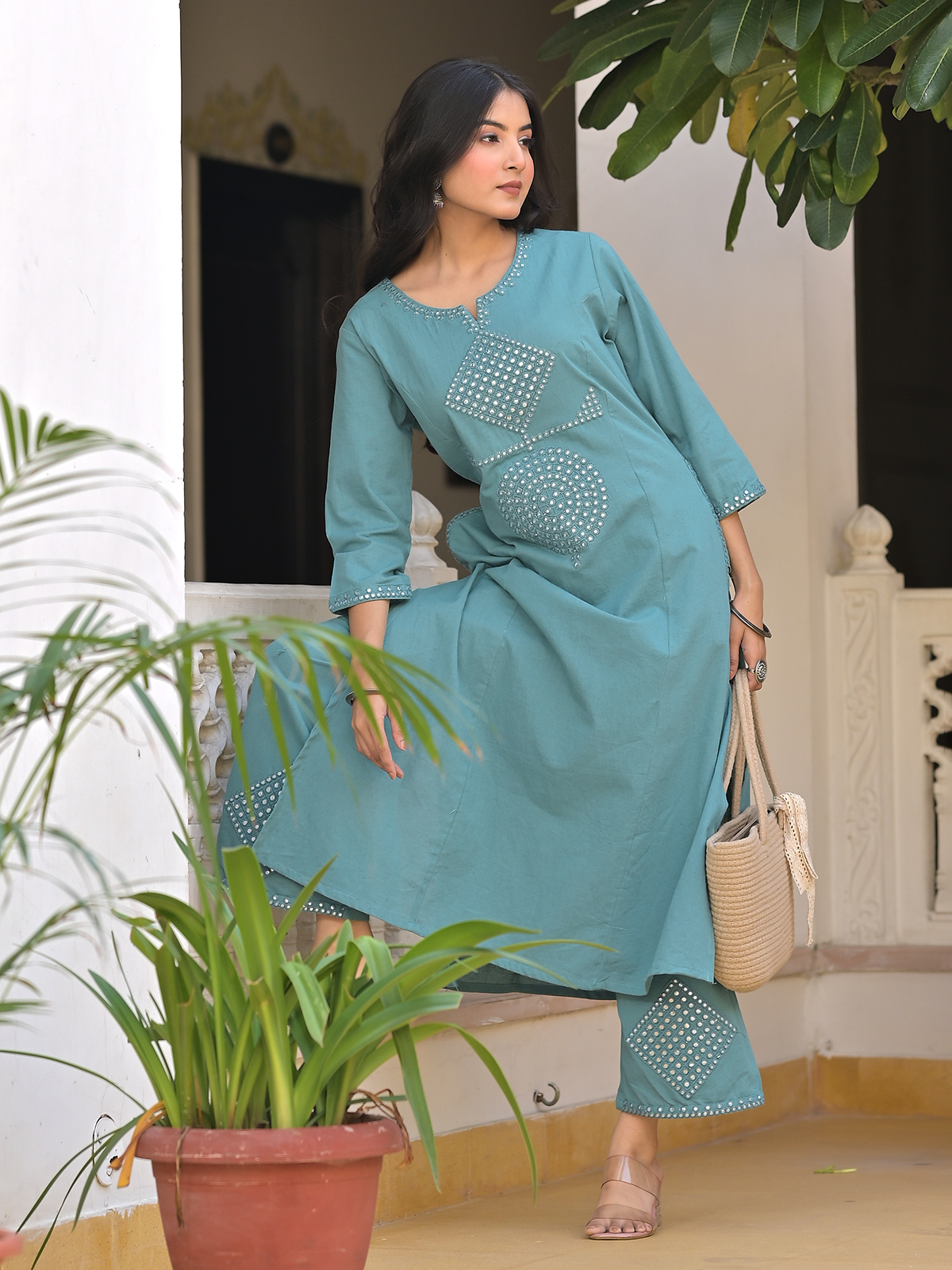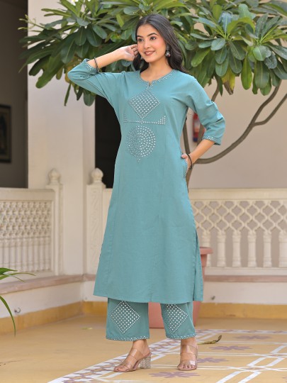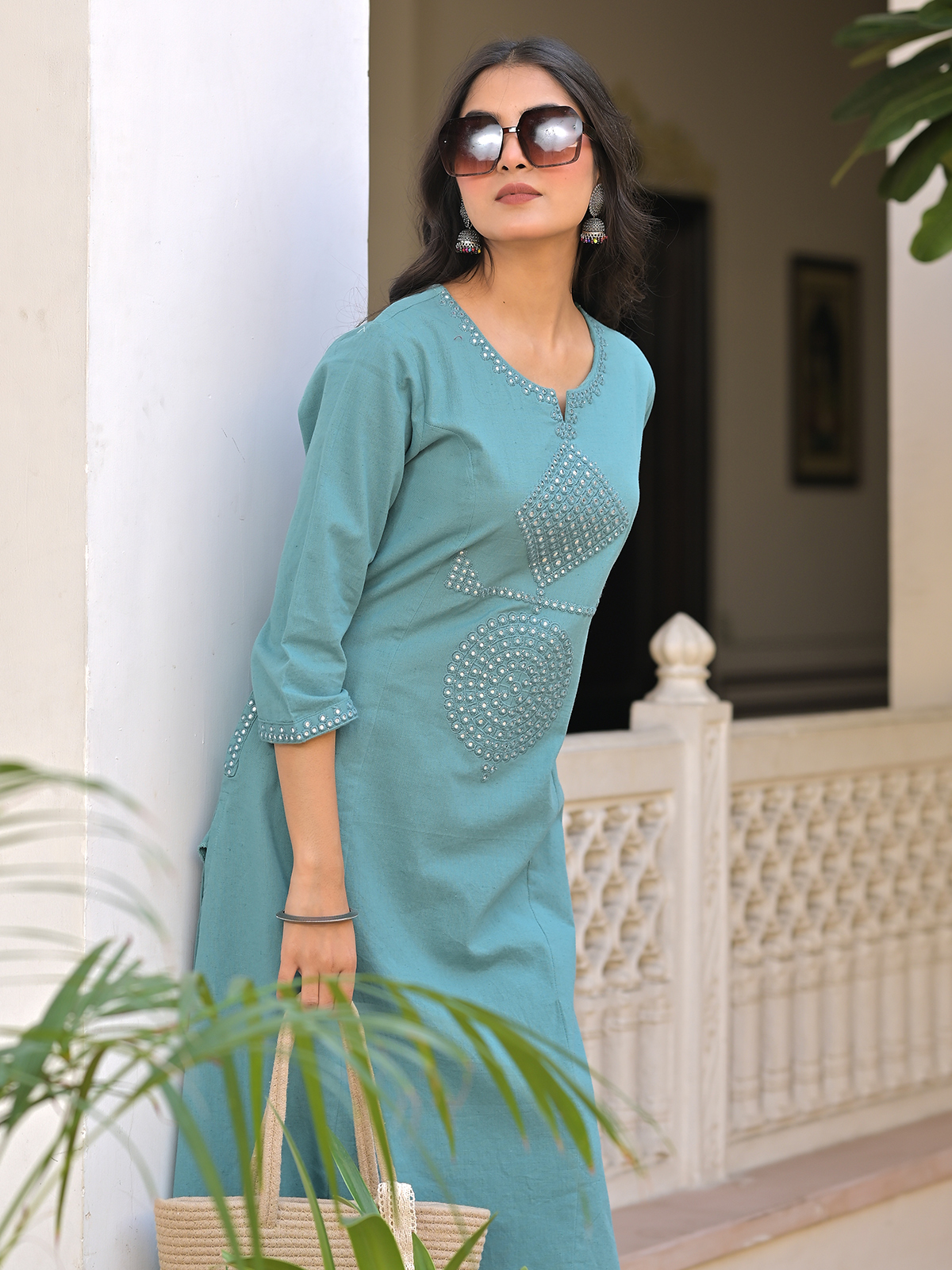 Crafted for effortless elegance, this blue cotton kurti set showcases intricate aabla and embroidery artistry. The kurti features a functional pocket and is paired with flowy palazzo pants for added comfort. Ideal for Eid festivities and cultural events, it blends traditional craftsmanship with everyday wearability beautifully.