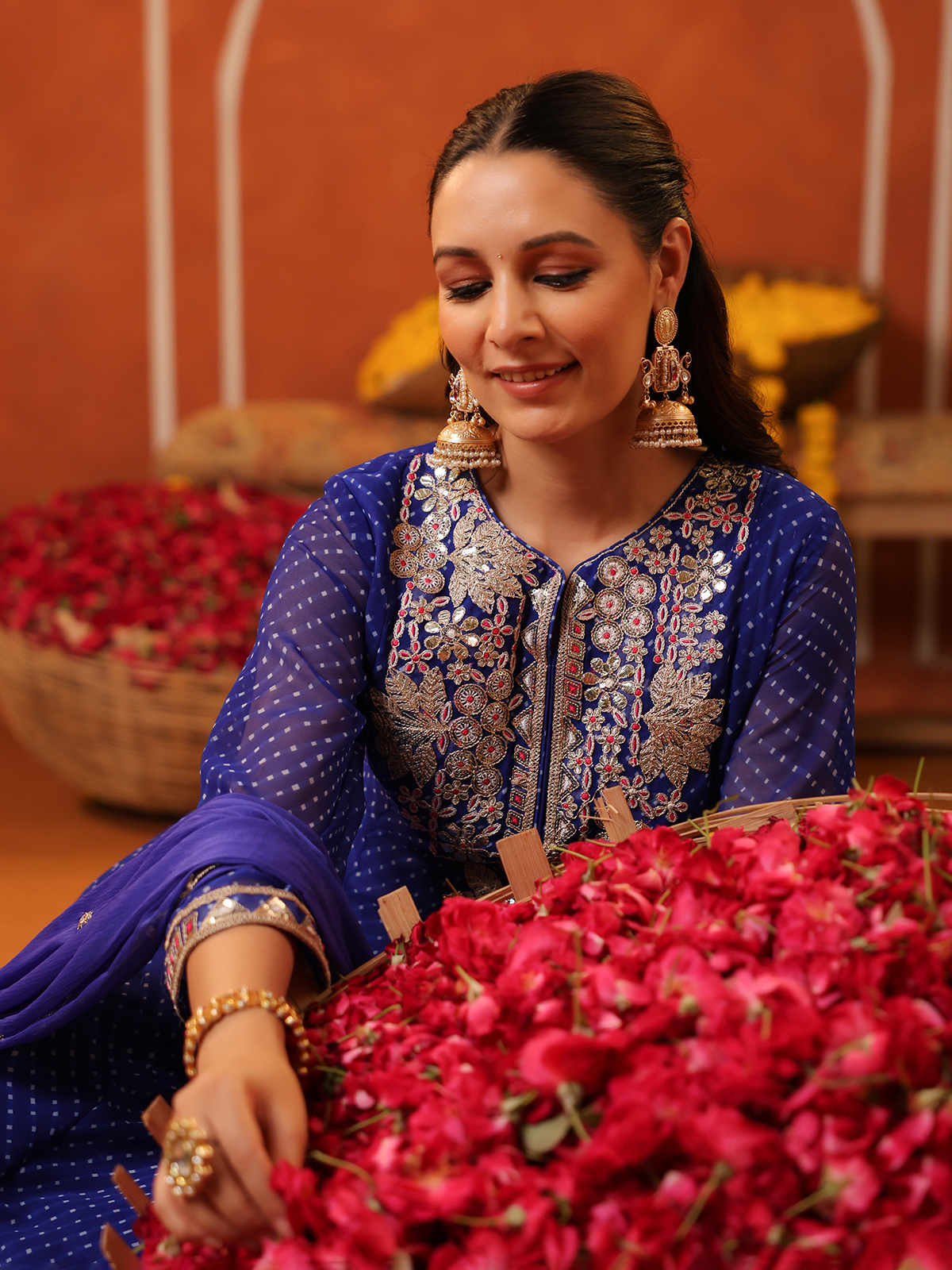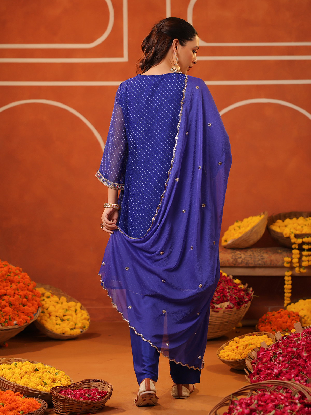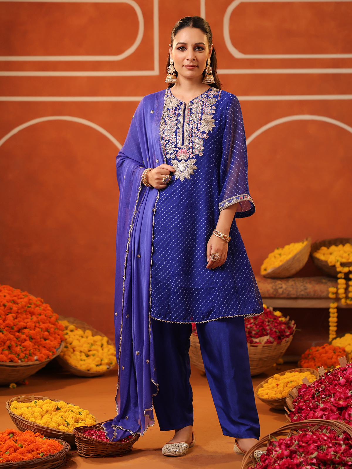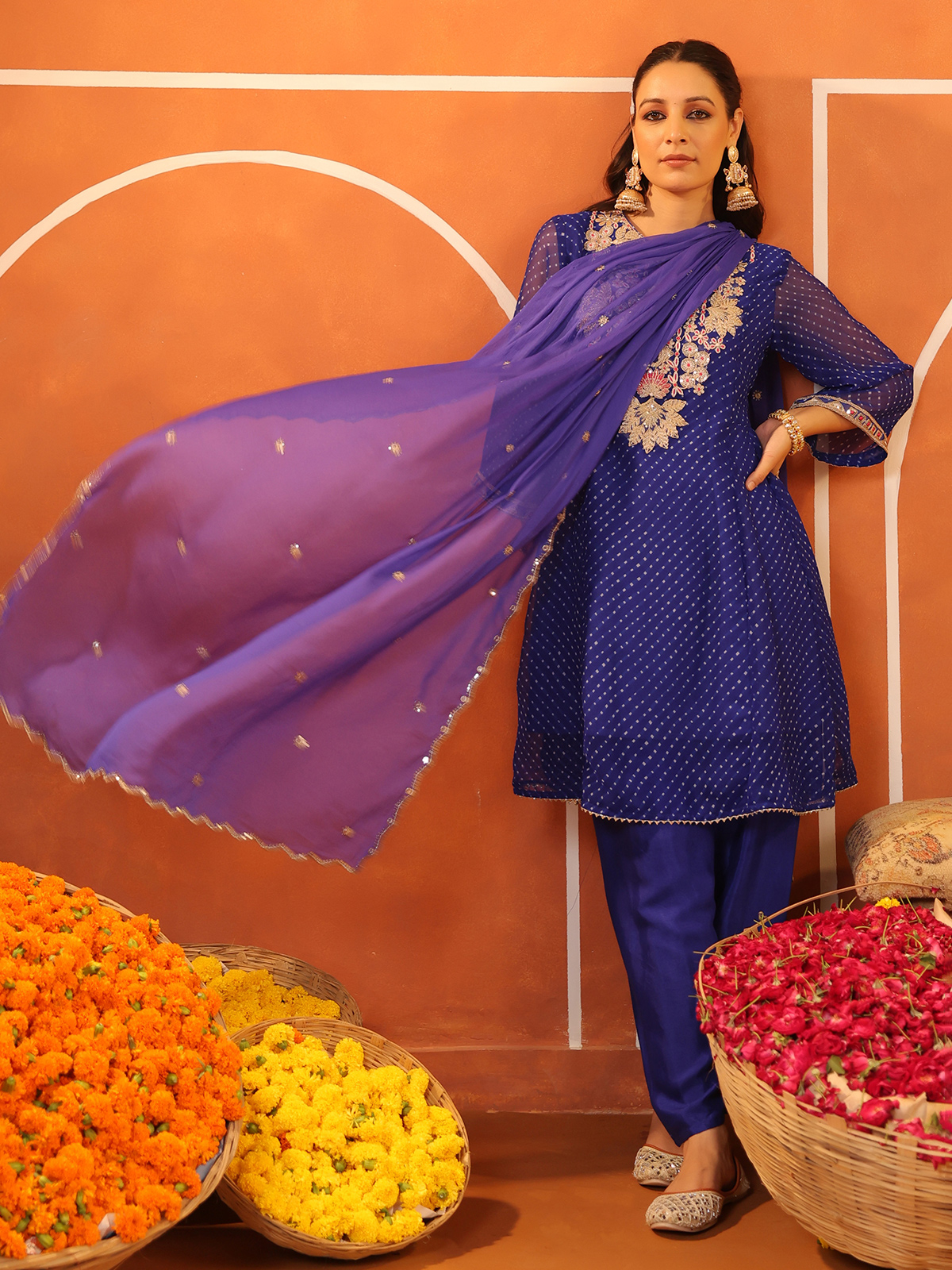 Celebrate vibrancy with this blue georgette printed kurti set, highlighted by embroidery, resham, sequins, and gota. Styled with a V neckline, quarter sleeves, and dupatta, it comes with a pant, offering an effortlessly festive ensemble for special moments.