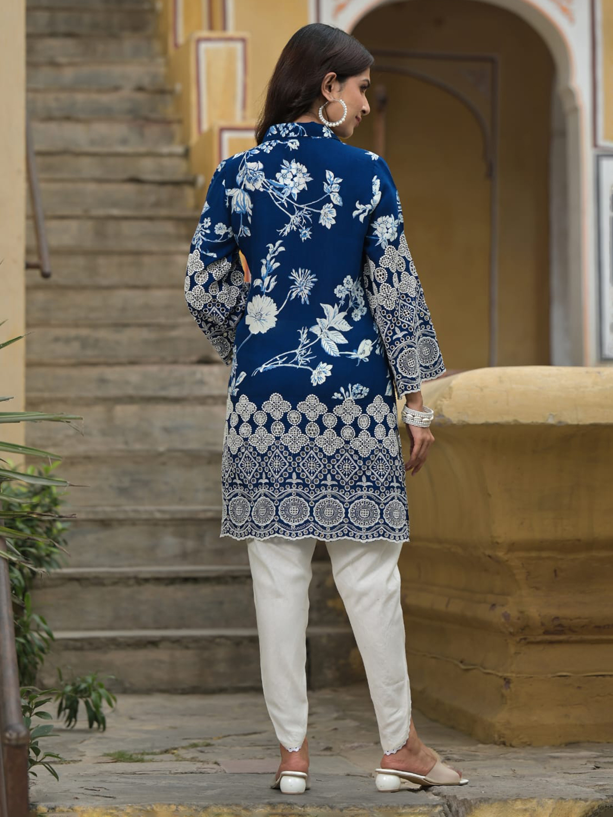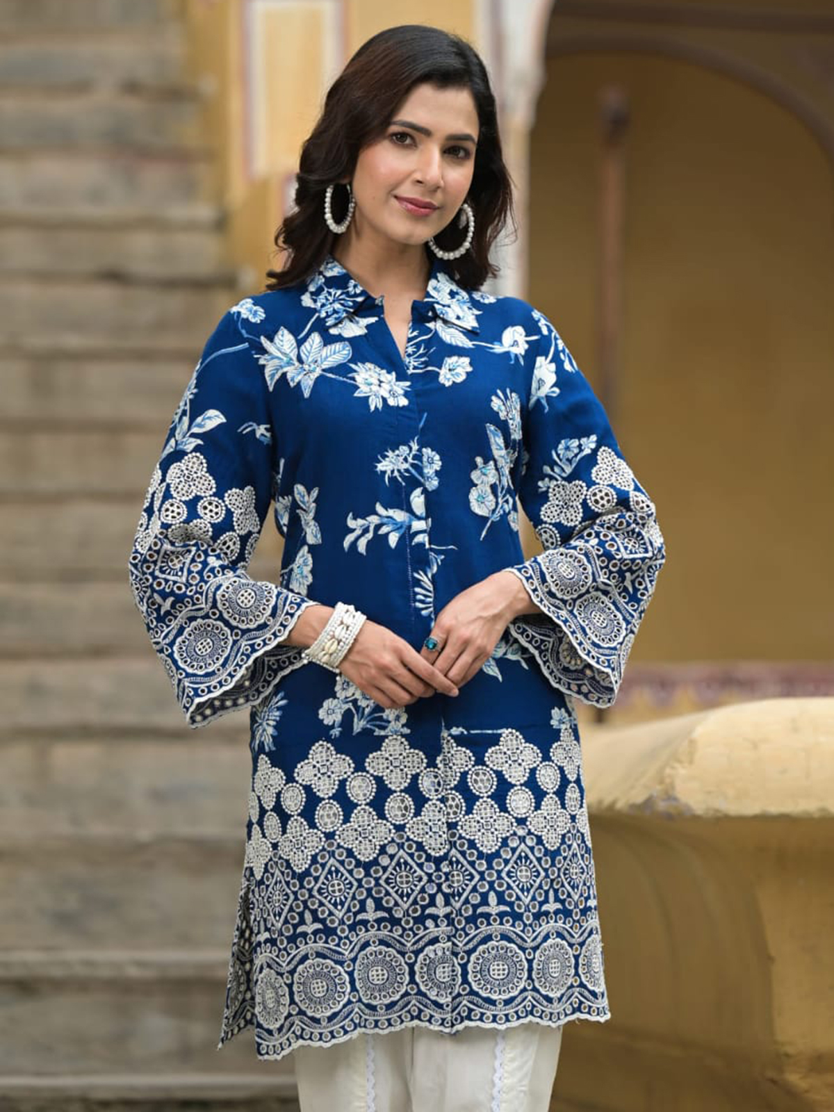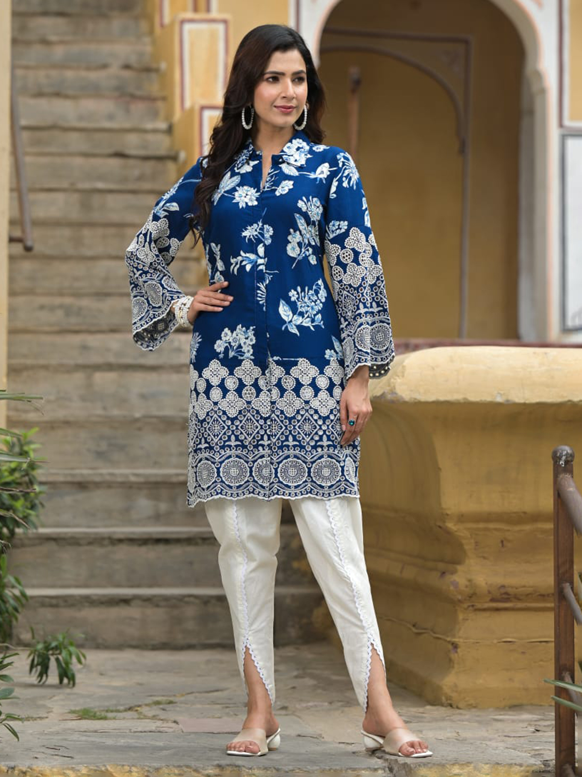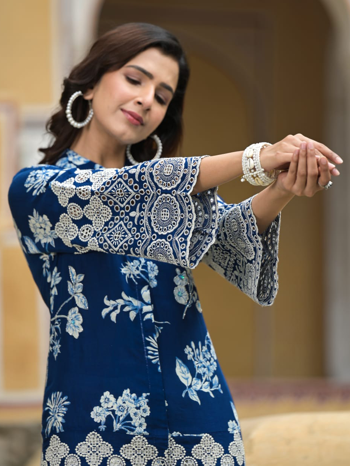 This blue cotton silk suit, featuring elegant printed patterns and delicate embroidery work, is perfect for various occasions. Its versatile design blends traditional charm with modern elements, offering both style and comfort for any event.
