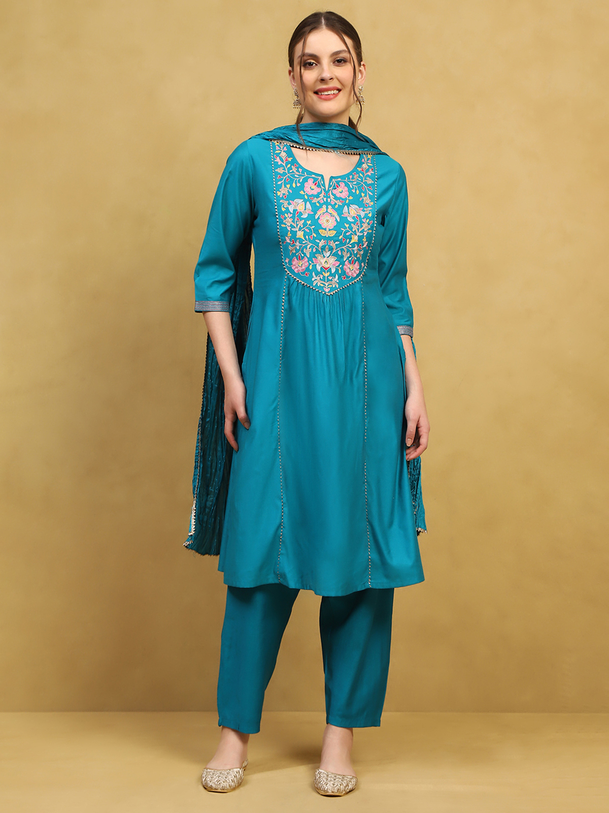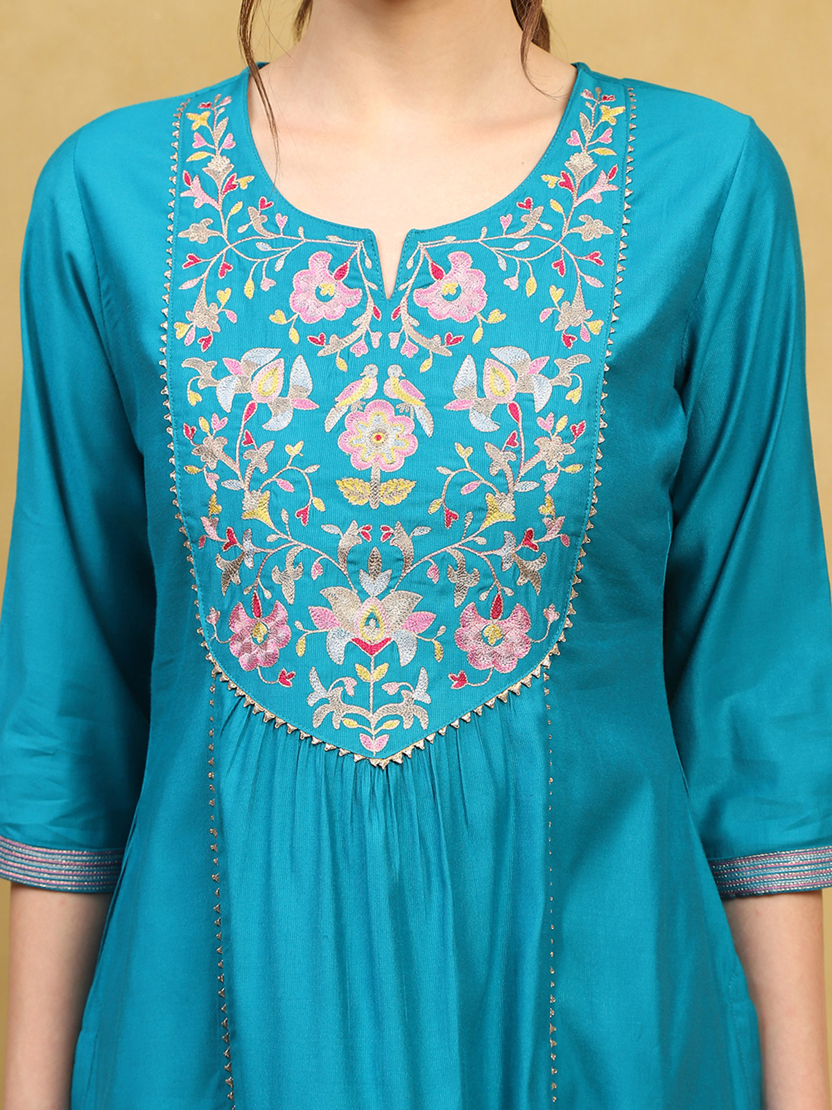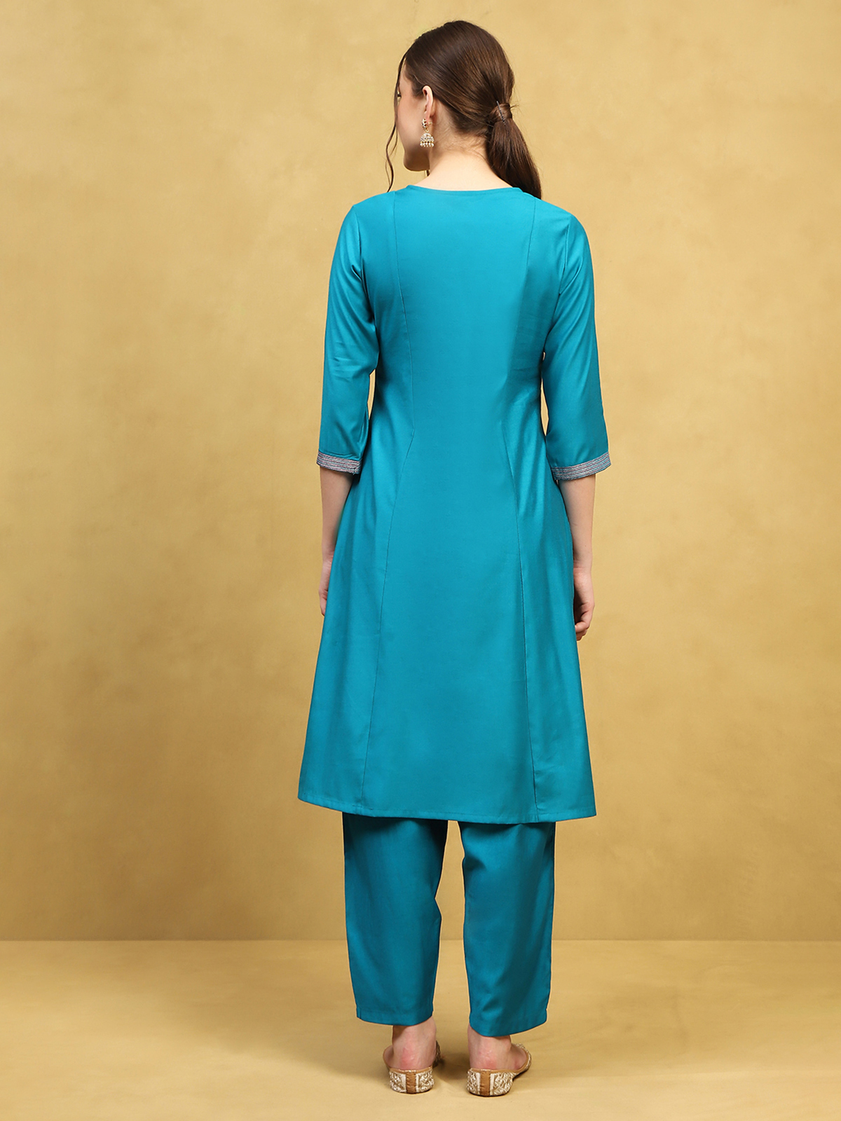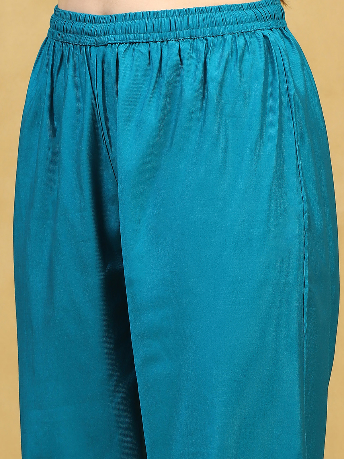 Tailored in lustrous blue silk, this kurti set features delicate thread work that adds refined depth to its festive aura. The quarter sleeves shape a balanced, elegant silhouette. Paired with complementing pants, it reflects subtle grandeur and modern poise.