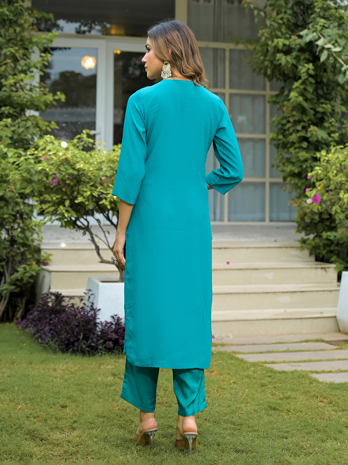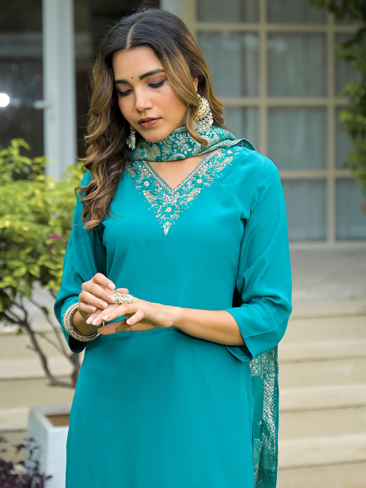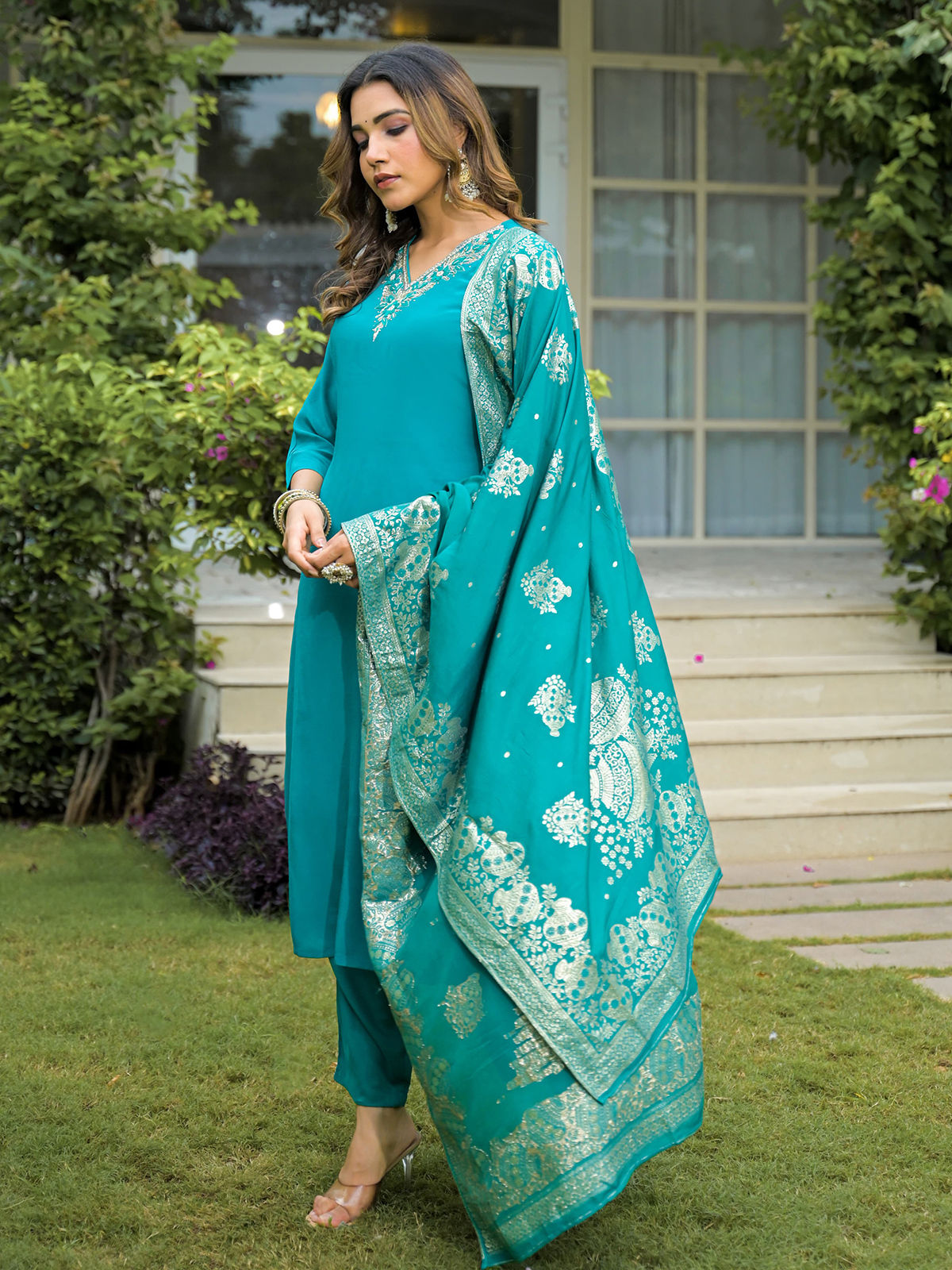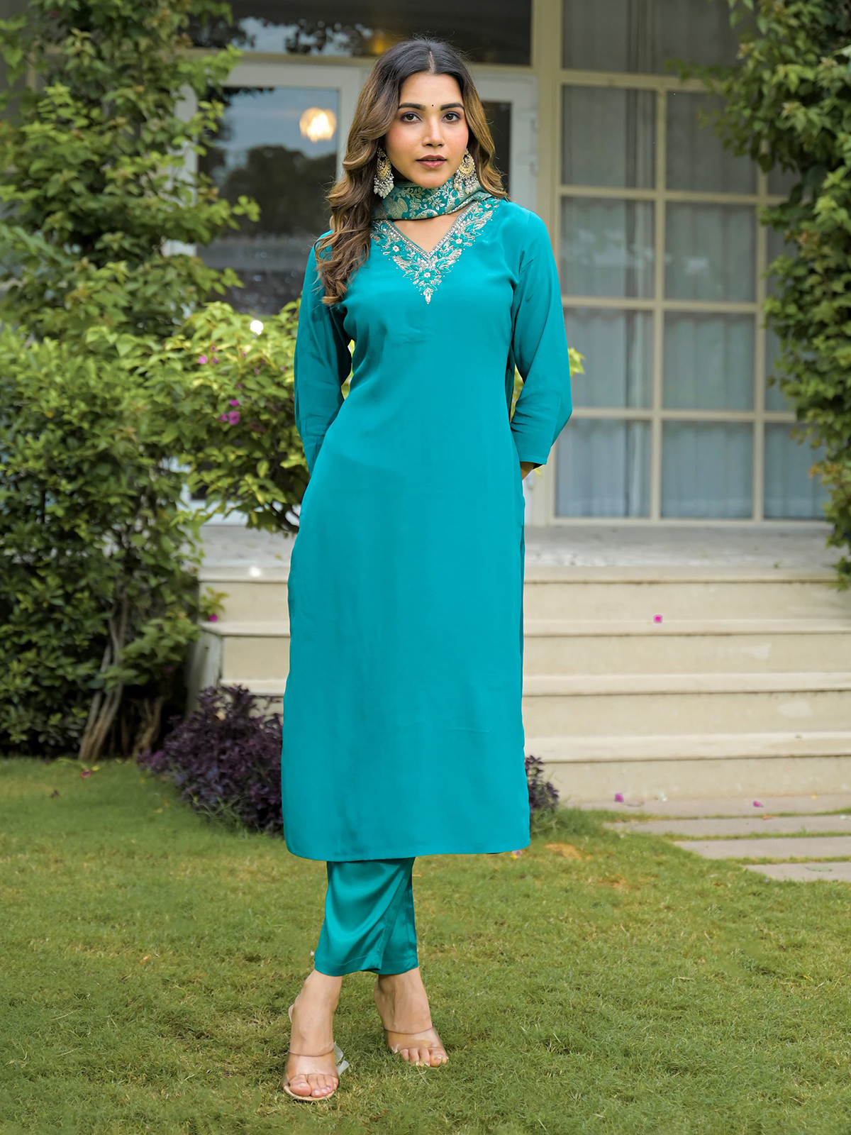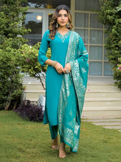 This blue silk kurti set dazzles with zari, stones, sequins, beads, and cutdana embroidery. Styled with a V neck and quarter sleeves, it includes a pant and dupatta, perfect for festive evenings or special family functions.