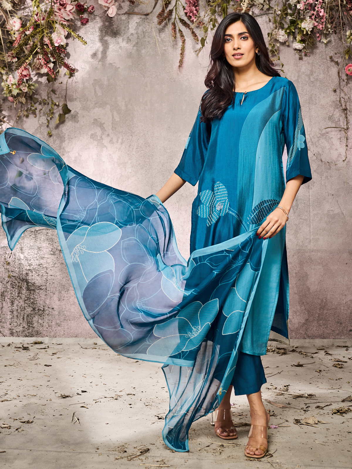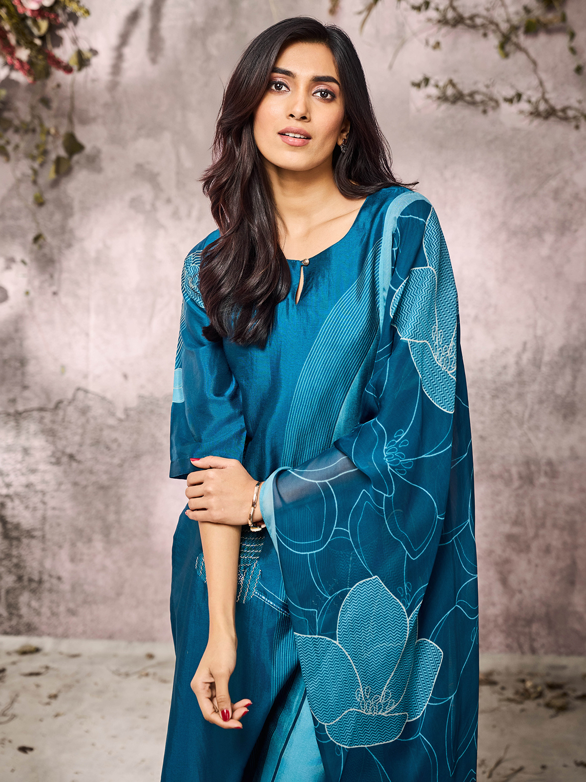 Smooth silk in soft blue meets subtle prints, creating a harmony of grace and charm. The keyhole neckline and quarter sleeves bring polished finesse to its festive silhouette. Teamed with pant and dupatta, it radiates easy sophistication, making it perfect for both serene daytime gatherings and elegant evening moments.