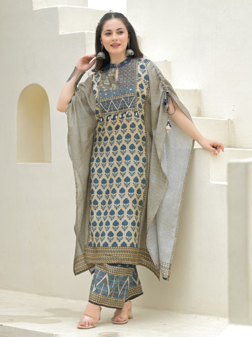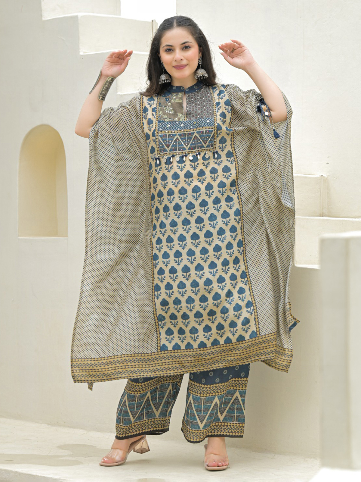 Chic in blue silk, this yoke-style kurti set is adorned with sequins and coin embellishments. Styled with a stand collar and palazzo, it blends festive flair with modern detailing.