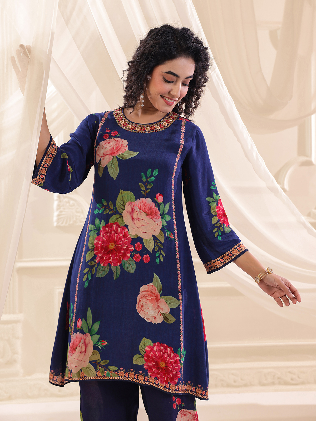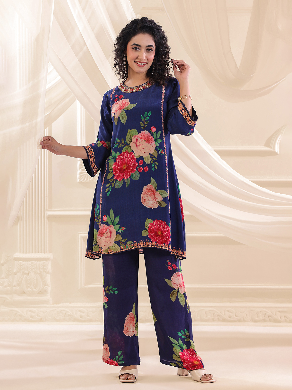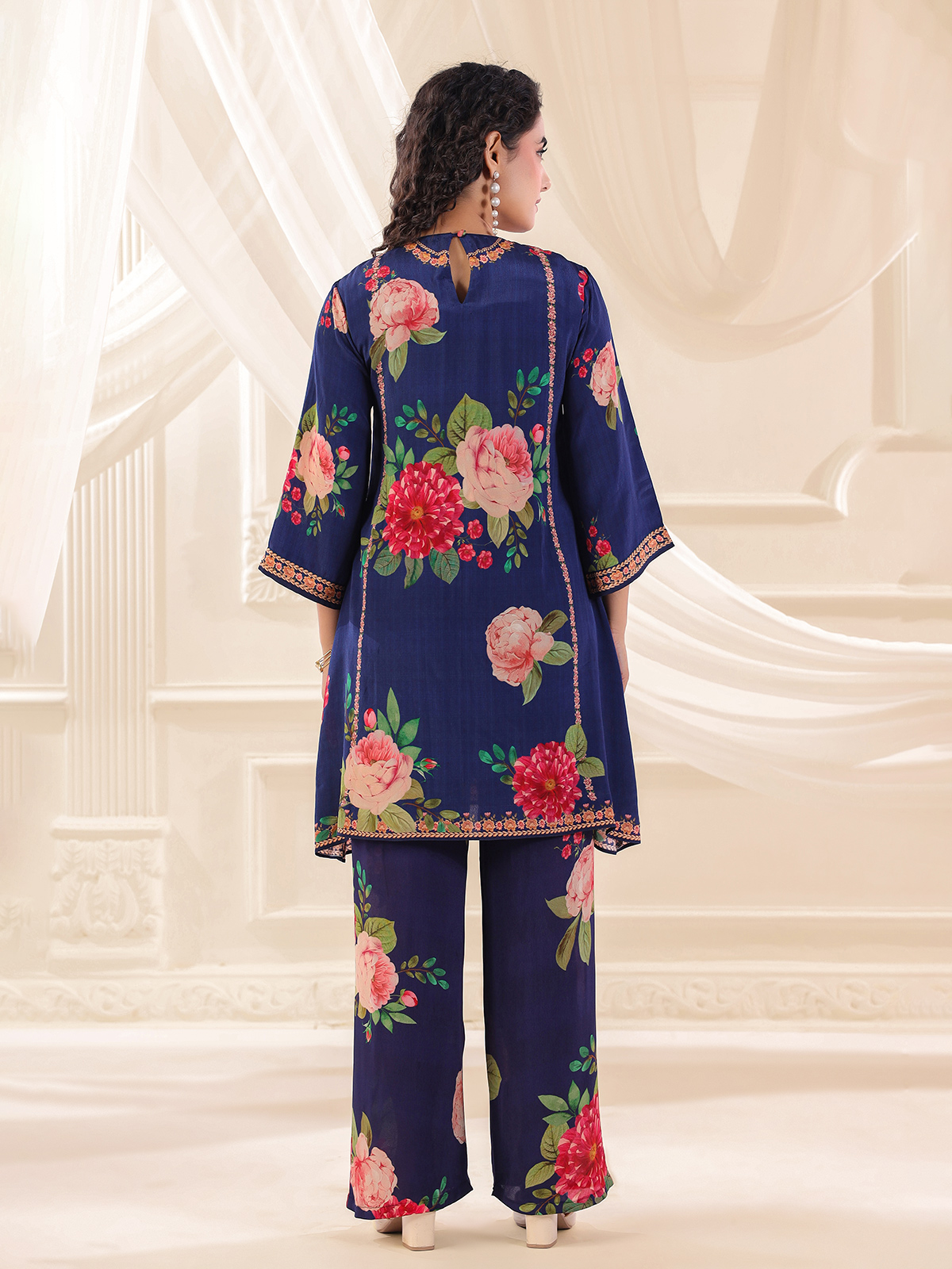 Blue Viscose Crepe Printed Kurti Palazzo Festive Set