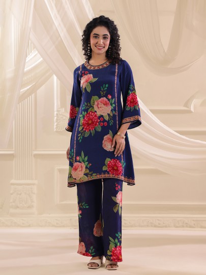 Vibrant elegance shines through this blue viscose crepe kurti set. The printed kurti features a graceful round neckline and quarter sleeves. Adorned with thread, sequins, beads and zardosi embellishments that add refined sparkle. Paired with flowing palazzo pants, the ensemble creates a graceful festive silhouette perfect for casual gatherings.