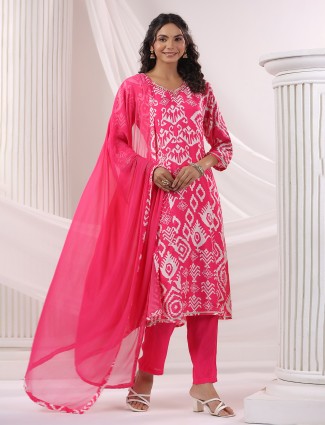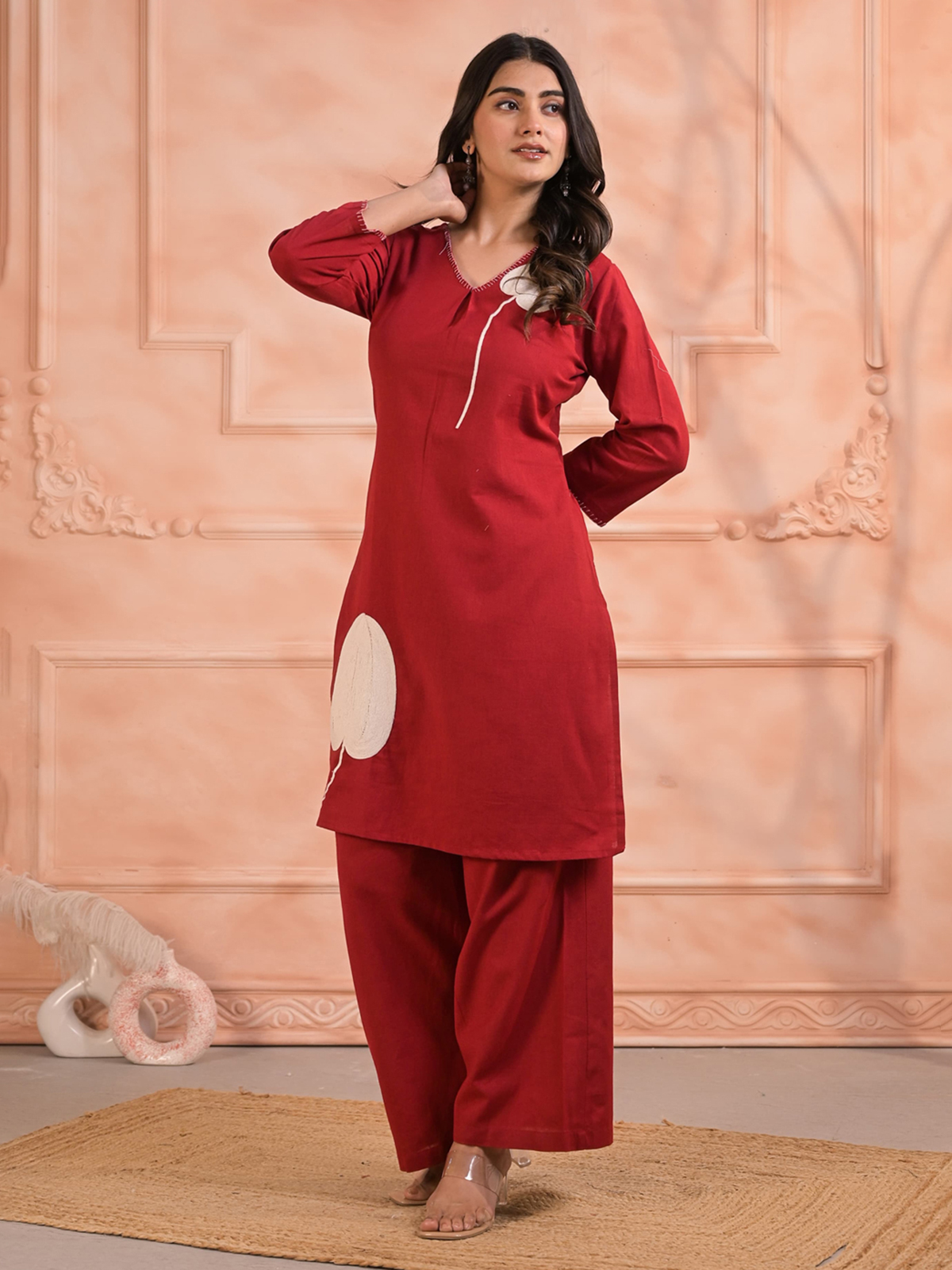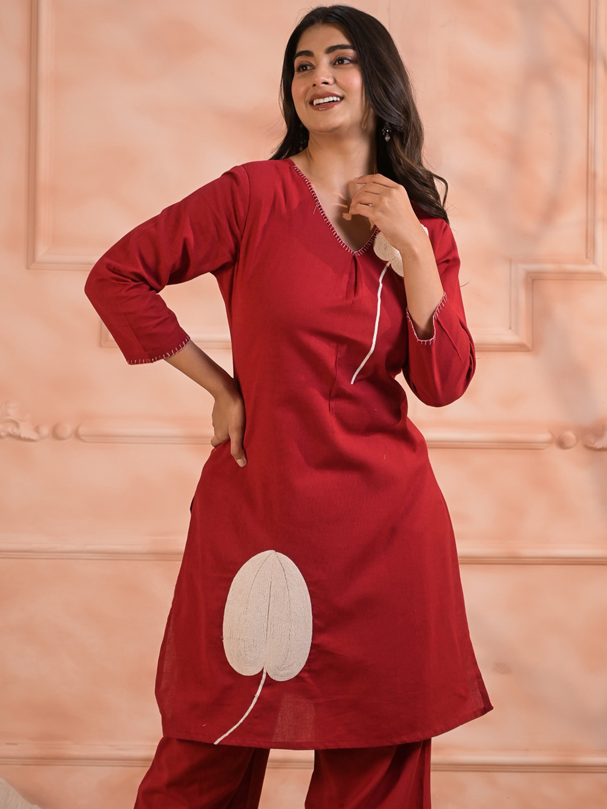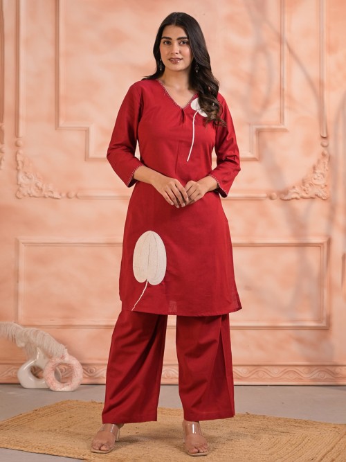 Celebrate in vibrant style with this red cotton silk kurti set, embellished with fine thread work. The V-neckline and quarter sleeves add timeless appeal, while the palazzo ensures comfort, making it a perfect choice for festive and cultural gatherings.