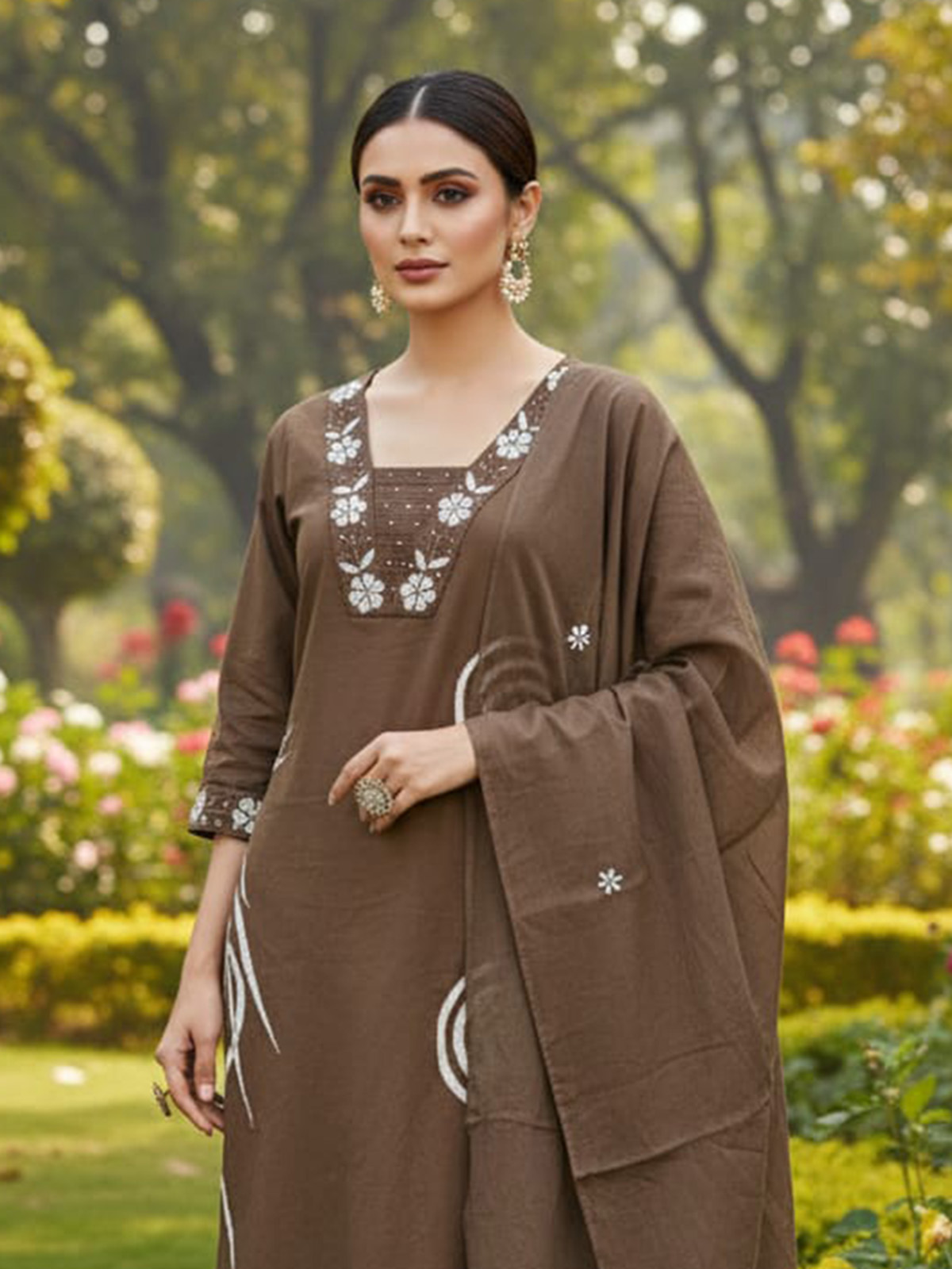 Enhancing your graceful charm, this brown cotton kurti set brings effortless elegance to festive dressing. Designed with a simple neckline and quarter sleeves, featuring subtle printed work for a refined appeal. Perfect for festive occasions, it is paired with a comfortable pant and a coordinated dupatta for a stylish and easy ethnic look.