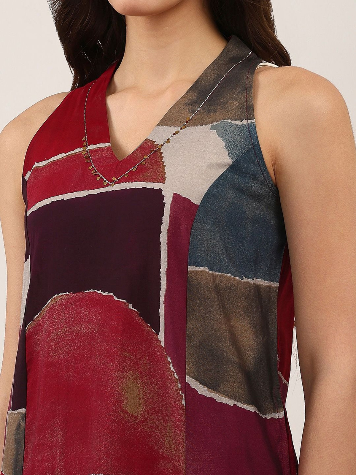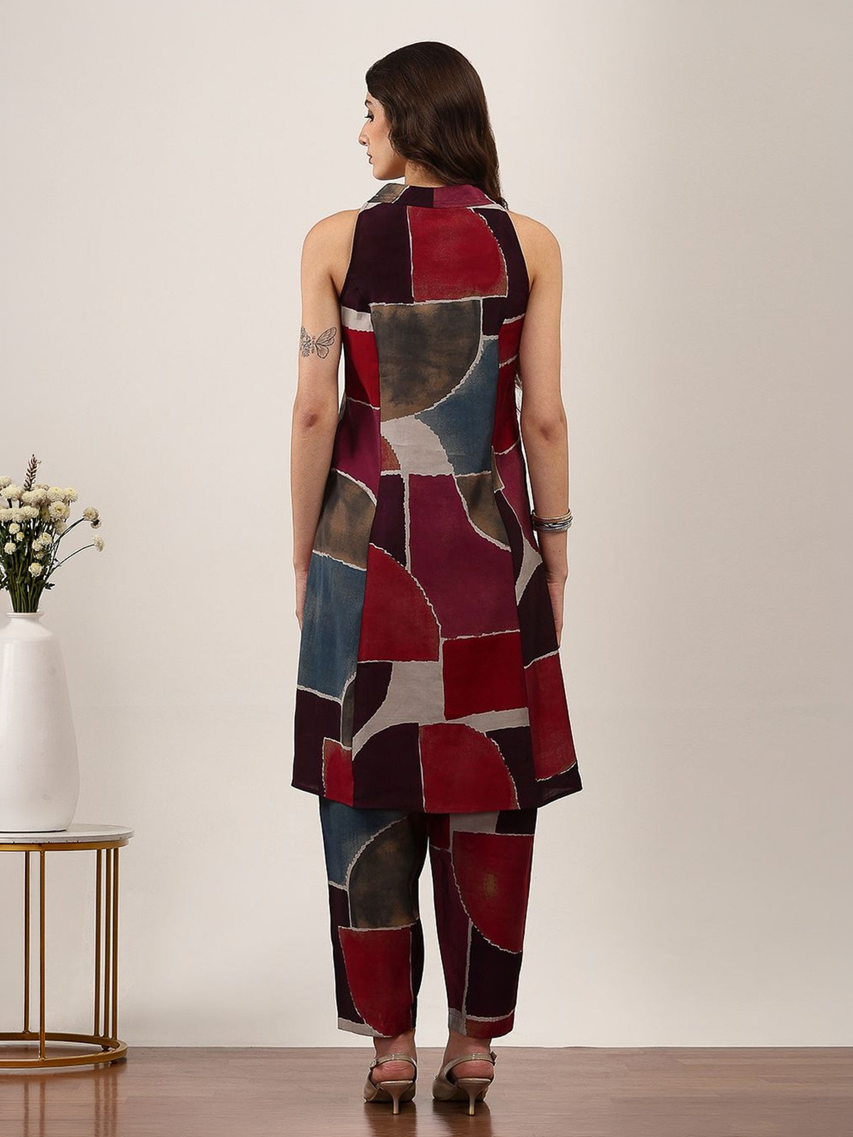 Rich brown hues elevate the charm of this silk kurti set, crafted for effortless everyday elegance. Designed with a sleek sleeveless silhouette and a flattering V neckline, it features refined printed patterns that add subtle sophistication. Paired with comfortable pants, this ensemble creates a relaxed yet polished look, making it perfect for casual outings and graceful daily styling.