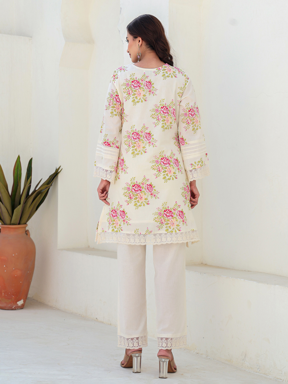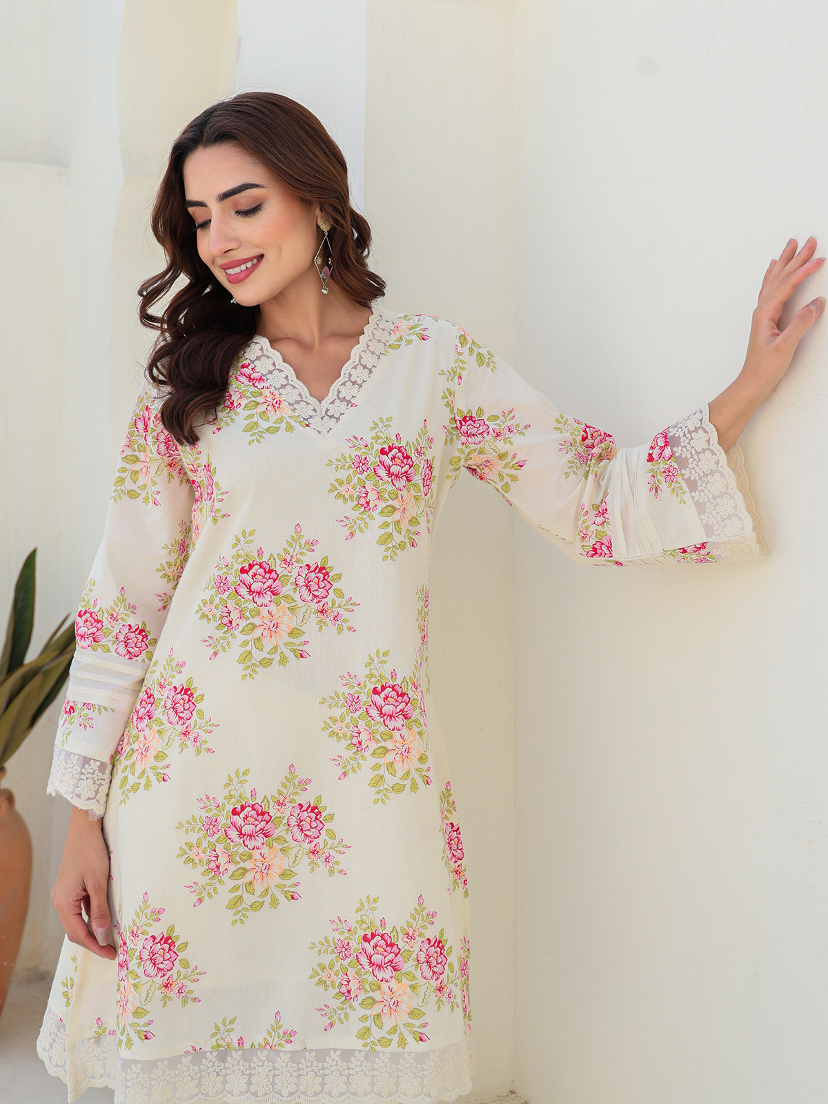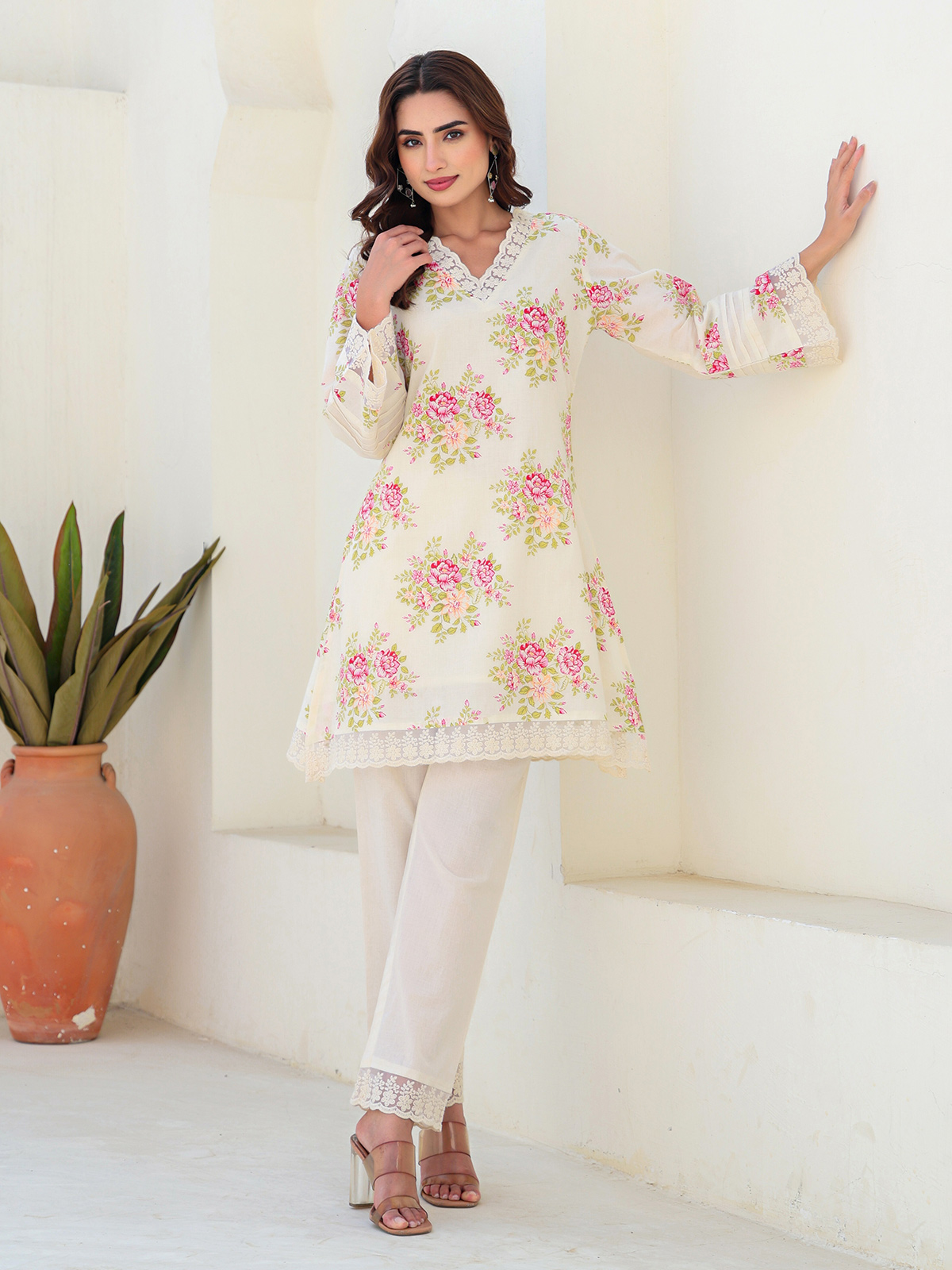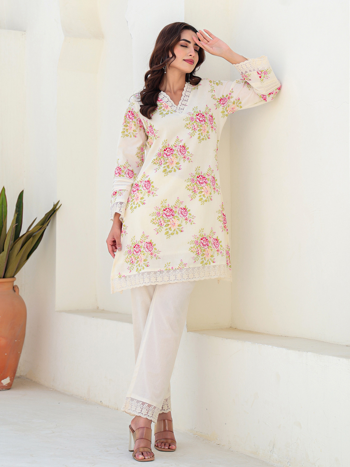 Exuding charm, this off-white cotton kurti set features floral prints, a V-neckline, and full sleeves. Paired with a pant, it is perfect for festive occasions, offering elegance with comfort for both daytime functions and traditional events.