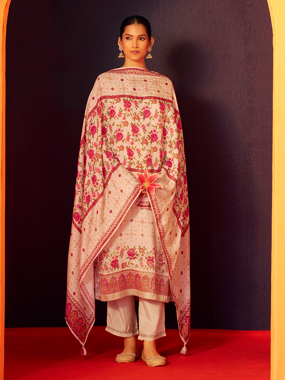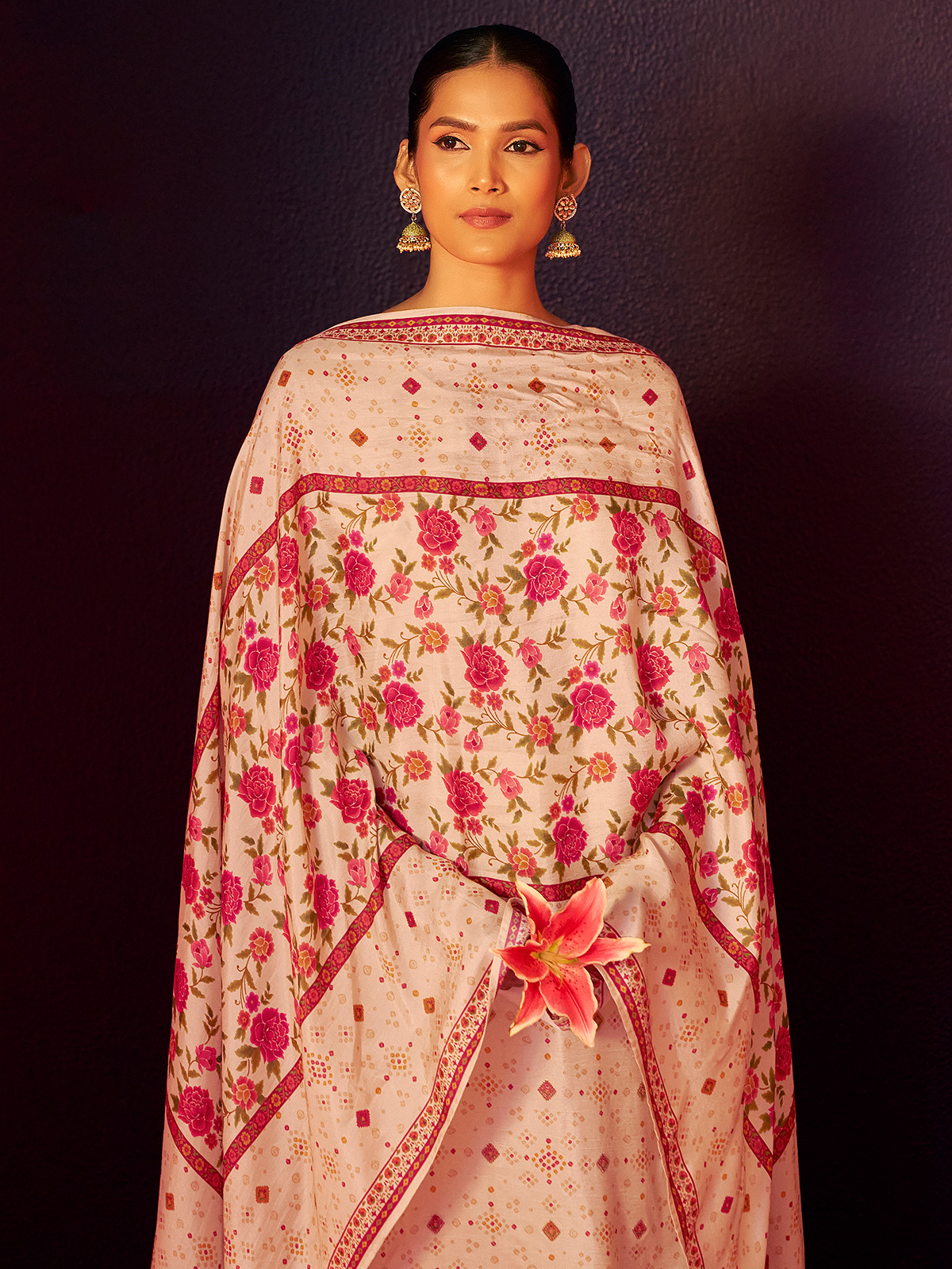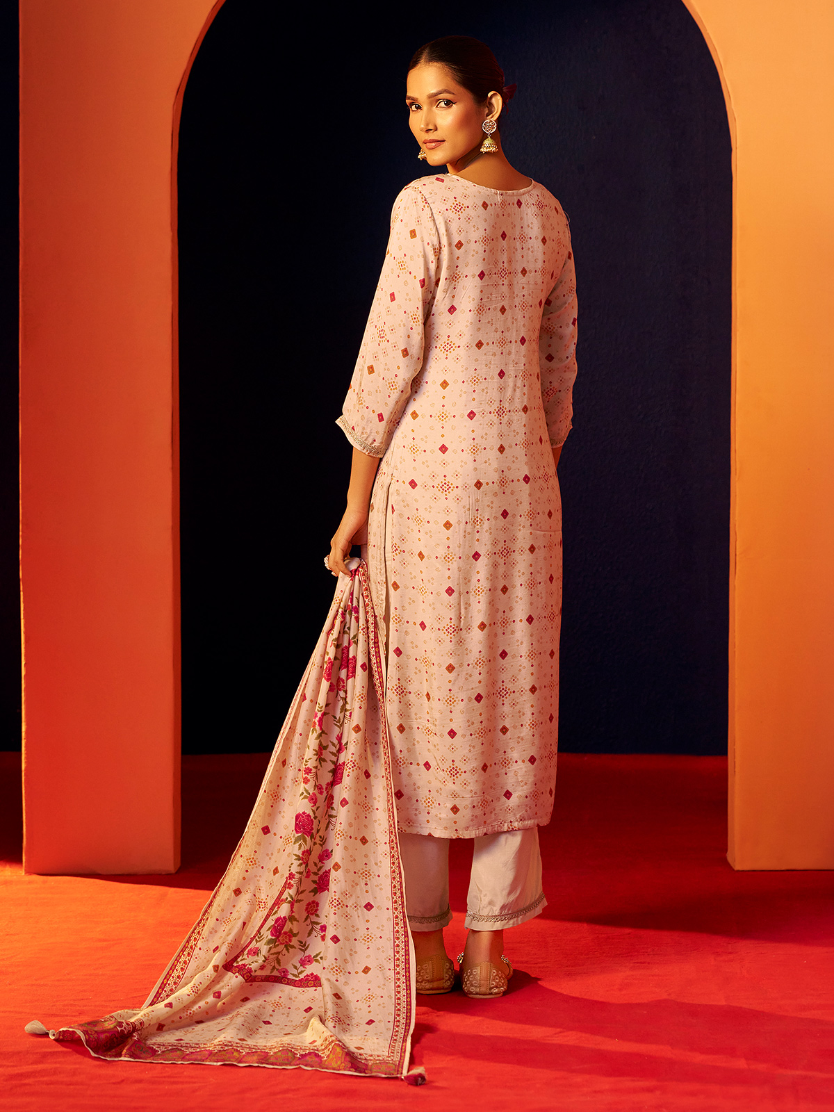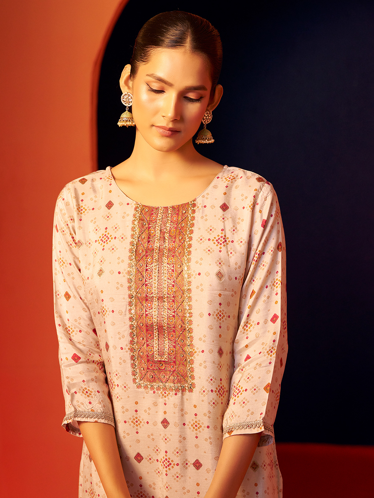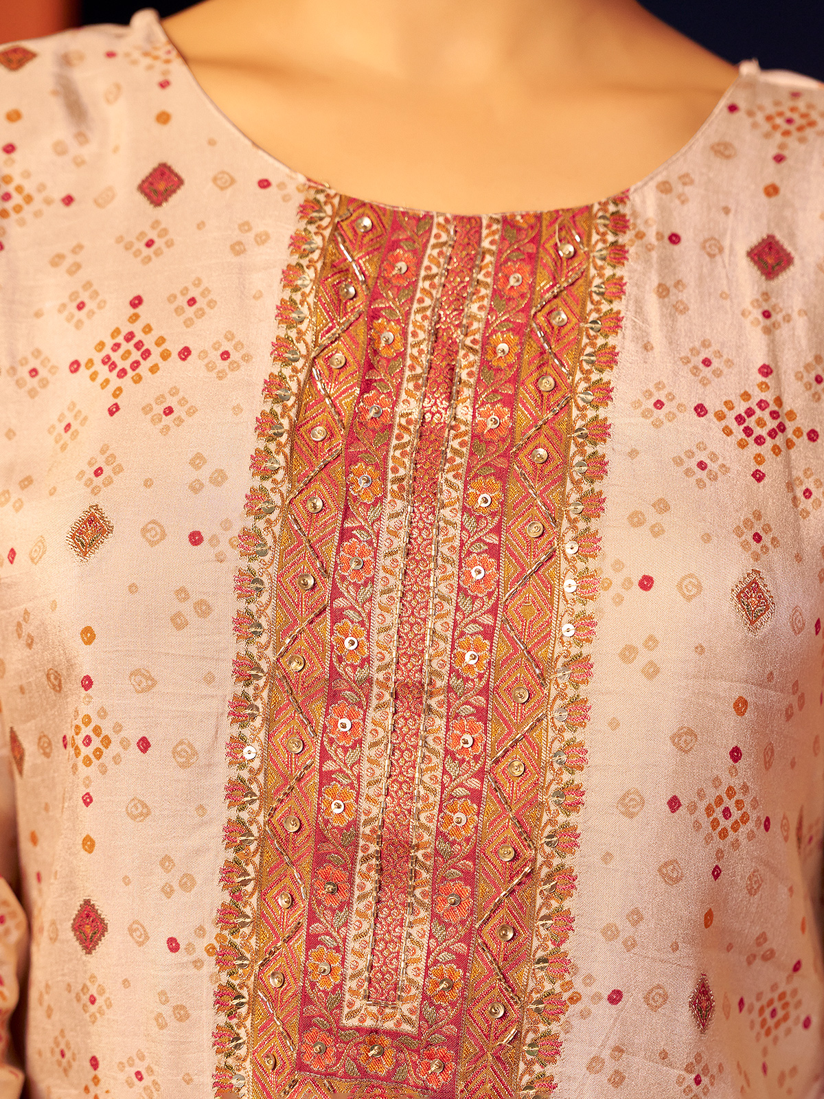 Crafted in cream bandhej silk, this printed kurti set is adorned with cutdana, sequins, and beads. Styled with a round neckline and quarter sleeves, and paired with dupatta and pant, it radiates ethnic vibrancy with understated festive charm.