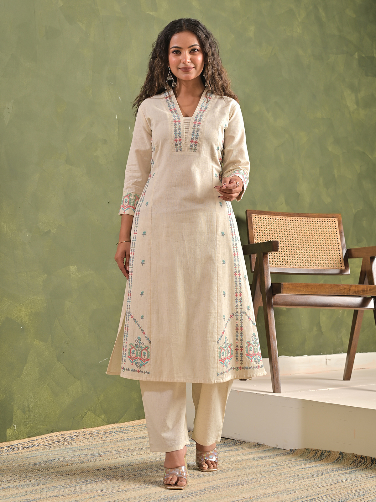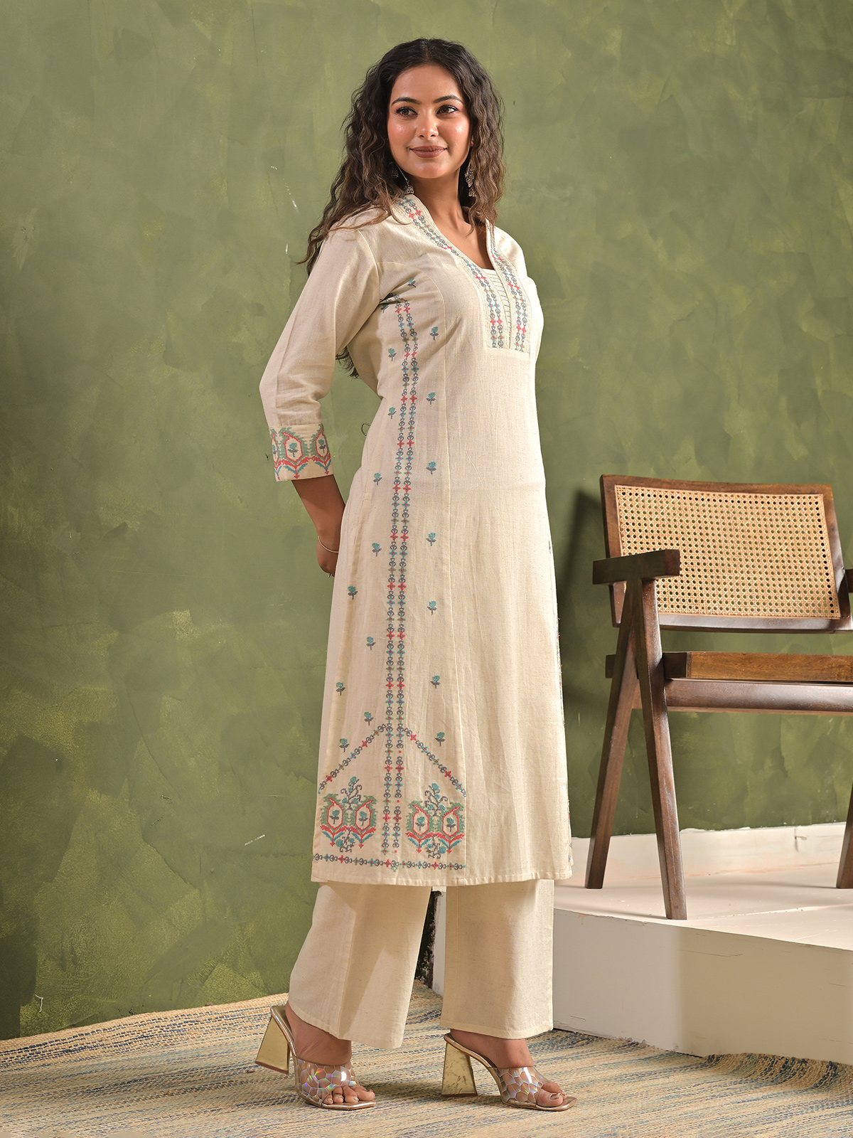 Designed for modern ethnic styling, this cream cotton kurti set highlights detailed digital embroidery for a refined festive statement. The quarter sleeve silhouette paired with tailored pants ensures sleek comfort. Perfect for Eid and celebratory occasions, this lightweight ensemble combines contemporary artistry with traditional elegance beautifully.