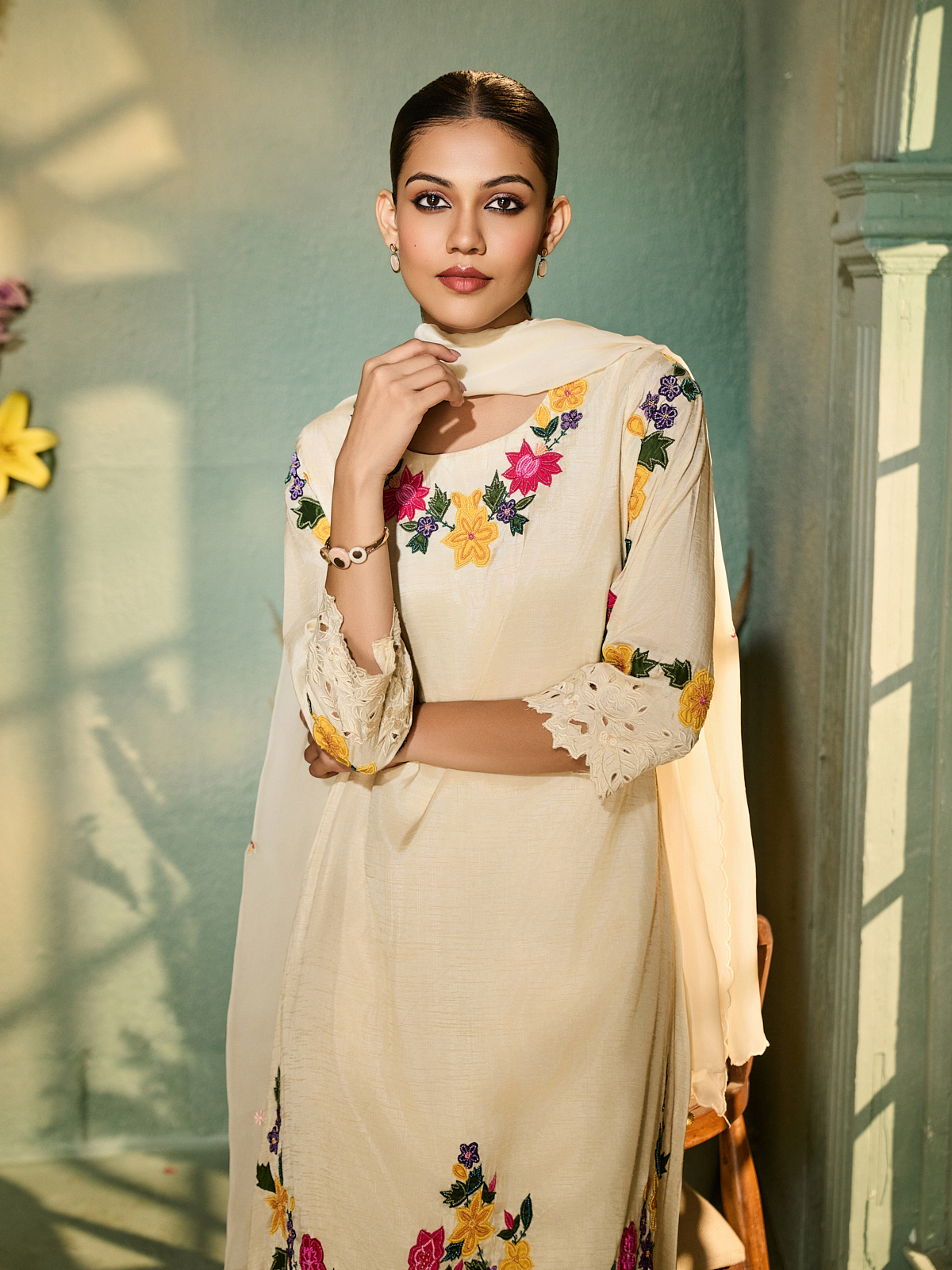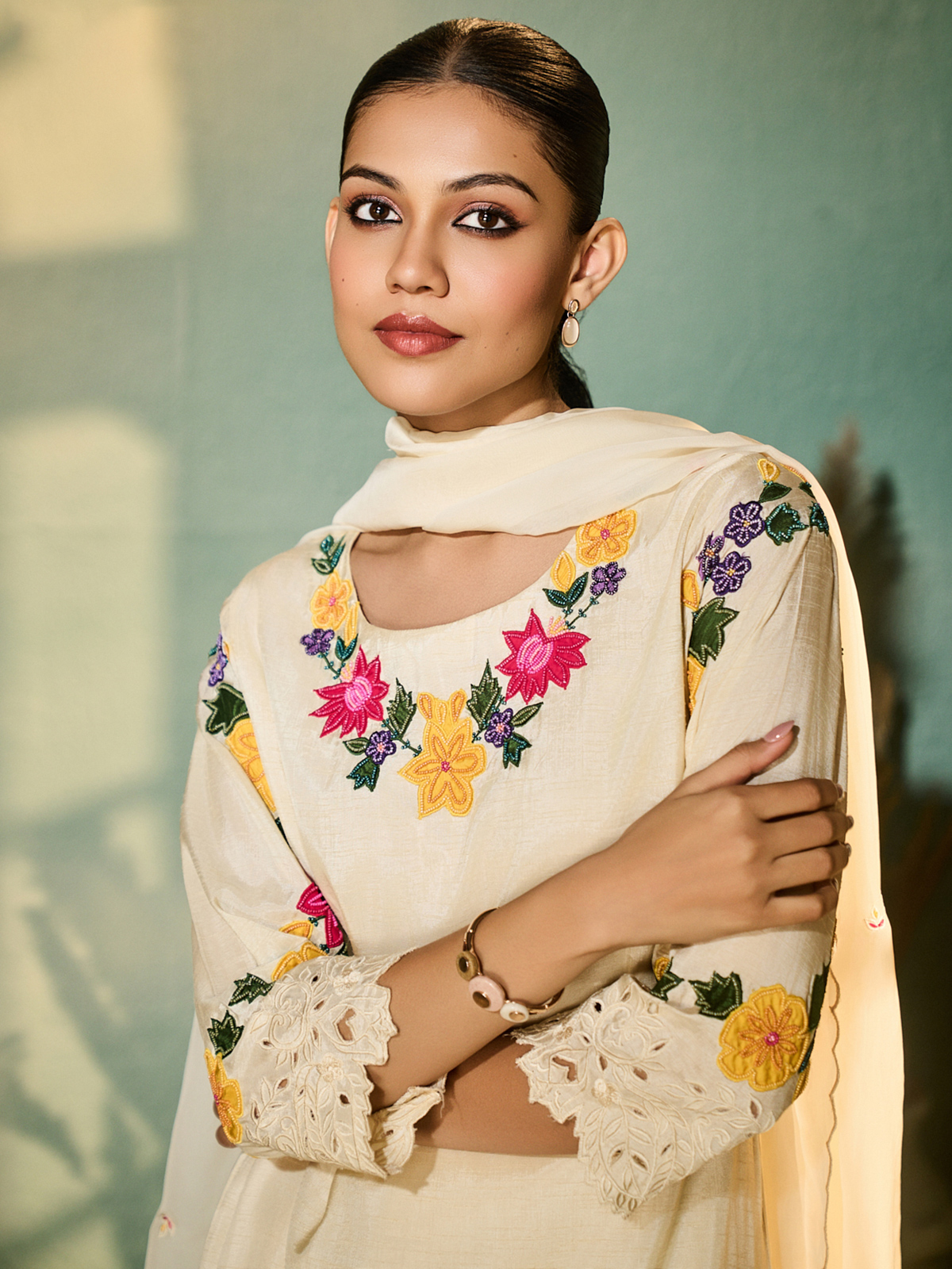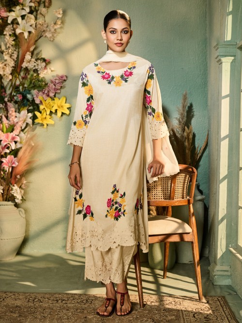 Gentle cream silk drapes in sophistication, detailed with delicate bead and embroidery work that lends soft luminosity. The round neckline and quarter sleeves add timeless form. Paired with pant and dupatta, it carries graceful purity, perfect for serene celebrations.