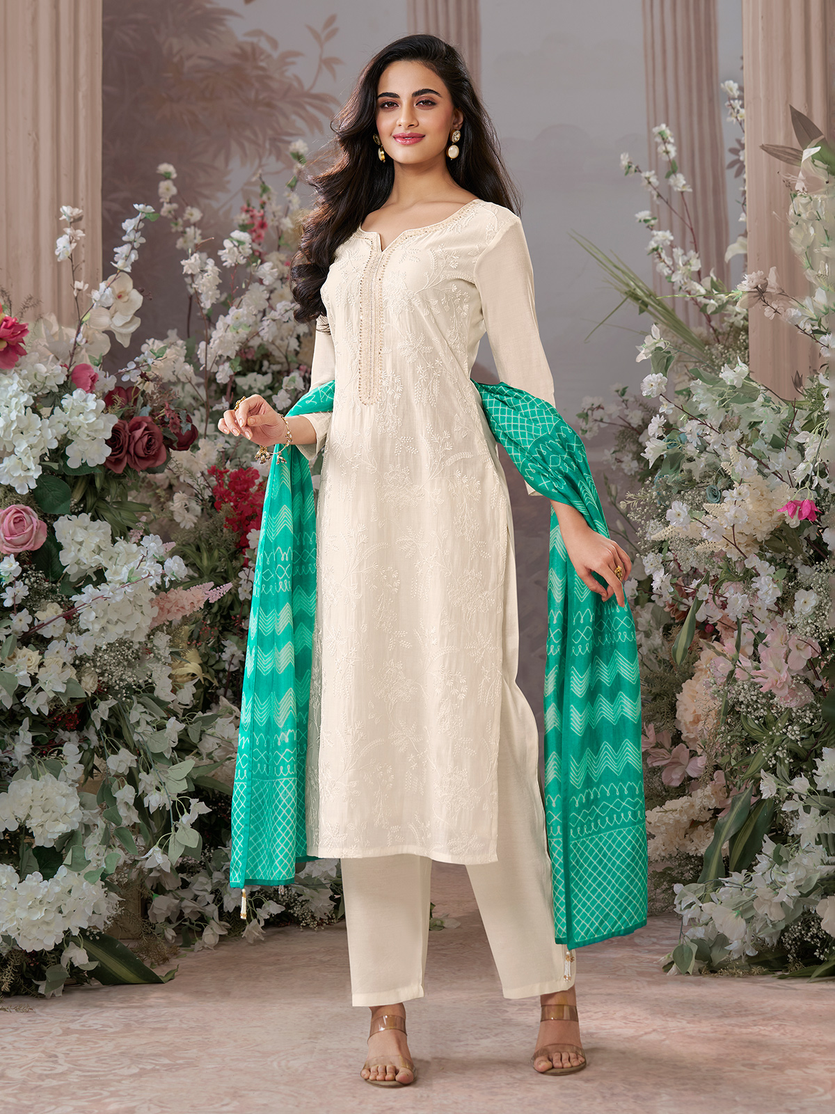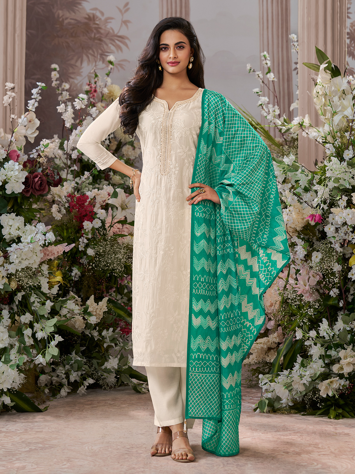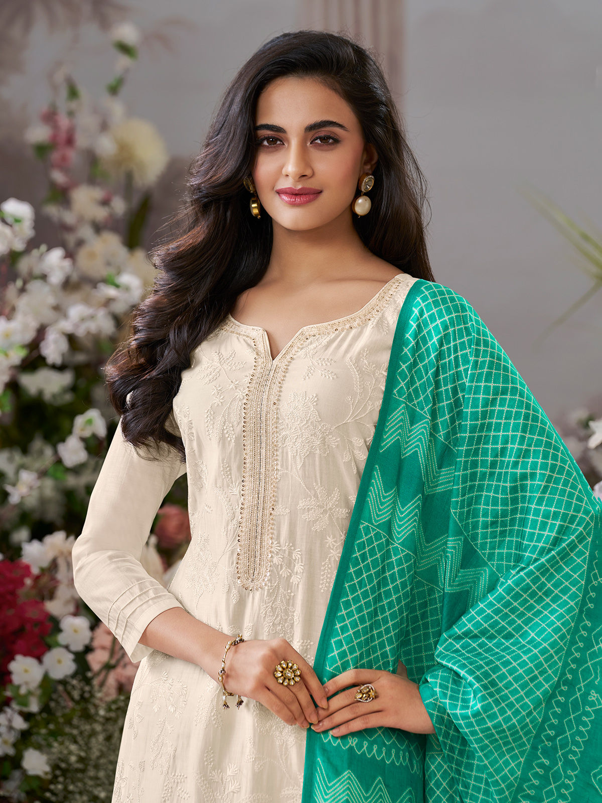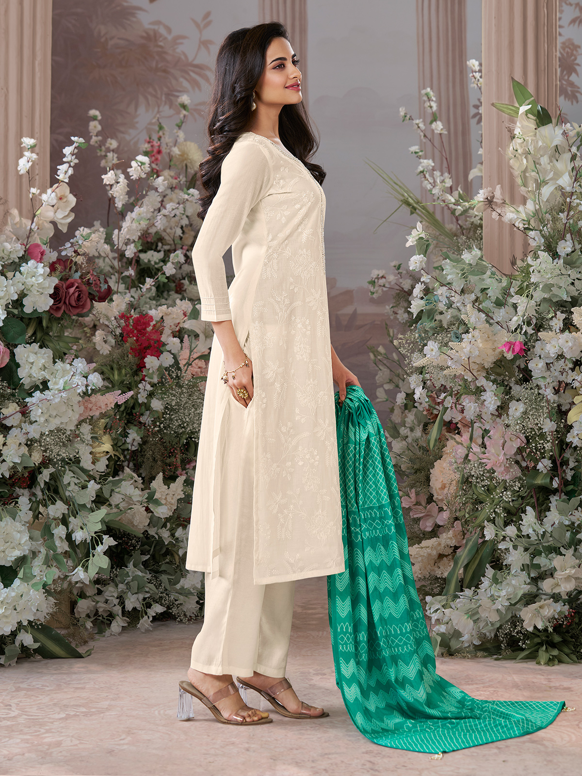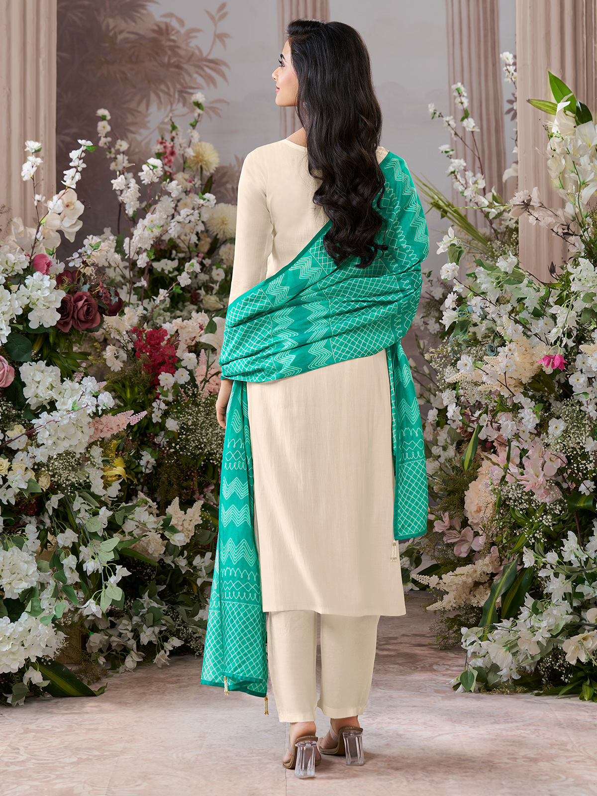 Bring a refreshing touch to your festive look with this cream cotton silk kurti set, adorned with embroidery and sequins. Designed with a sweetheart neckline and quarter sleeves, it is paired with pant and a contrasting green dupatta. A sophisticated outfit that balances elegance with vibrance.
