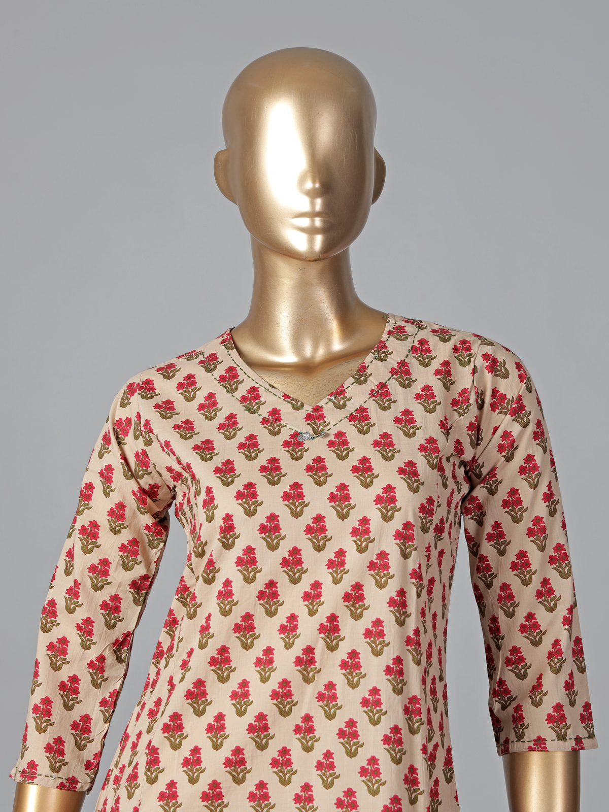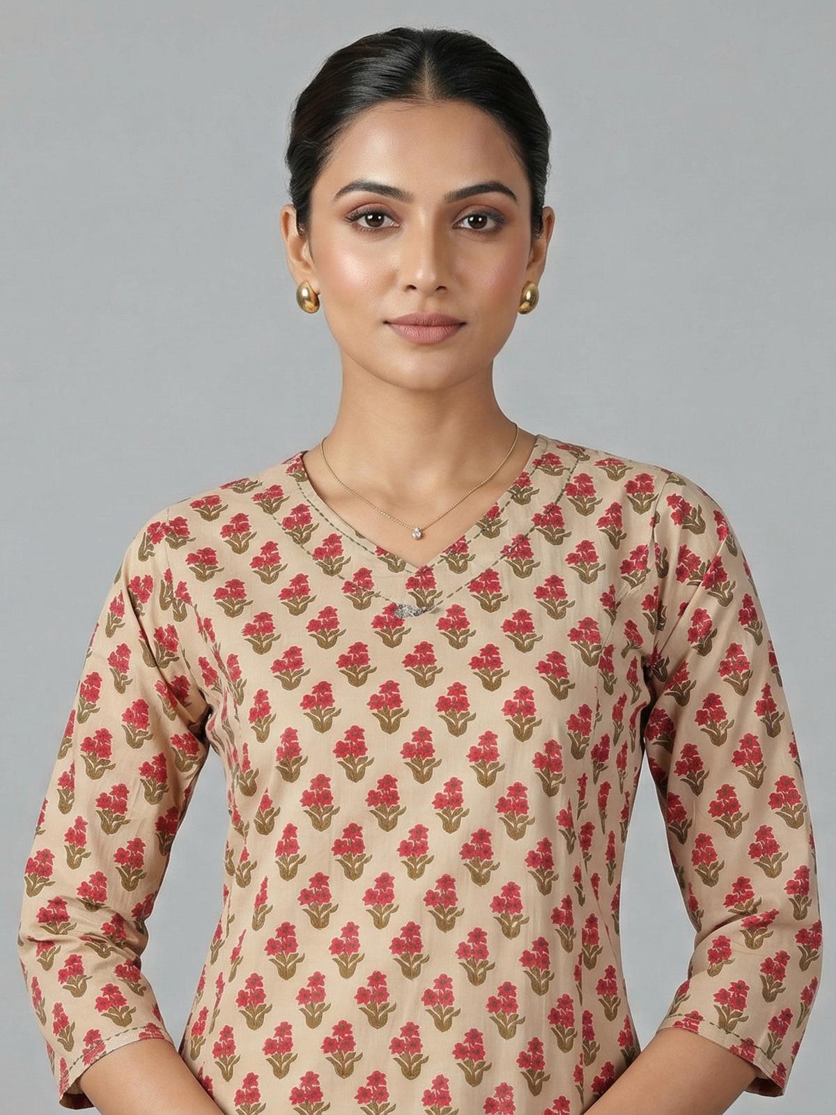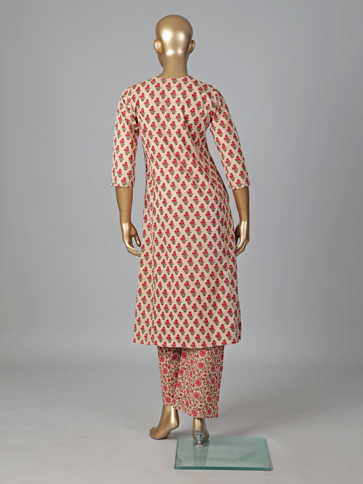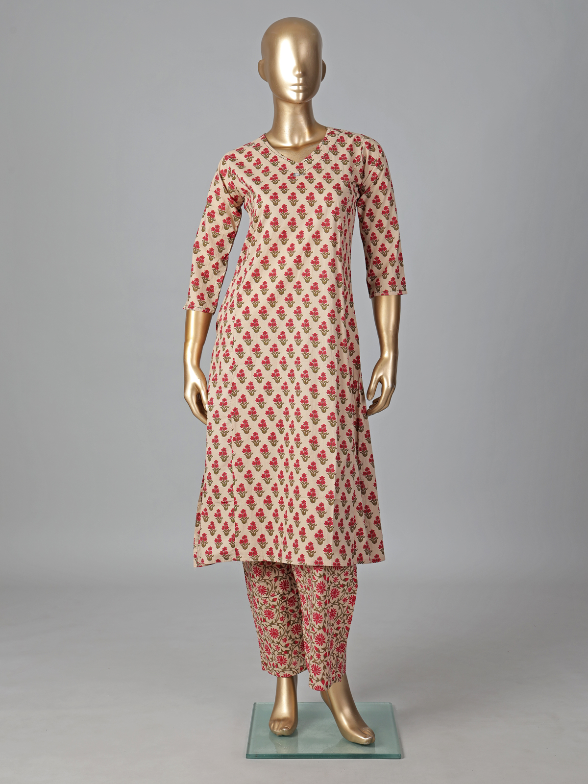 Soft cream hues define this cotton silk kurti set adorned with minimal prints. Featuring a V neckline and quarter sleeves, it offers a relaxed yet elegant look. Paired with pants, it is perfect for everyday styling and casual occasions.