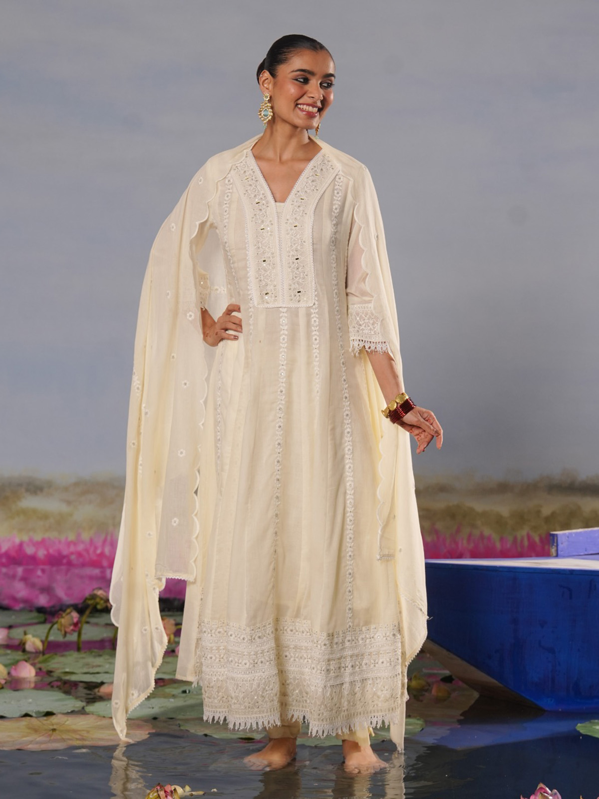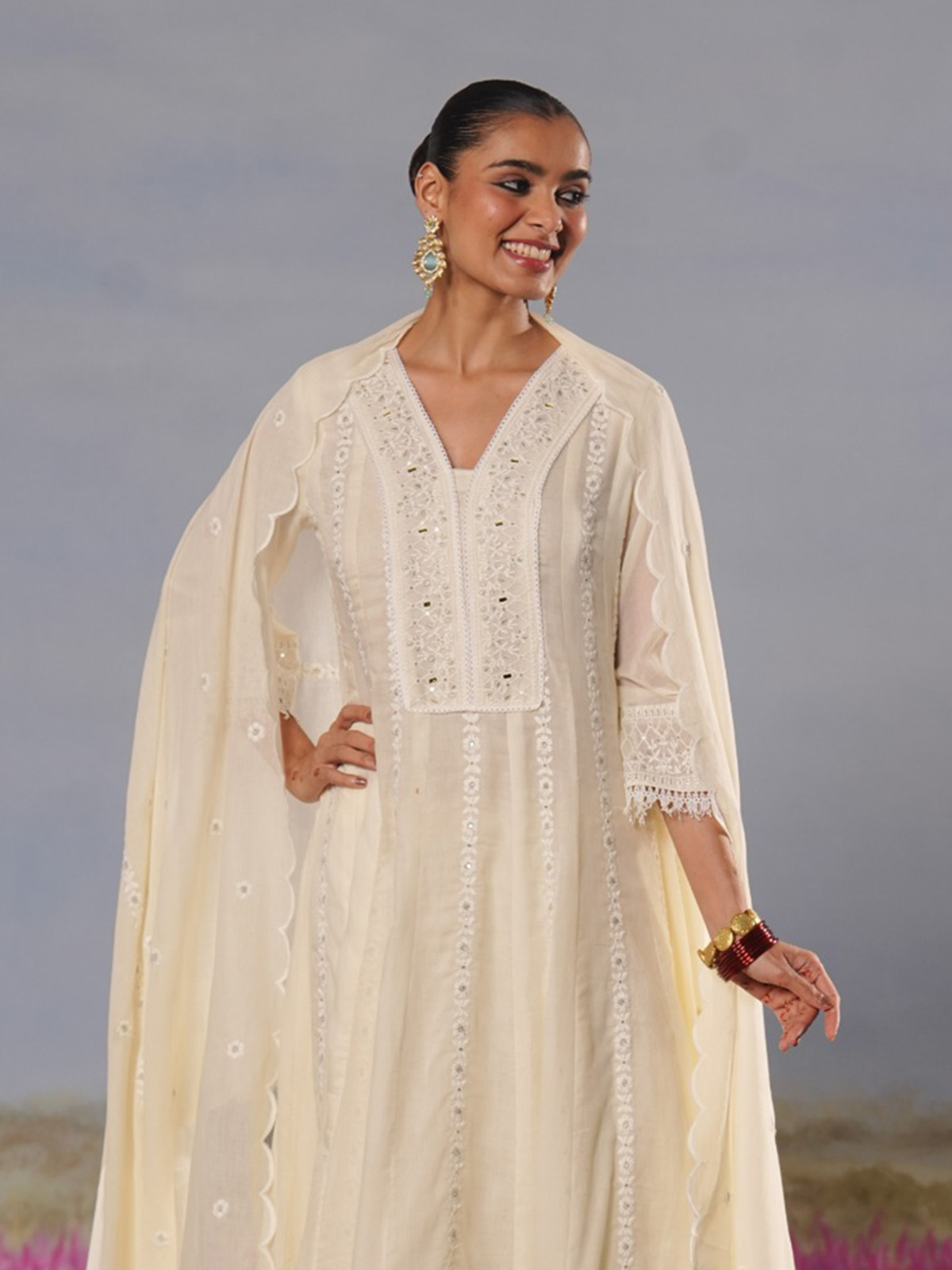 Showcasing timeless elegance, this cream cotton Anarkali kurti set adds a regal festive touch. Styled with a simple neckline and quarter sleeves, it is enhanced with intricate thread, stone and mirror work for a rich finish. Ideal for festive occasions, it is paired with a pant and a coordinated dupatta for a graceful flowing look.
