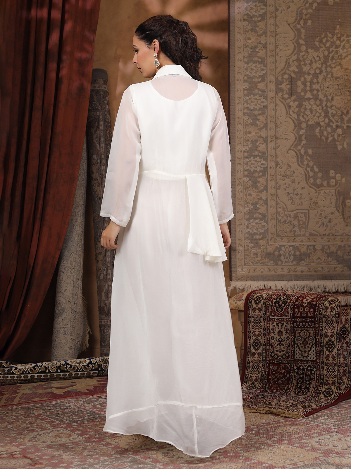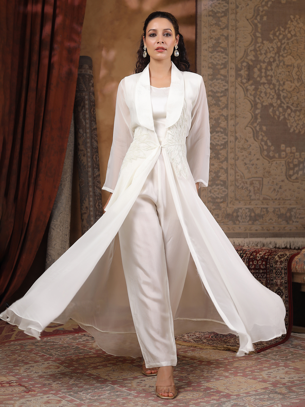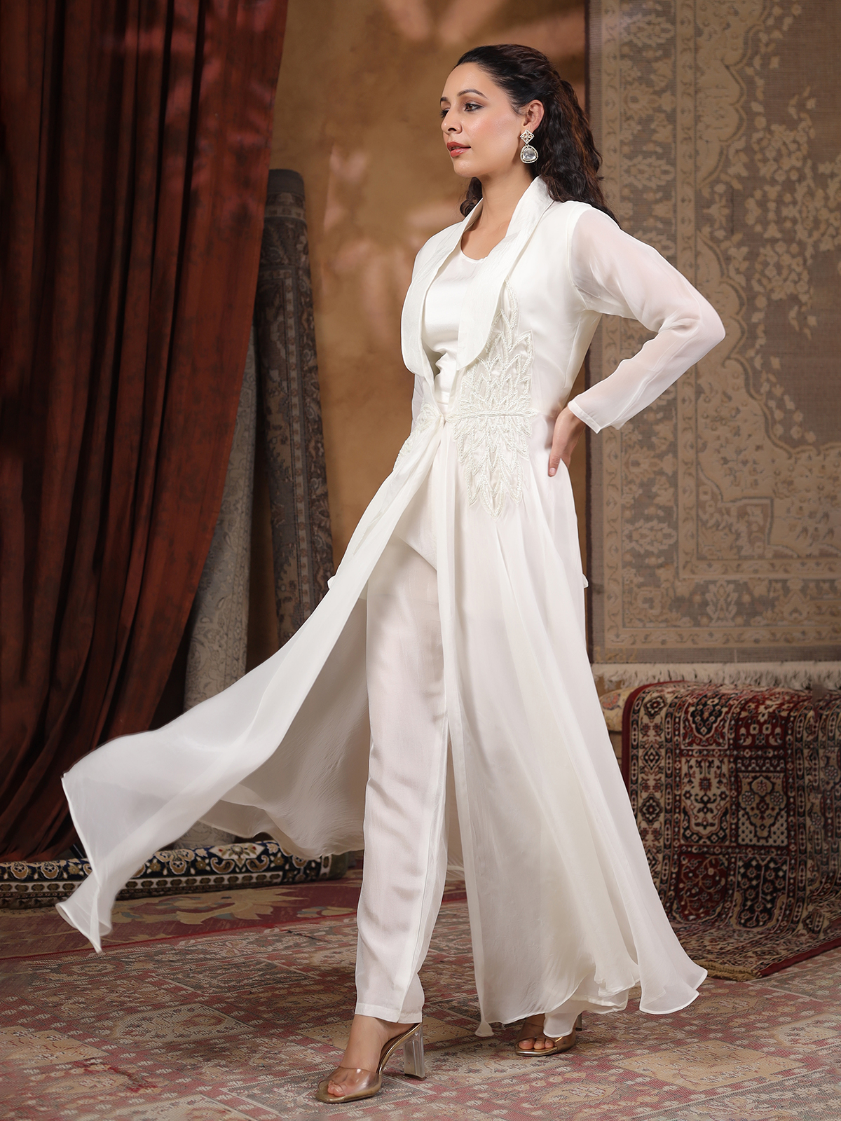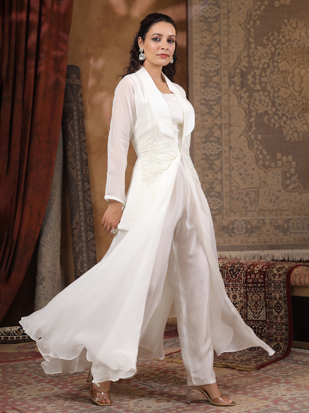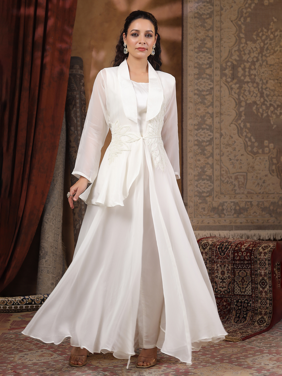 Made from premium georgette, this cream designer kurti set is ideal for stylish and relaxed days. Adorned with cutdana work, the full-sleeved set offers a blend of comfort and elegance for casual occasions.