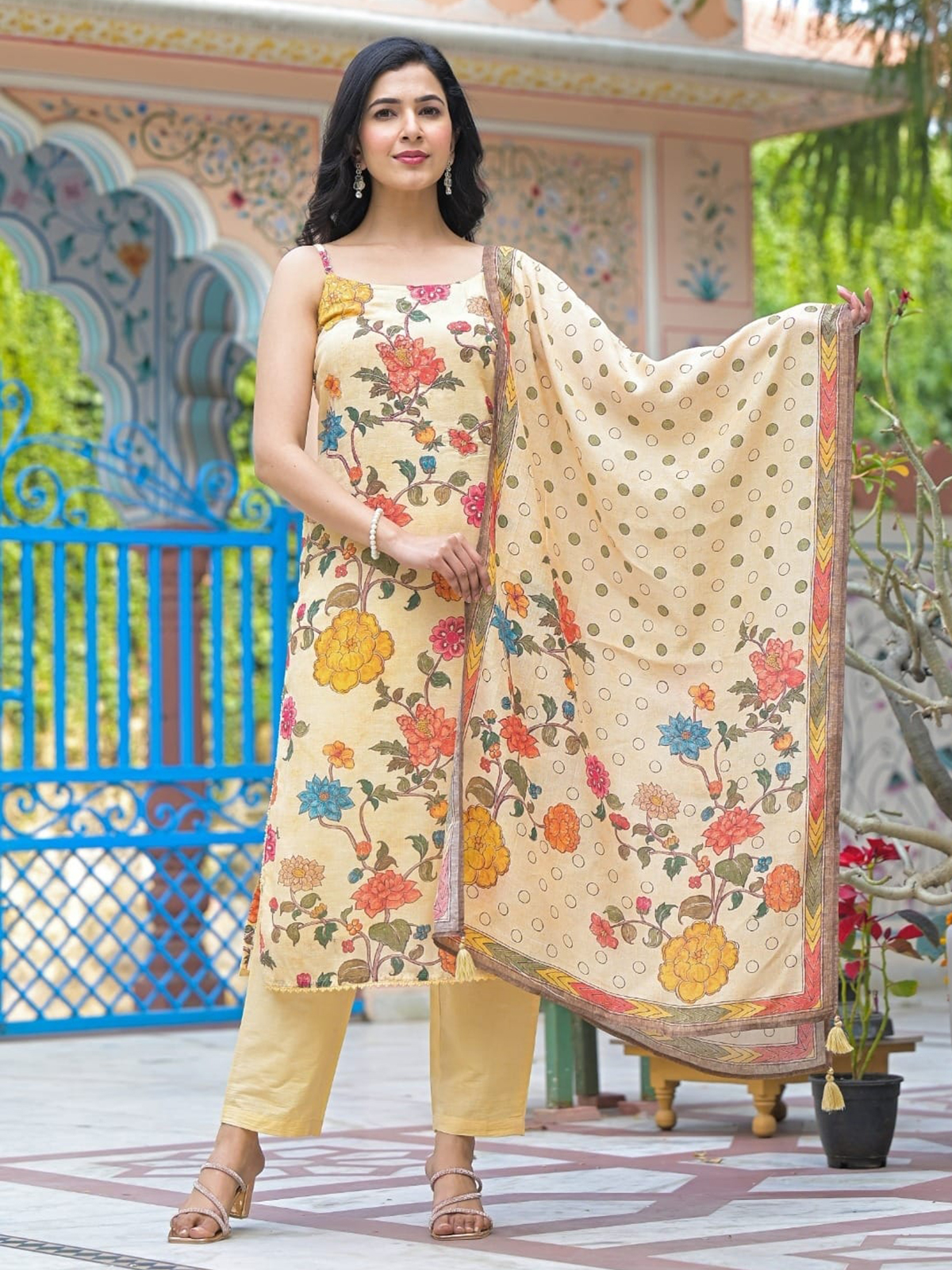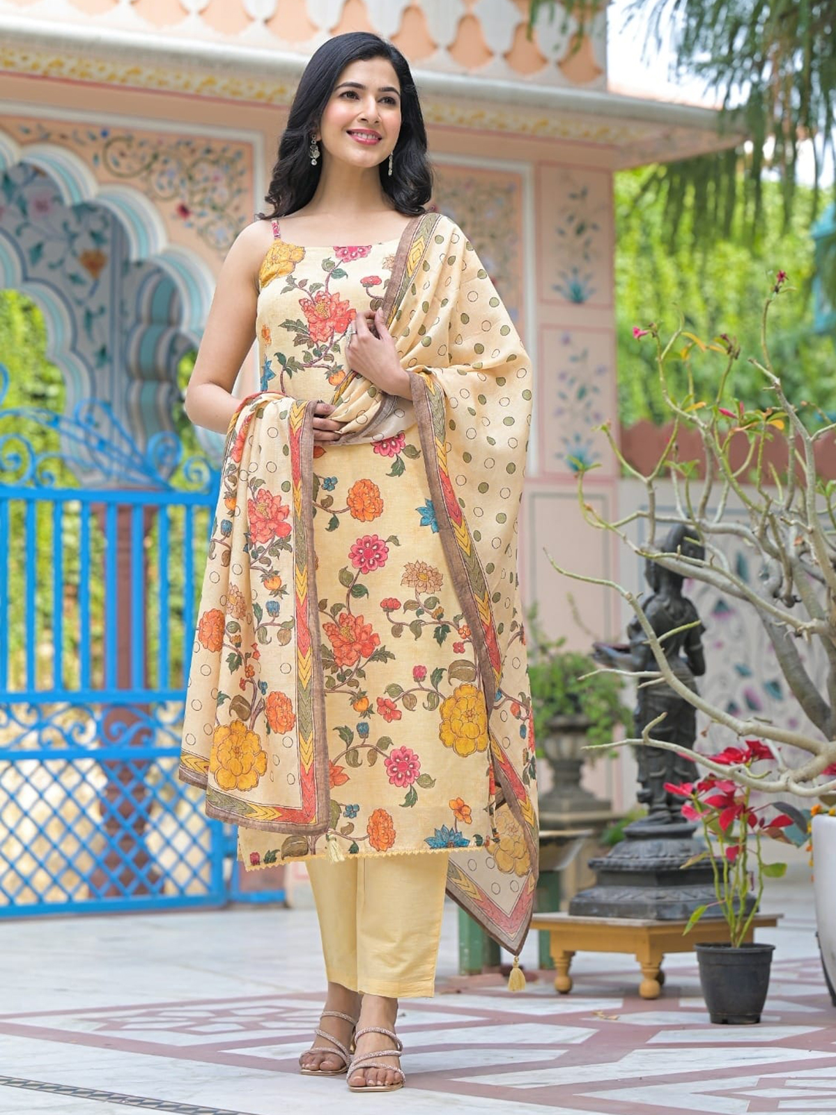 Enhanced with soft floral prints, this cream cotton silk kurti set brings fresh ethnic charm. Featuring a round neckline and sleeveless silhouette, it is paired with a pant and dupatta, making it a breezy choice for festive and casual daytime wear.