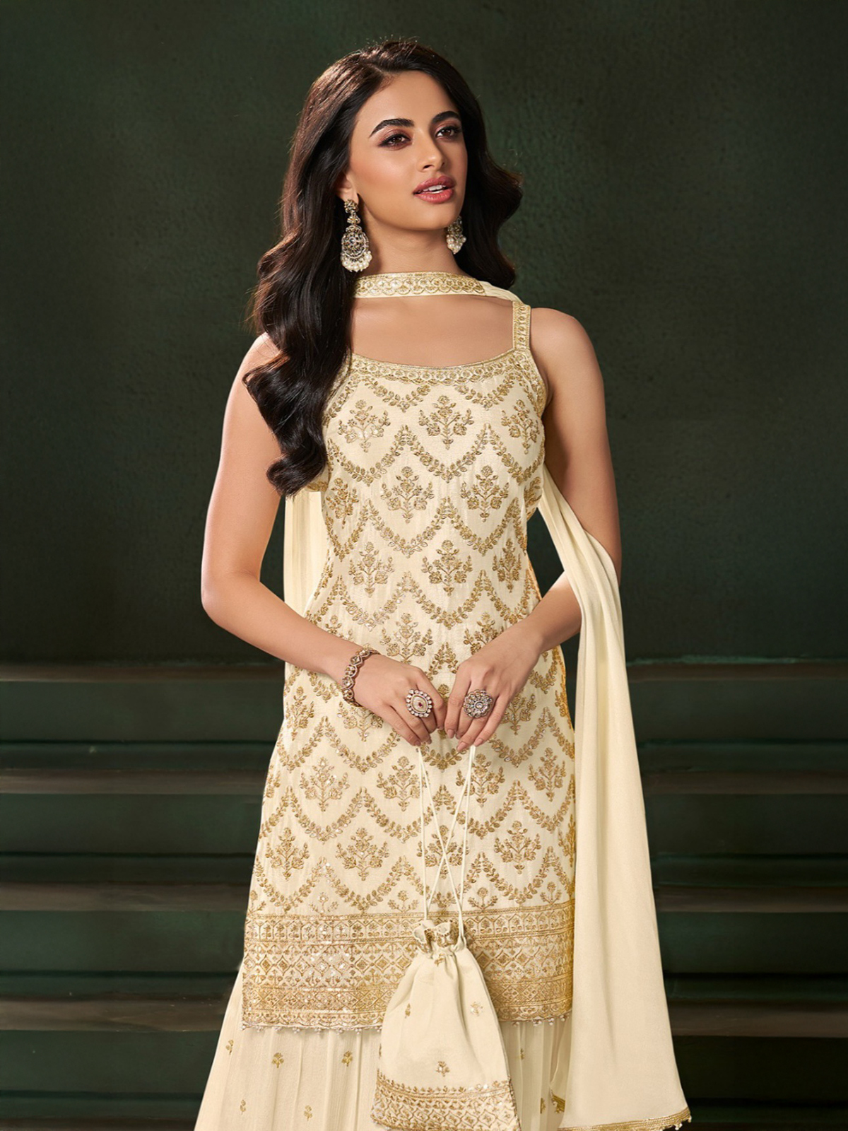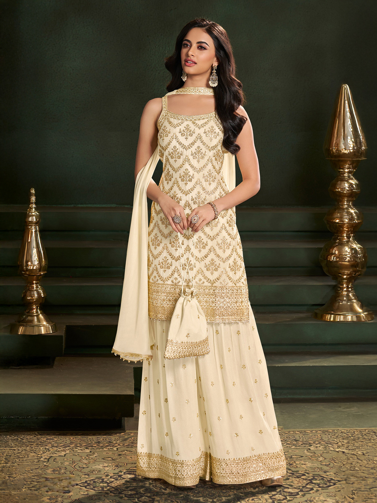 Delicately styled in cream georgette, this sharara kurti set glimmers with embroidery, sequins, and pearl accents. Its sleeveless cut paired with a soft dupatta makes it both elegant and versatile. Ideal for festive and wedding functions, it offers understated sophistication with just the right touch of sparkle.