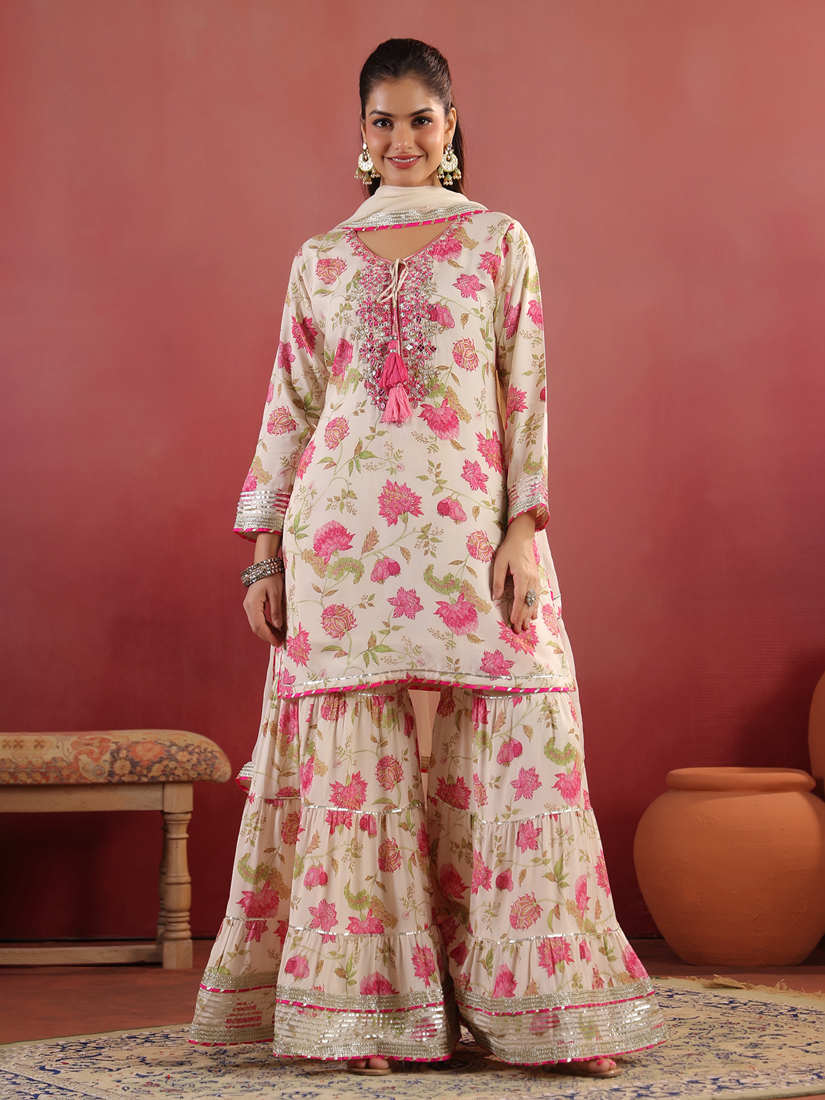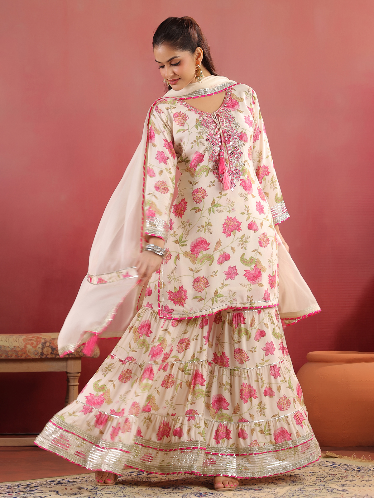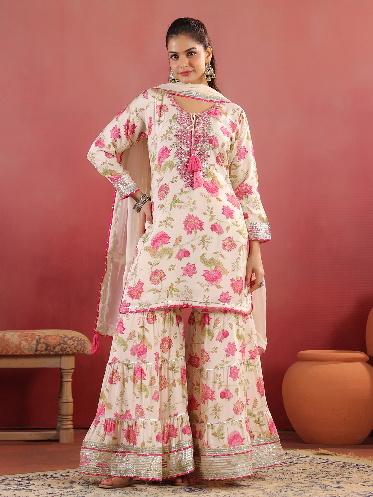 Cream cotton silk kurti set featuring mirror, thread, beads, gota and zardosi work over a printed surface. Styled with a keyhole neckline and quarter sleeves, it is paired with a flared sharara and dupatta, ideal for festive wear.