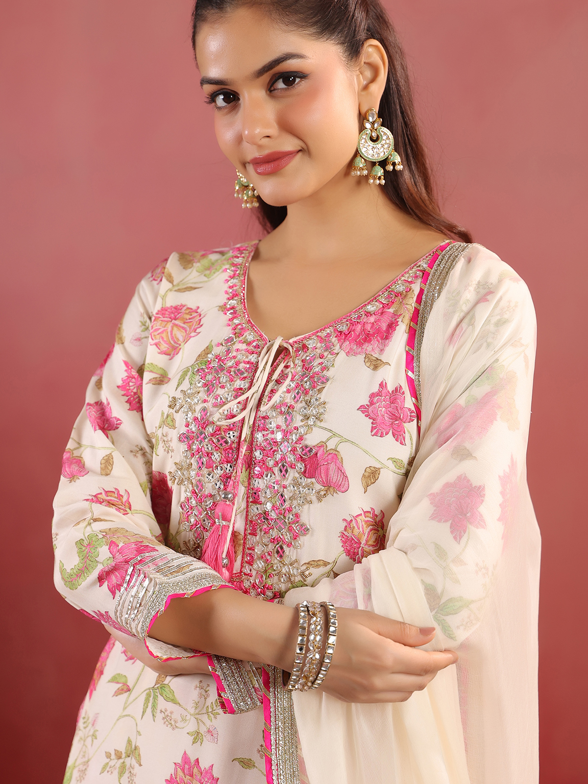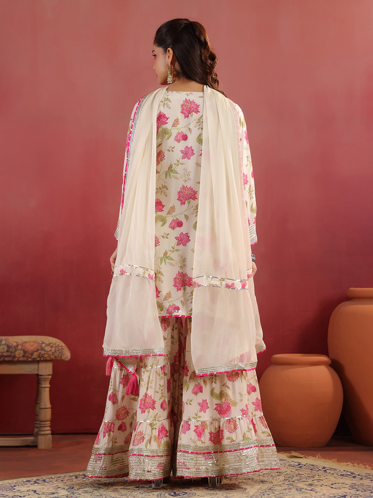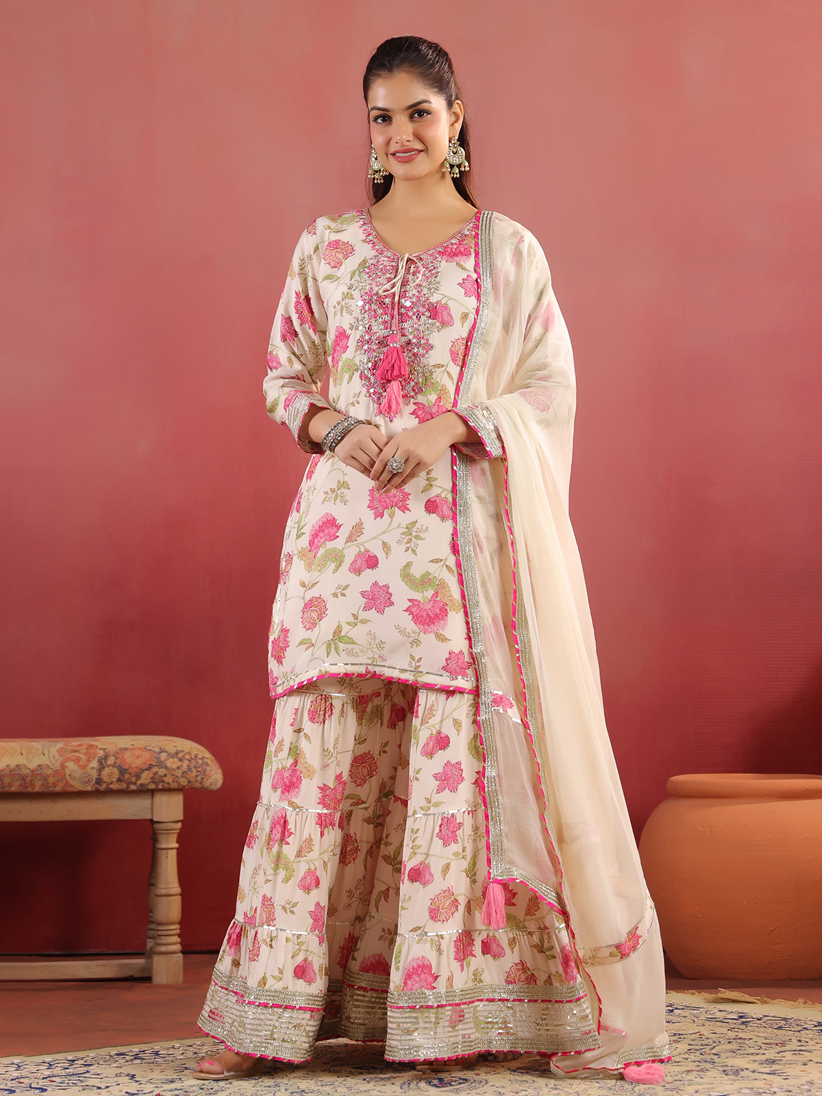 Cream cotton silk kurti set featuring mirror, thread, beads, gota and zardosi work over a printed surface. Styled with a keyhole neckline and quarter sleeves, it is paired with a flared sharara and dupatta, ideal for festive wear.