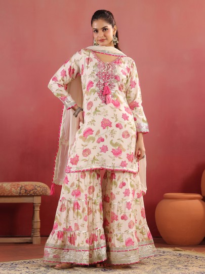Cream Printed Cotton Silk Sharara Kurti Set