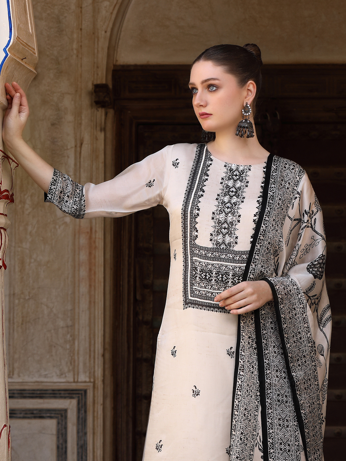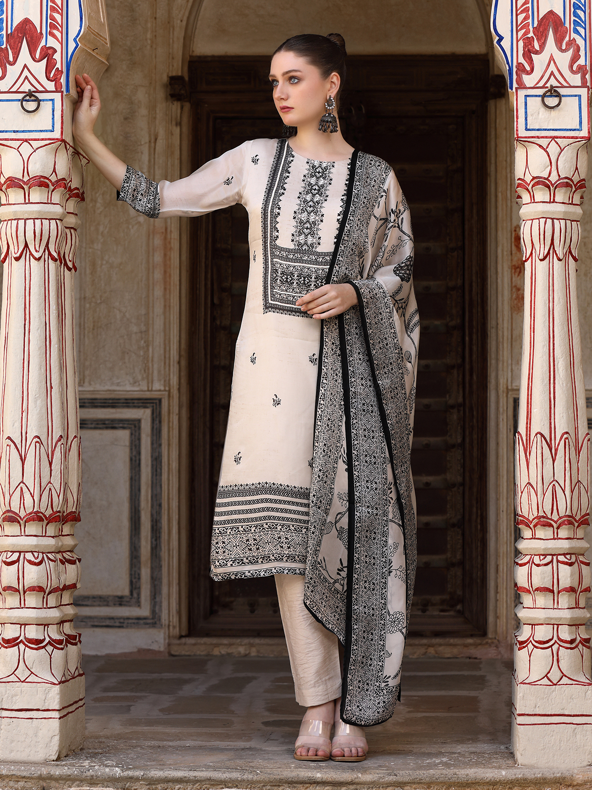 This cream silk kurti set is adorned with intricate cutdana, sequins, and beads work, perfectly complemented by sophisticated printed designs. The round neck and quarter sleeves offer a blend of comfort and style, making it suitable for any occasion.