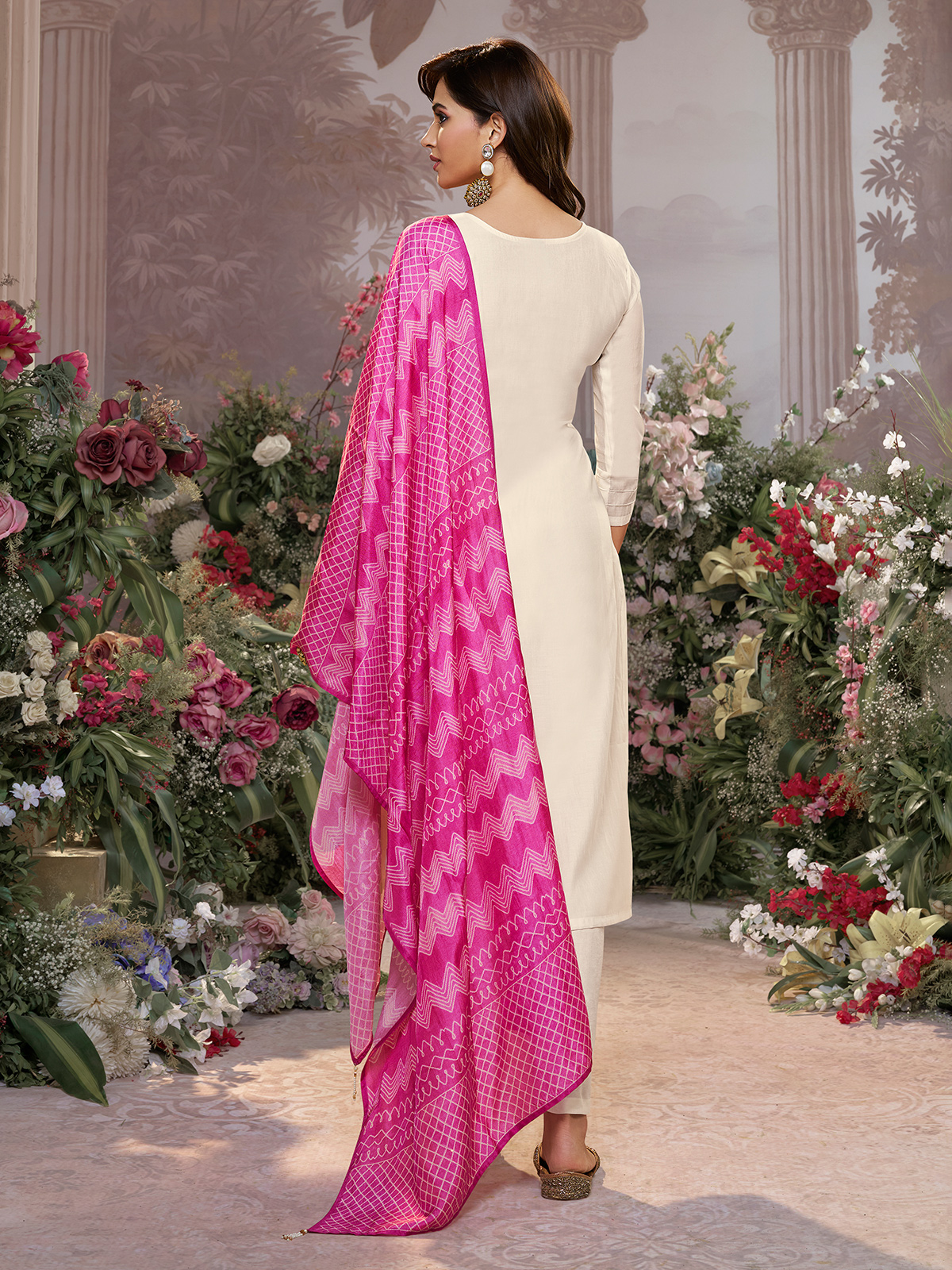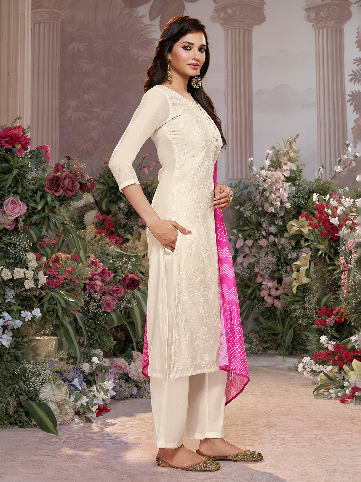 Cream Silk Embroidered Kurti Set With Pink Dupatta