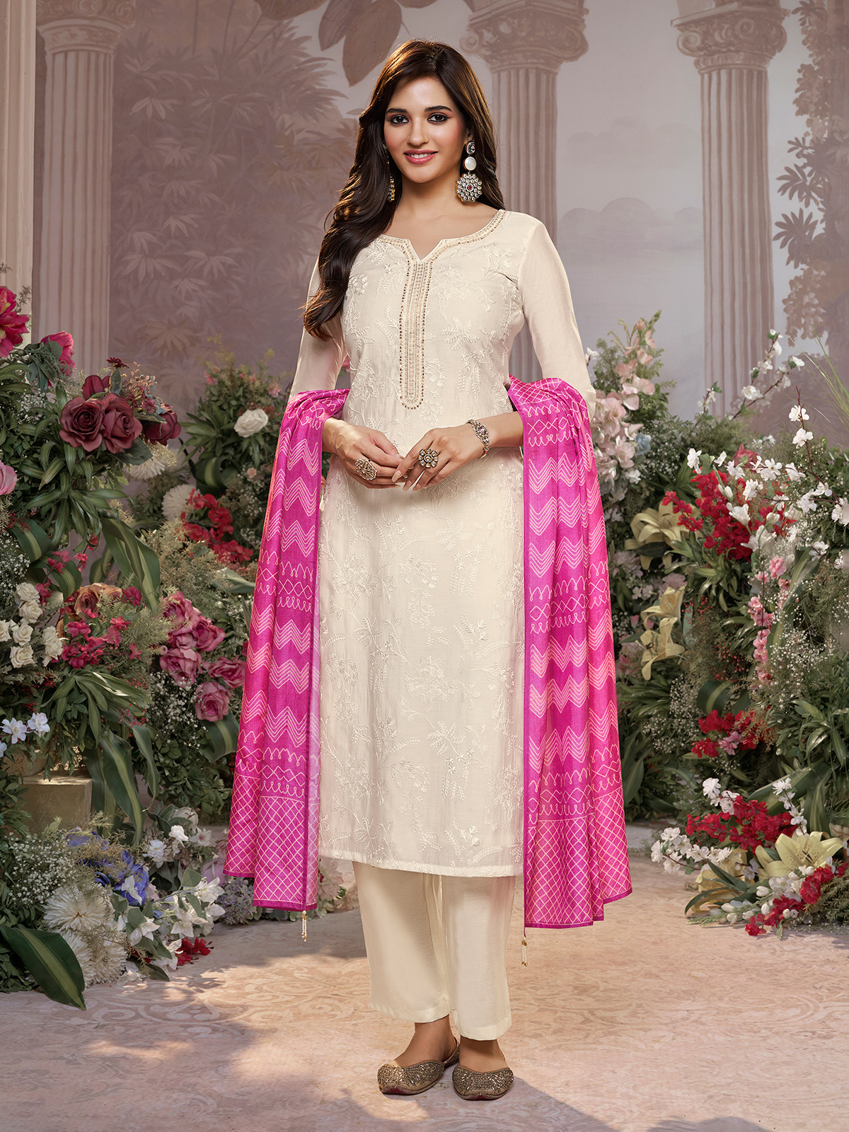 Drape yourself in festive charm with this cream cotton silk kurti set, exquisitely detailed with embroidery and sequins. Styled with a sweetheart neckline and quarter sleeves, it comes with pant and a lively pink dupatta. A radiant ensemble that blends traditional beauty with graceful celebration.