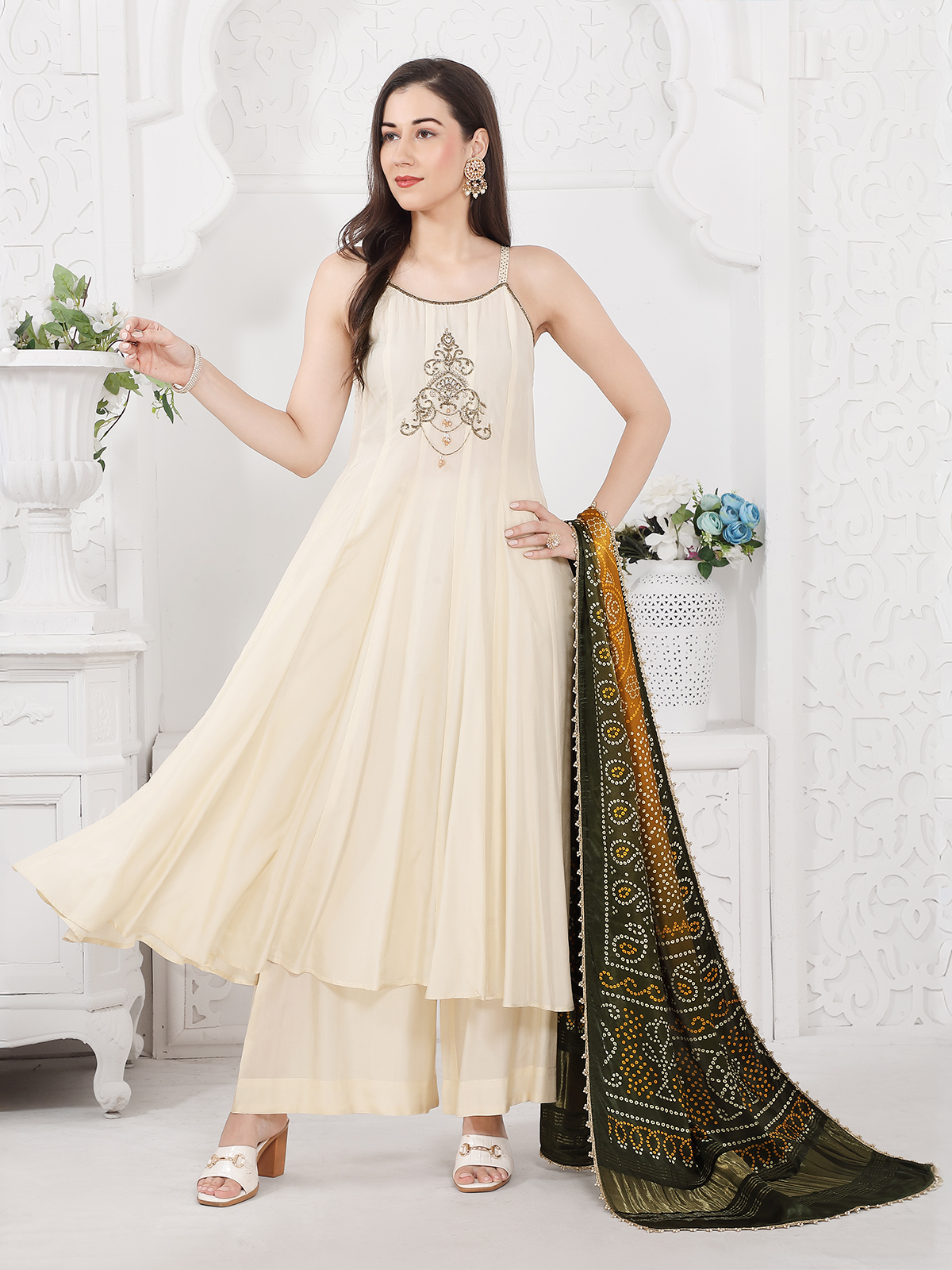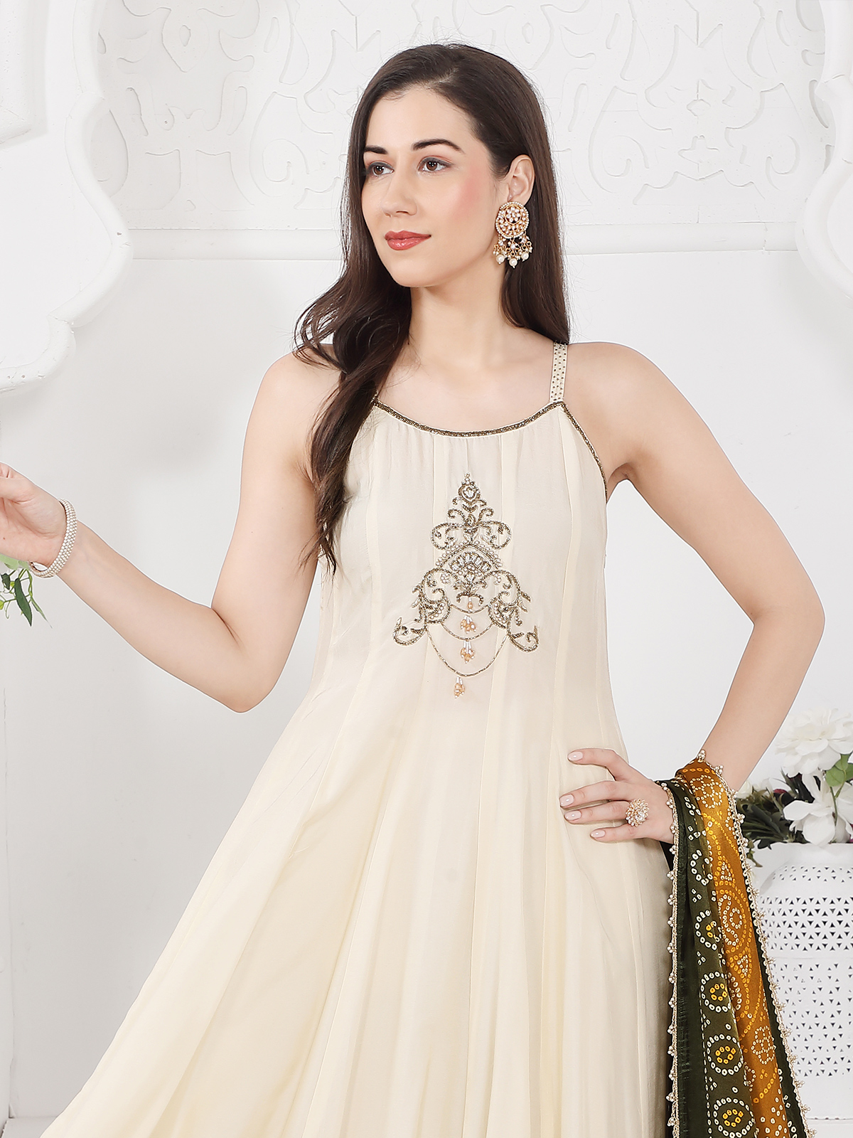 Soft cream silk brings delicate beauty to this enchanting festive kurti set. Sparkling with cutdana, beads, and sequins around the round neckline and quarter sleeves, it radiates quiet refinement. Teamed with pants and a printed dupatta, the ensemble balances serene charm and intricate artistry, perfect for treasured festive moments.