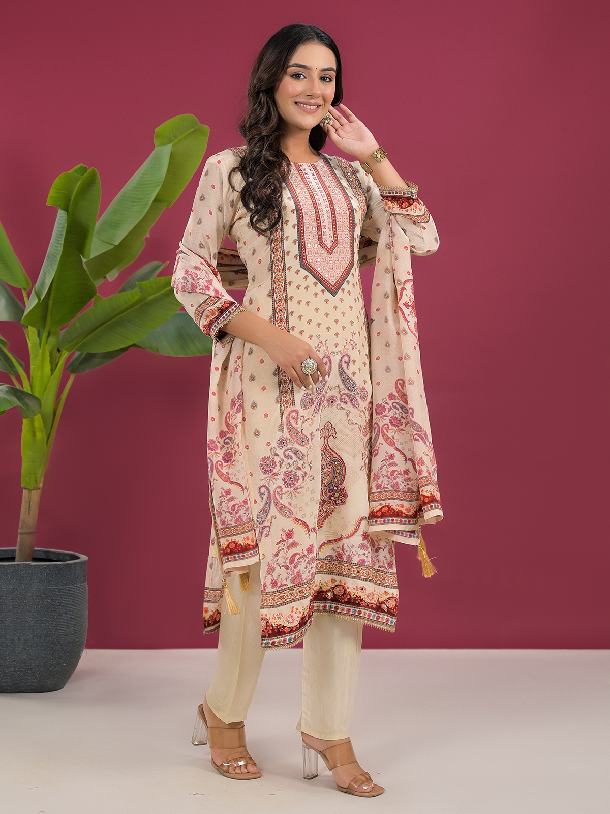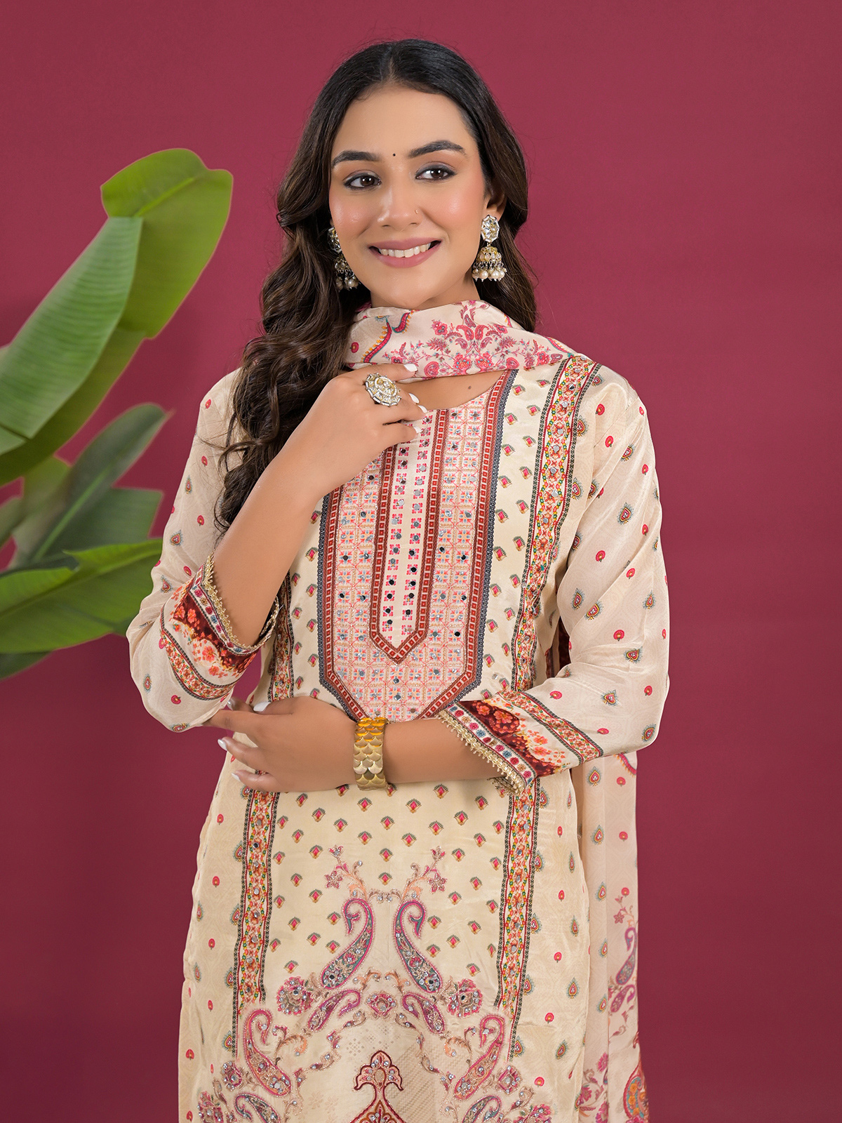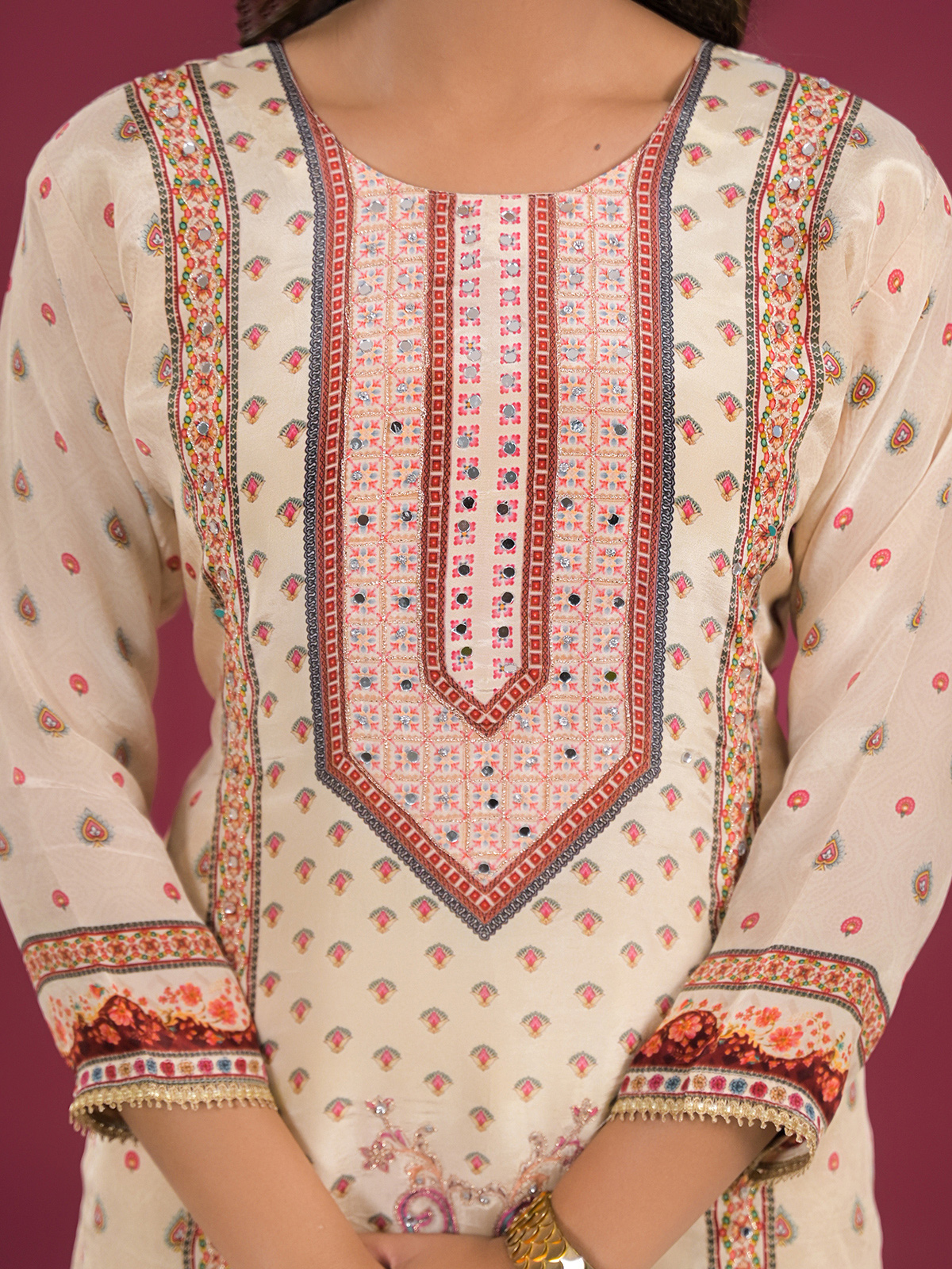 Graceful cream silk printed kurti set accented with cutdana, sequins, mirror and stone embellishments. Featuring a classic round neckline and quarter sleeves, this festive ensemble comes with a coordinated pant and dupatta, ideal for family functions and cultural occasions.
