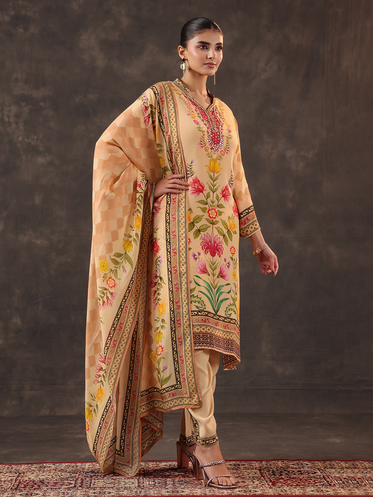 Soft elegance radiates from this cream viscose crepe kurti set crafted for graceful occasions. The printed kurti features a collar neckline with quarter sleeves, beautifully decorated with thread, mirror, sequins and bead embellishments. Paired with comfortable pants and a delicate dupatta, the ensemble forms a refined festive look for casual gatherings.