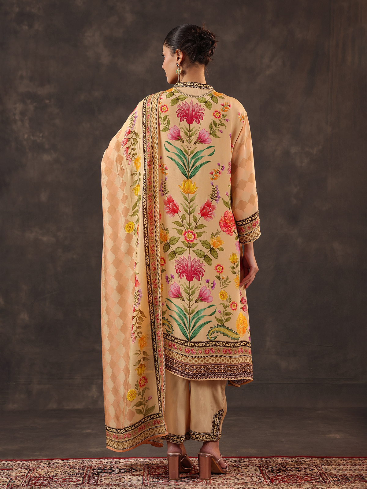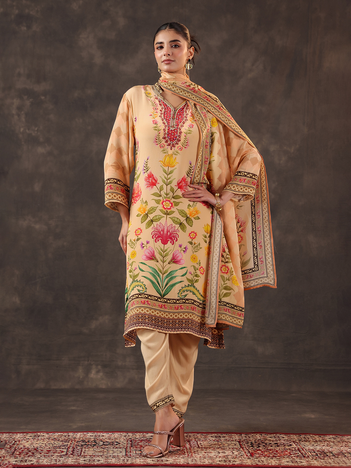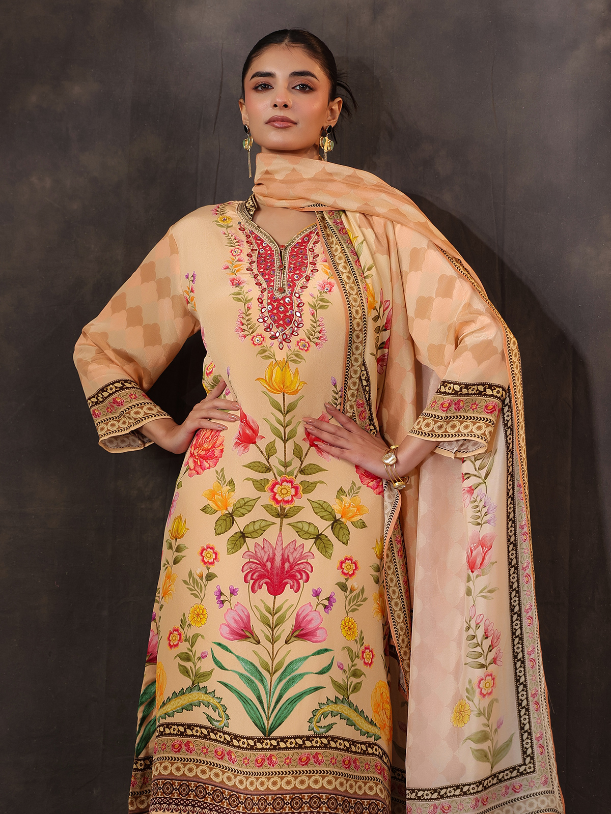Cream Viscose Crepe Printed Kurti Set With Dupatta